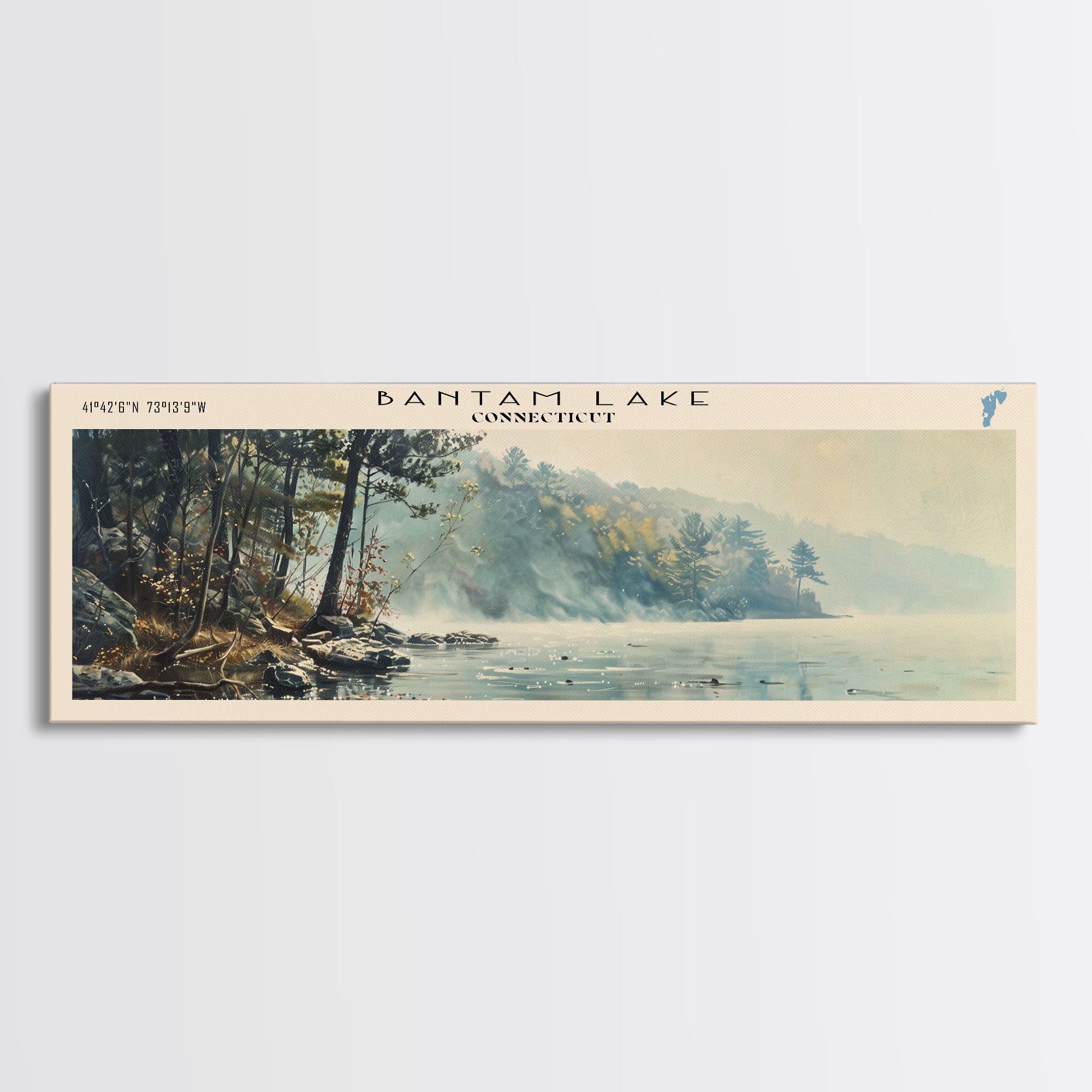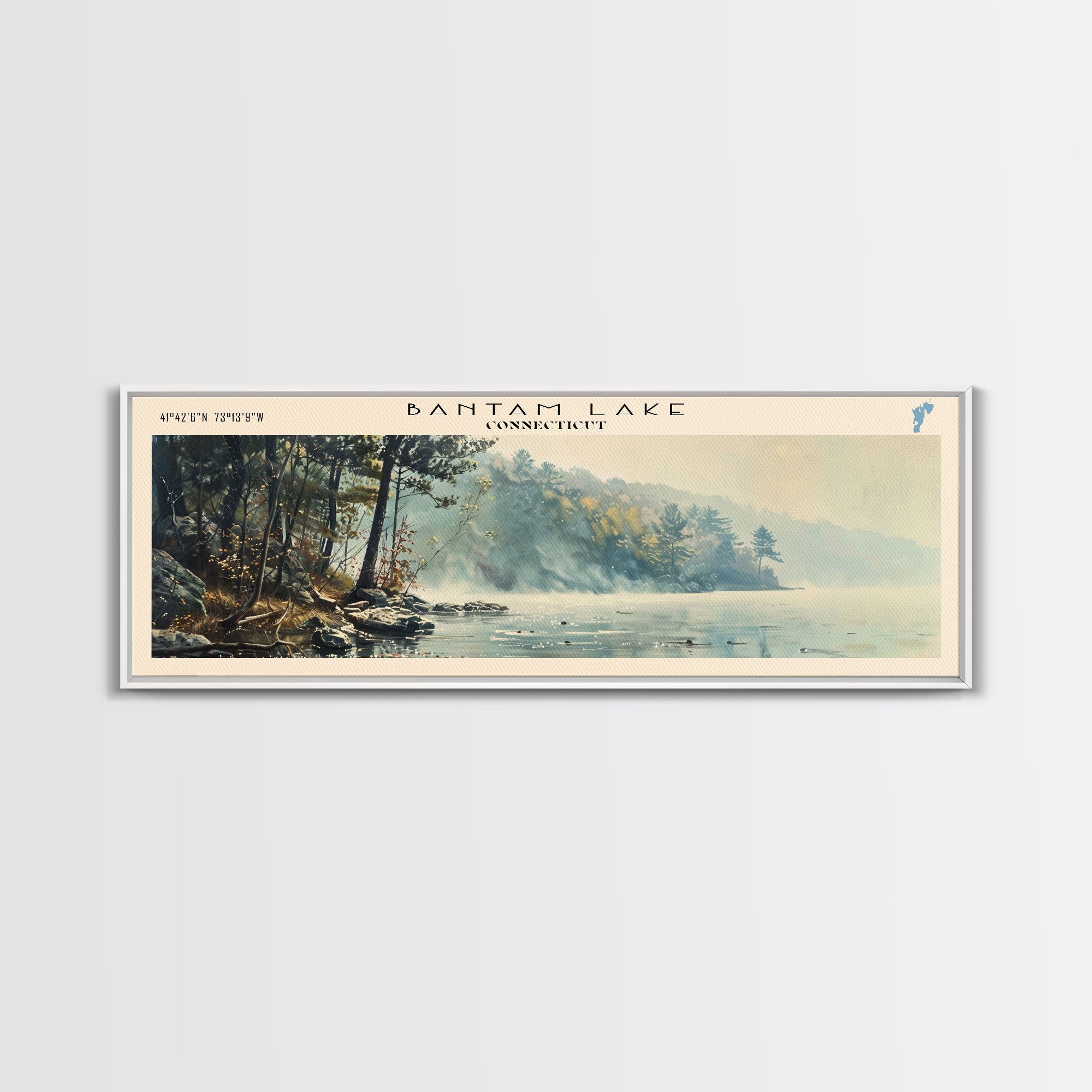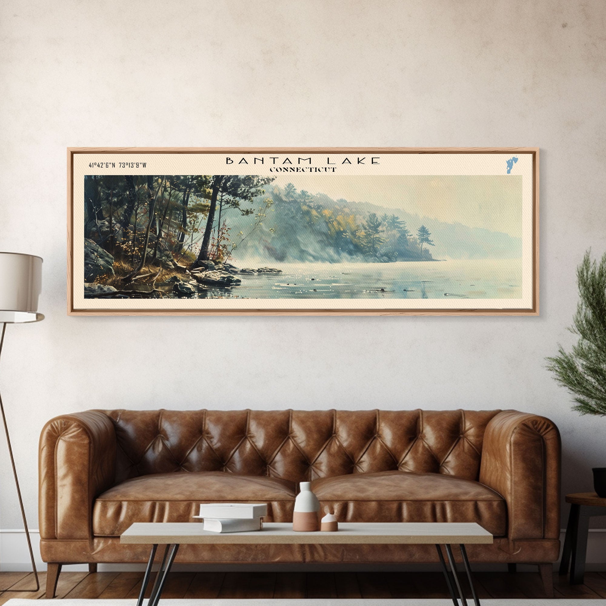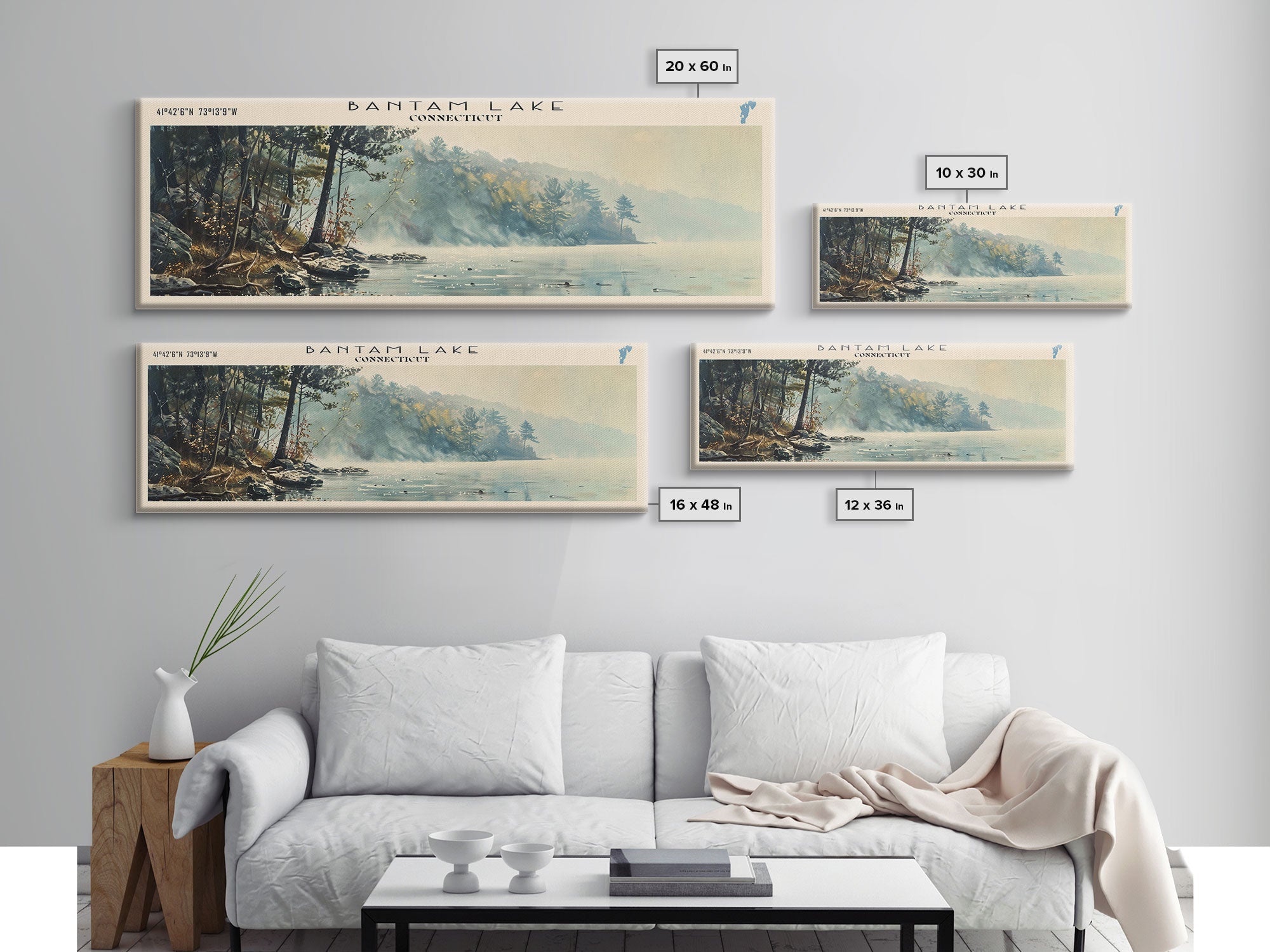 Bantam Lake Connecticut Lake House Art, Framed Canvas Print, Panoramic Travel Poster, Scenic View, Modern Decor, Water Reflection
