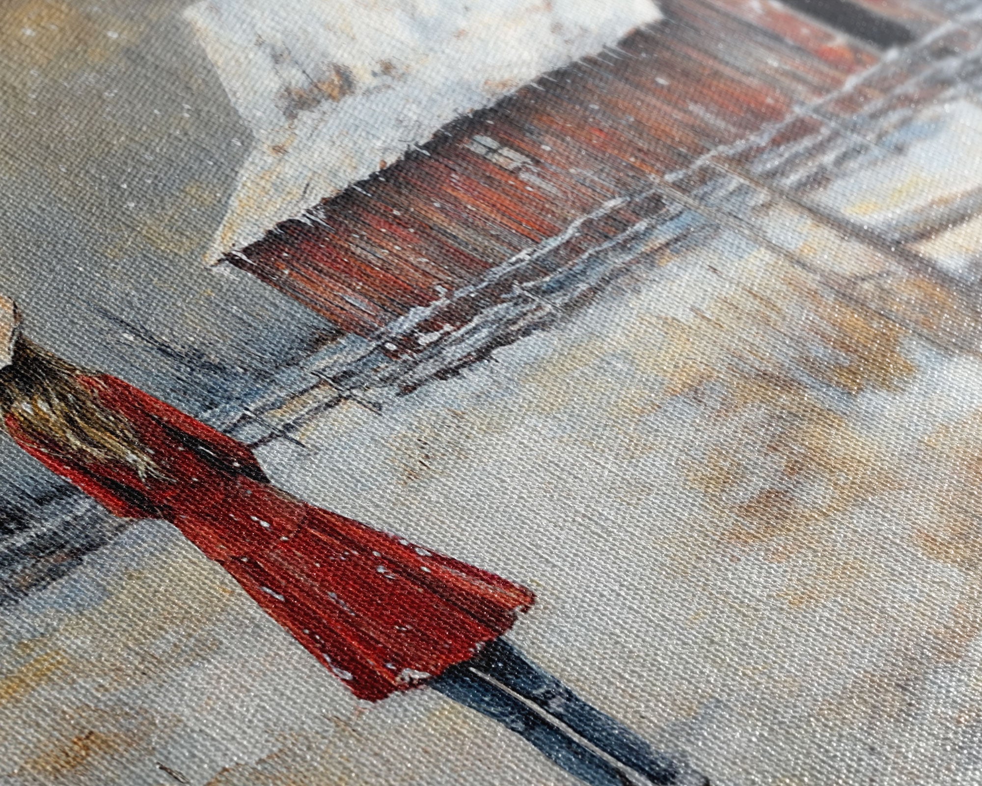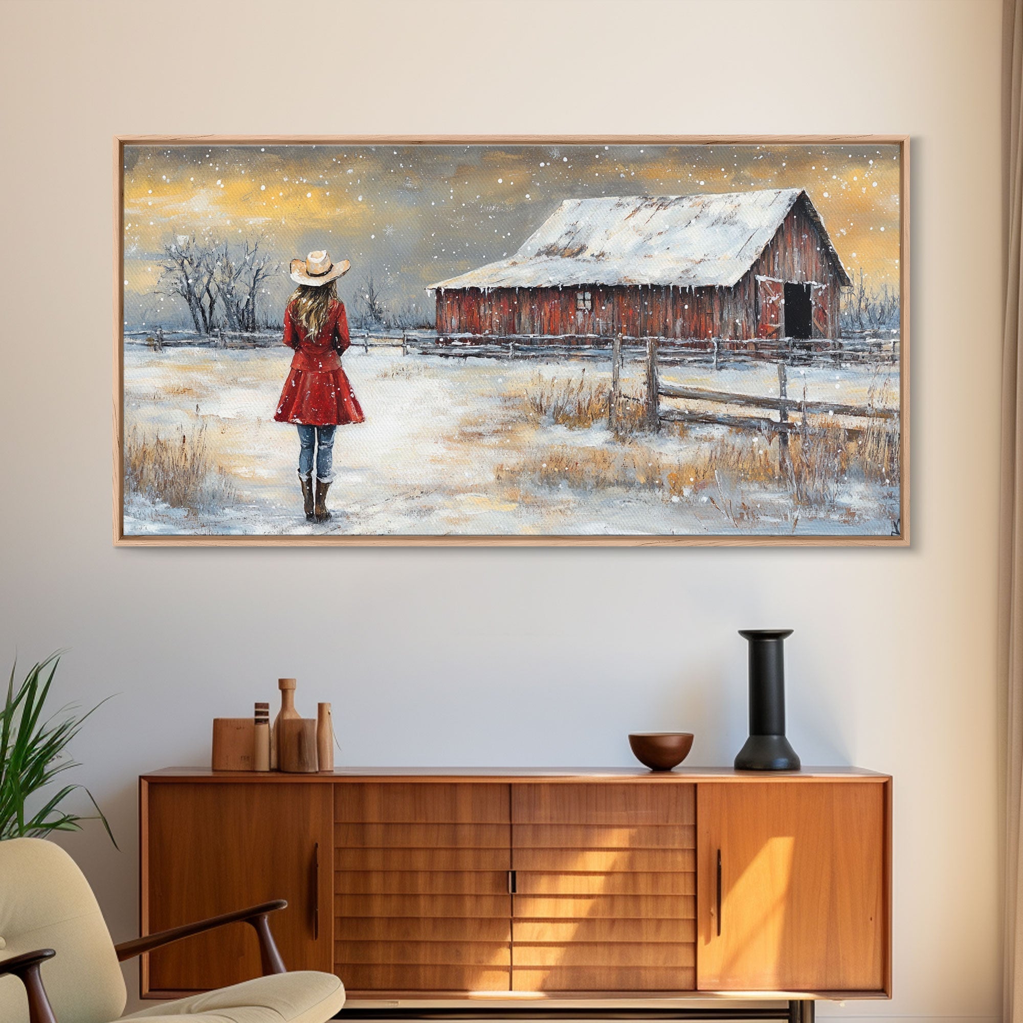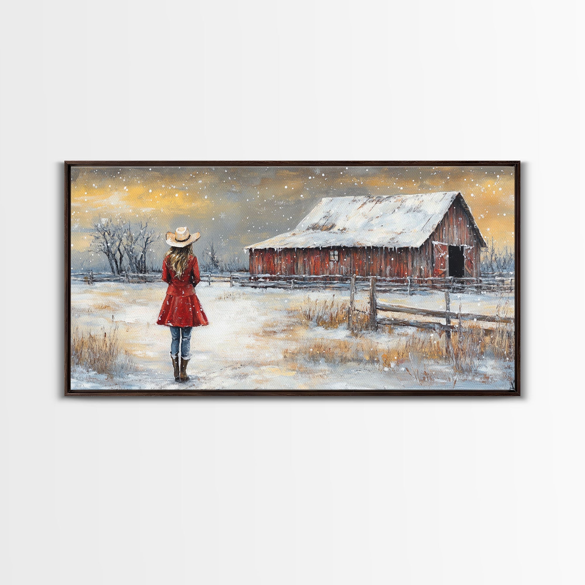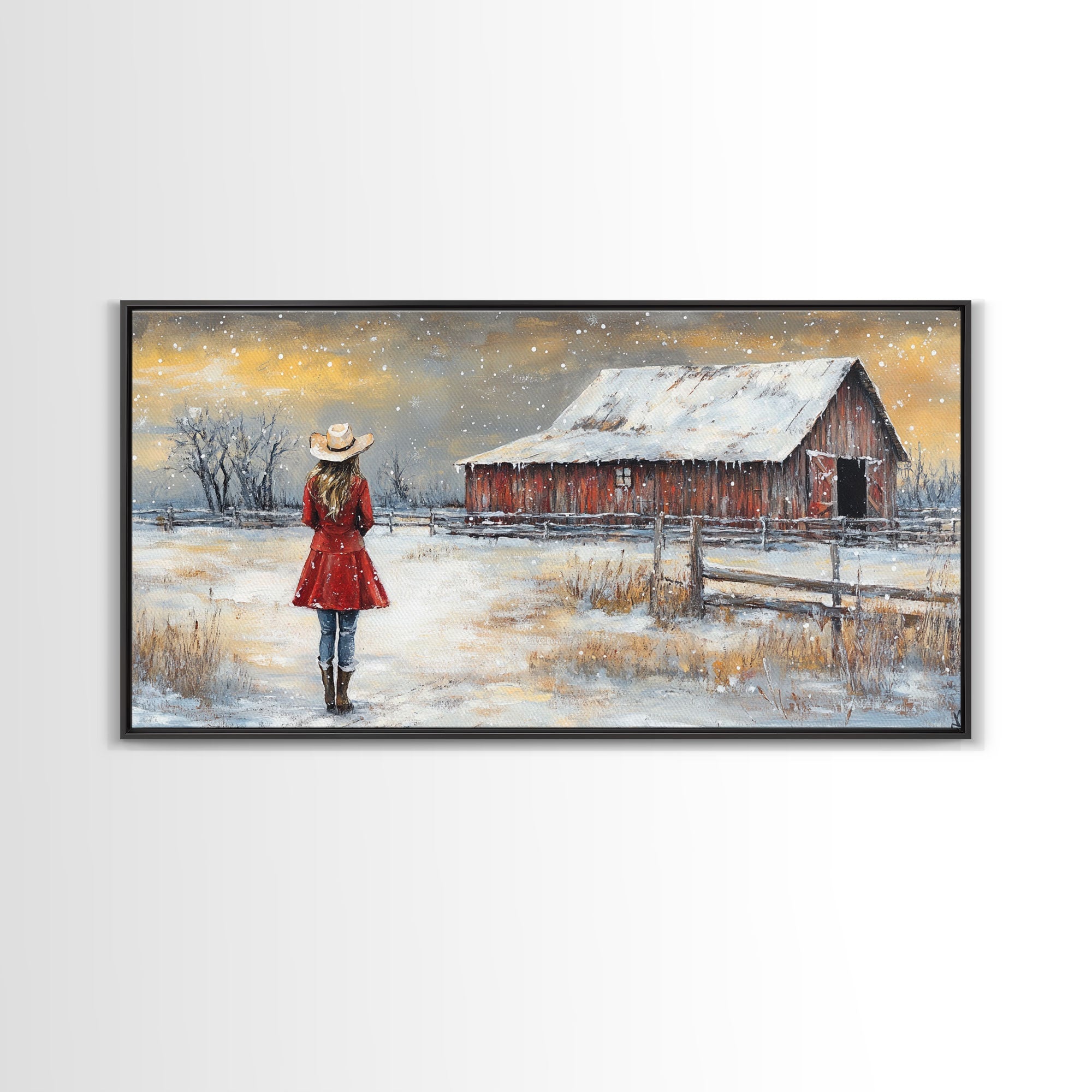 Barn Painting Framed Canvas Print, Cowgirl and her Barn, Rustic Farmhouse Decor, Winter Painting, Winter Wonderland, Farmhouse Wall Art