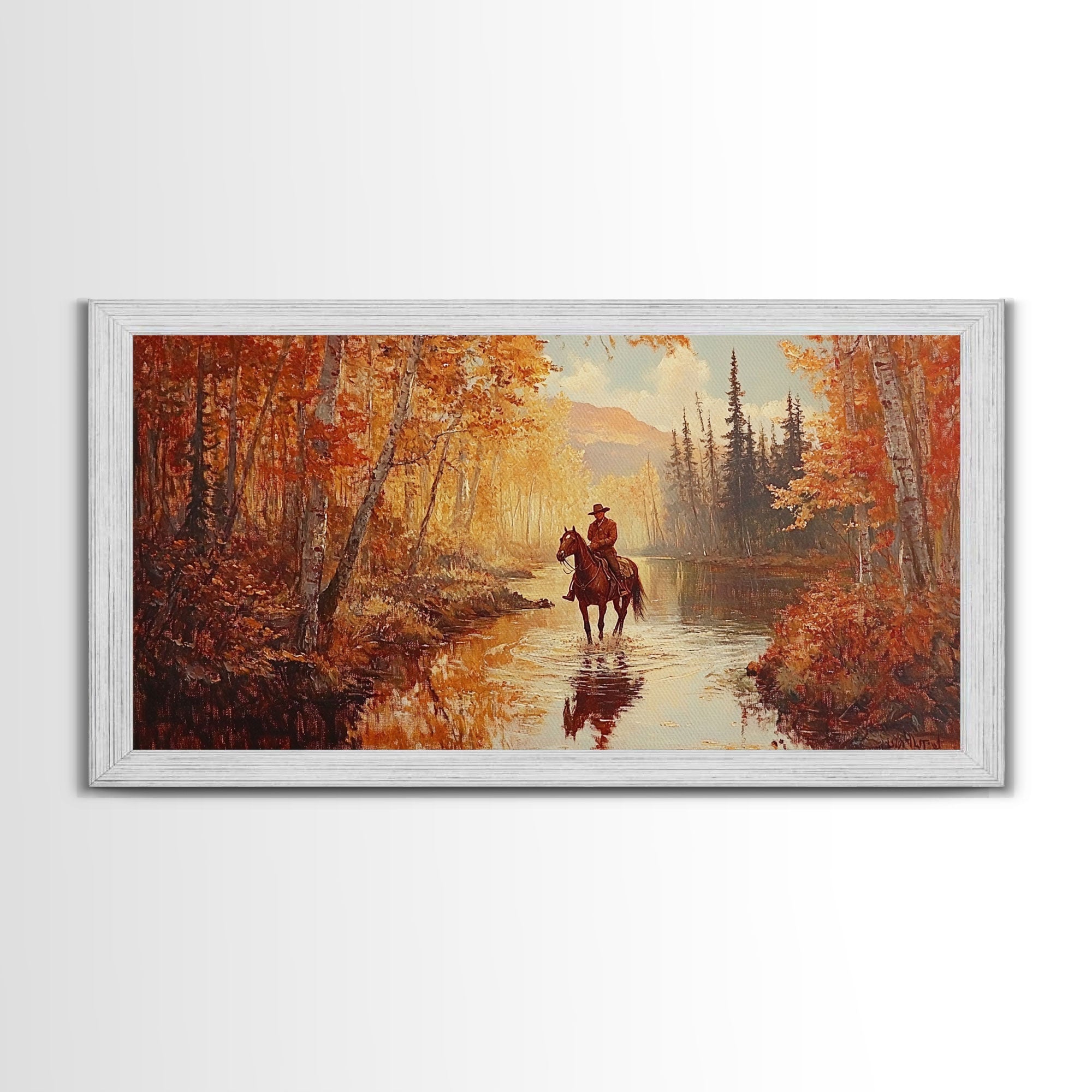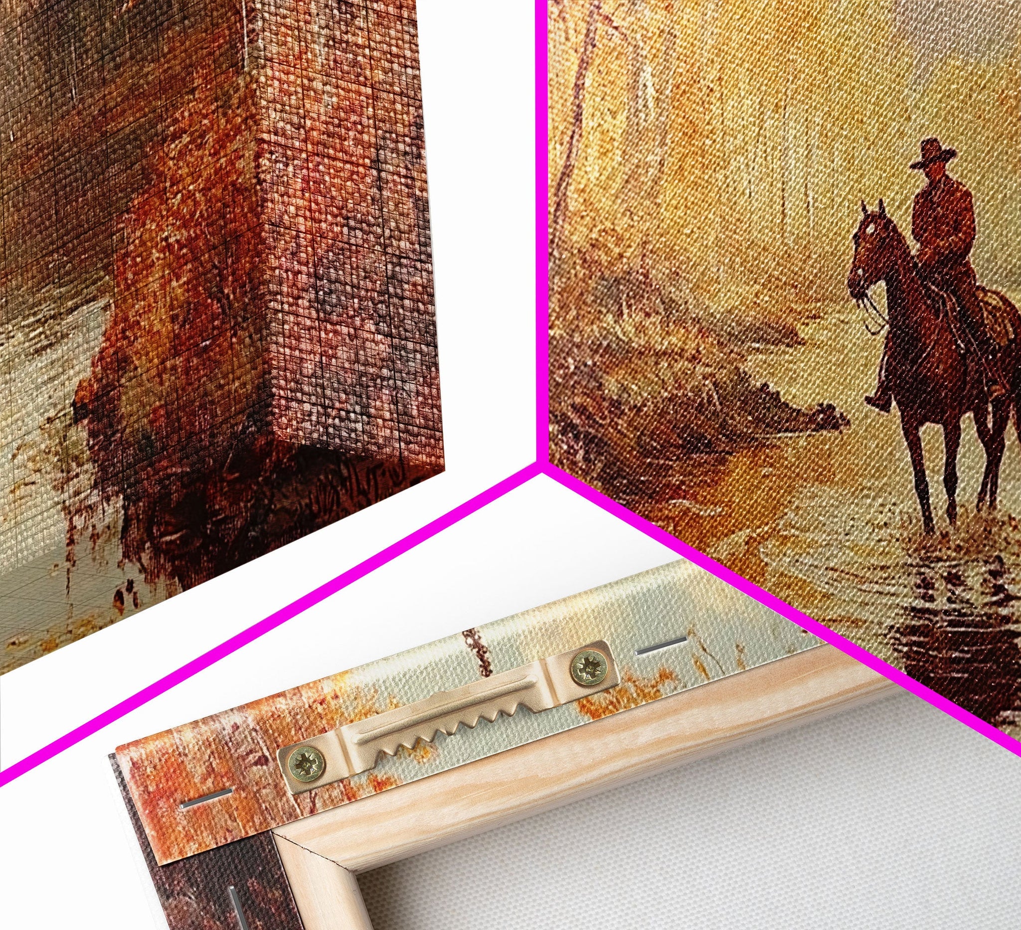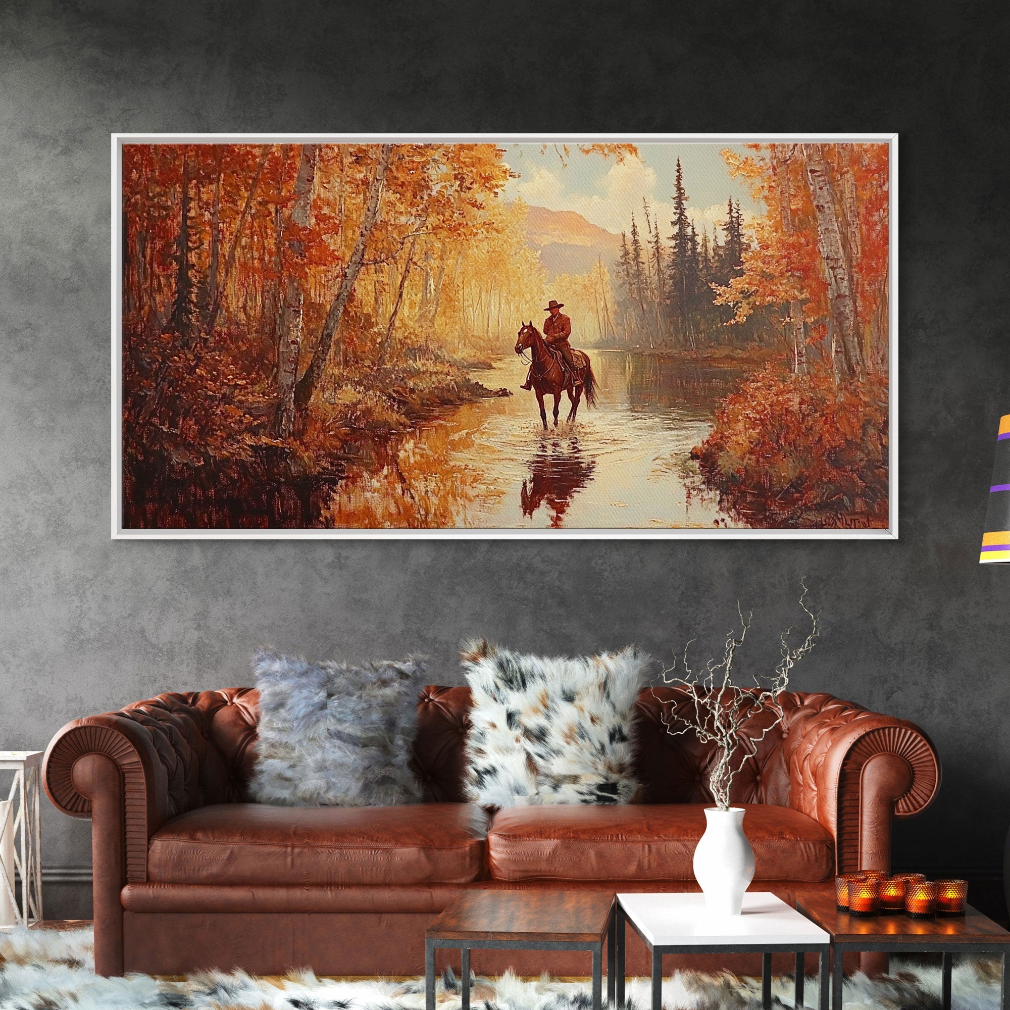 Black white cowboy riding toward snow-covered mountains, Framed Canvas Print, minimalist winter wall art, moody landscape, western decor