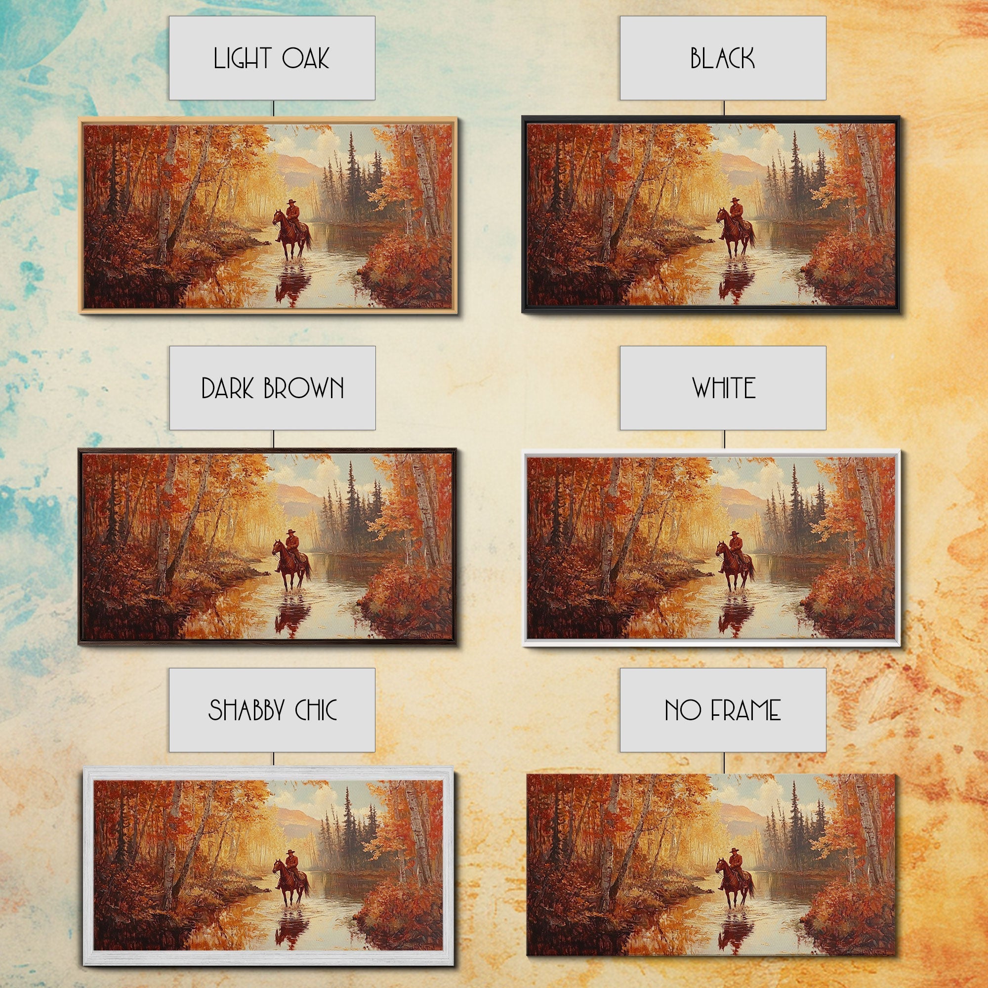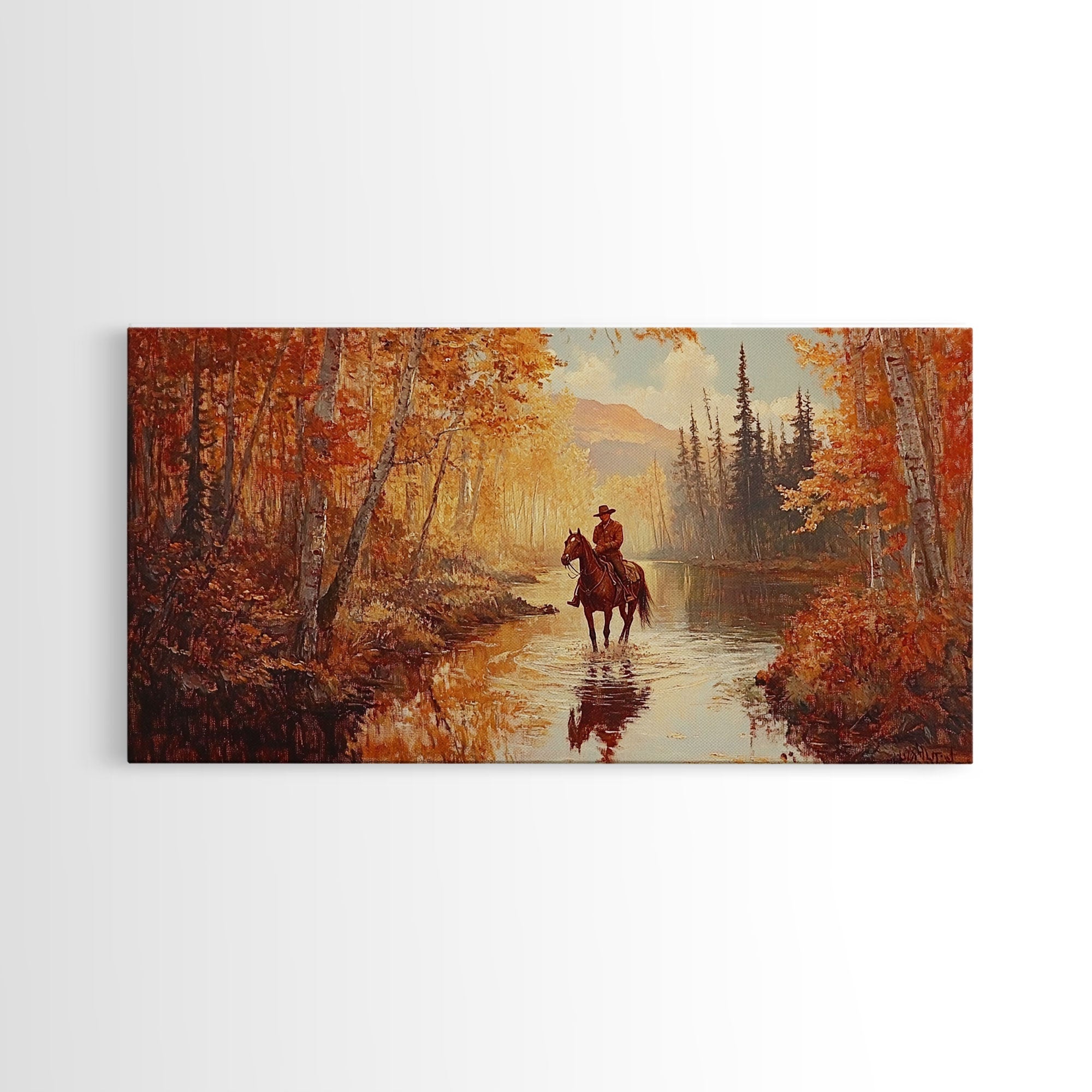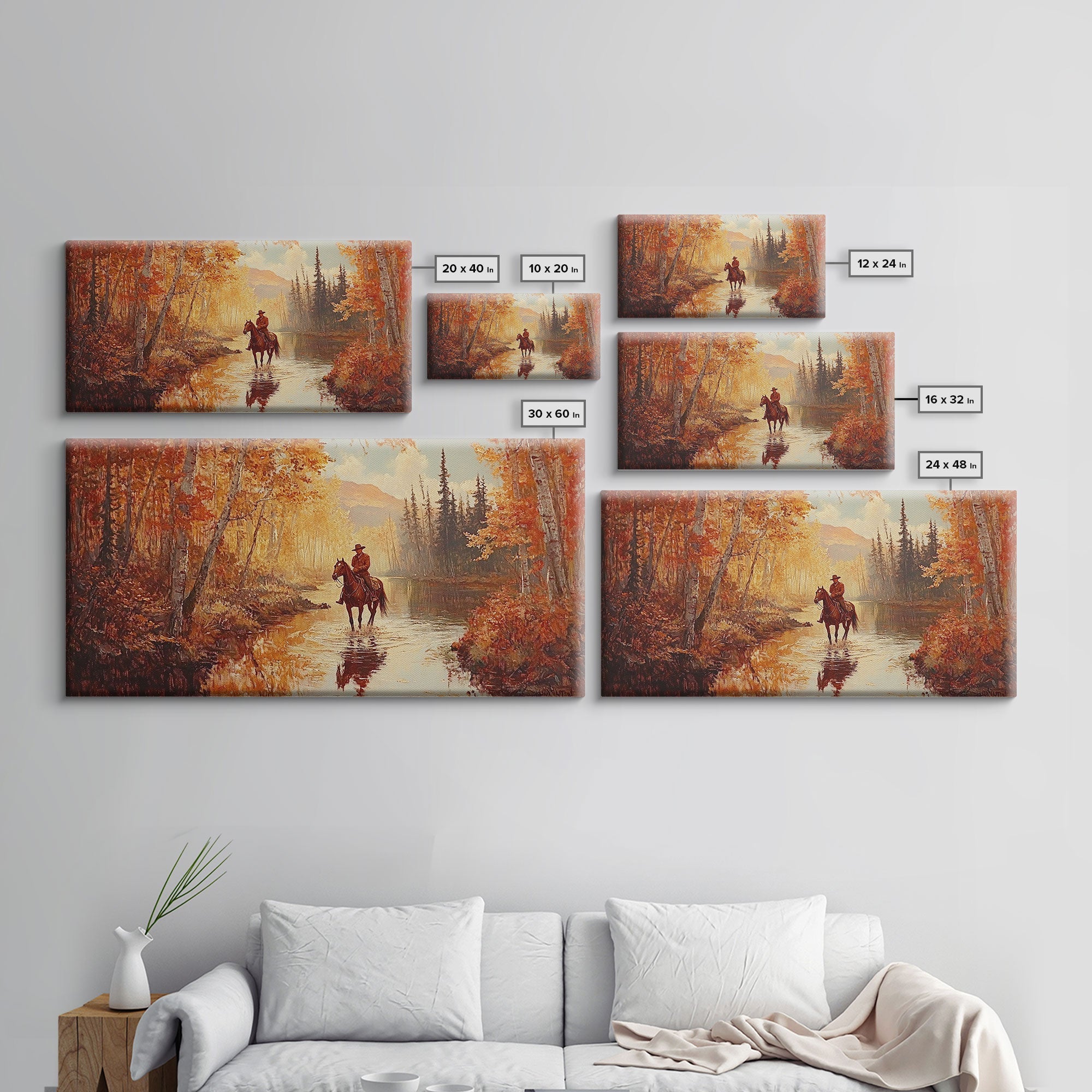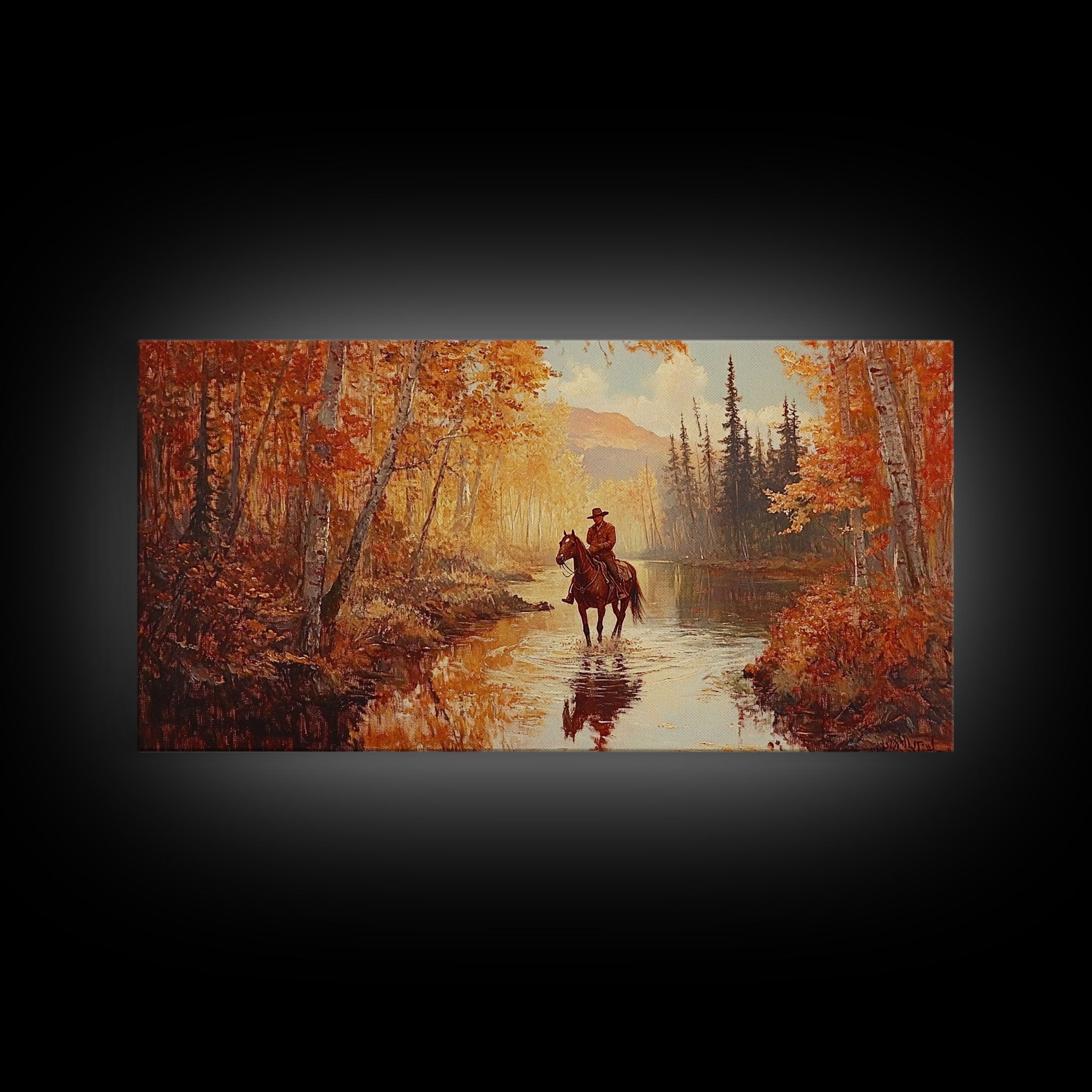 Black white cowboy riding toward snow-covered mountains, Framed Canvas Print, minimalist winter wall art, moody landscape, western decor