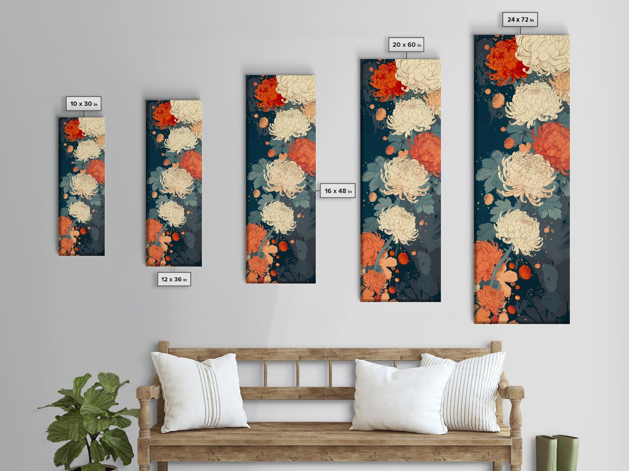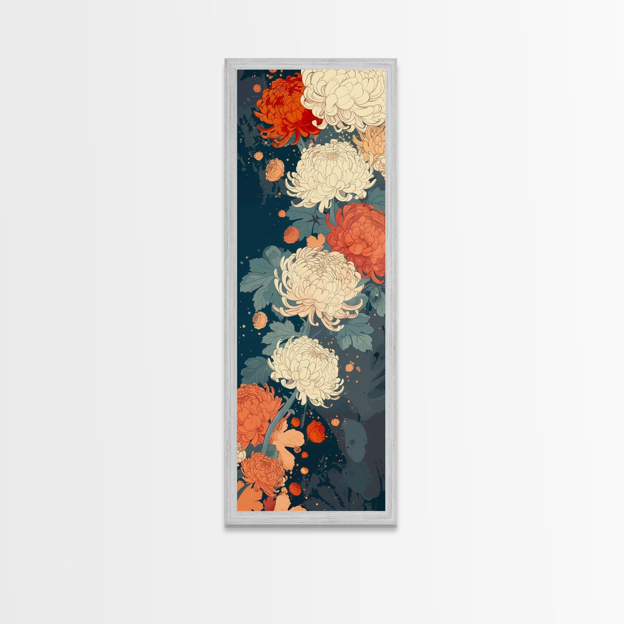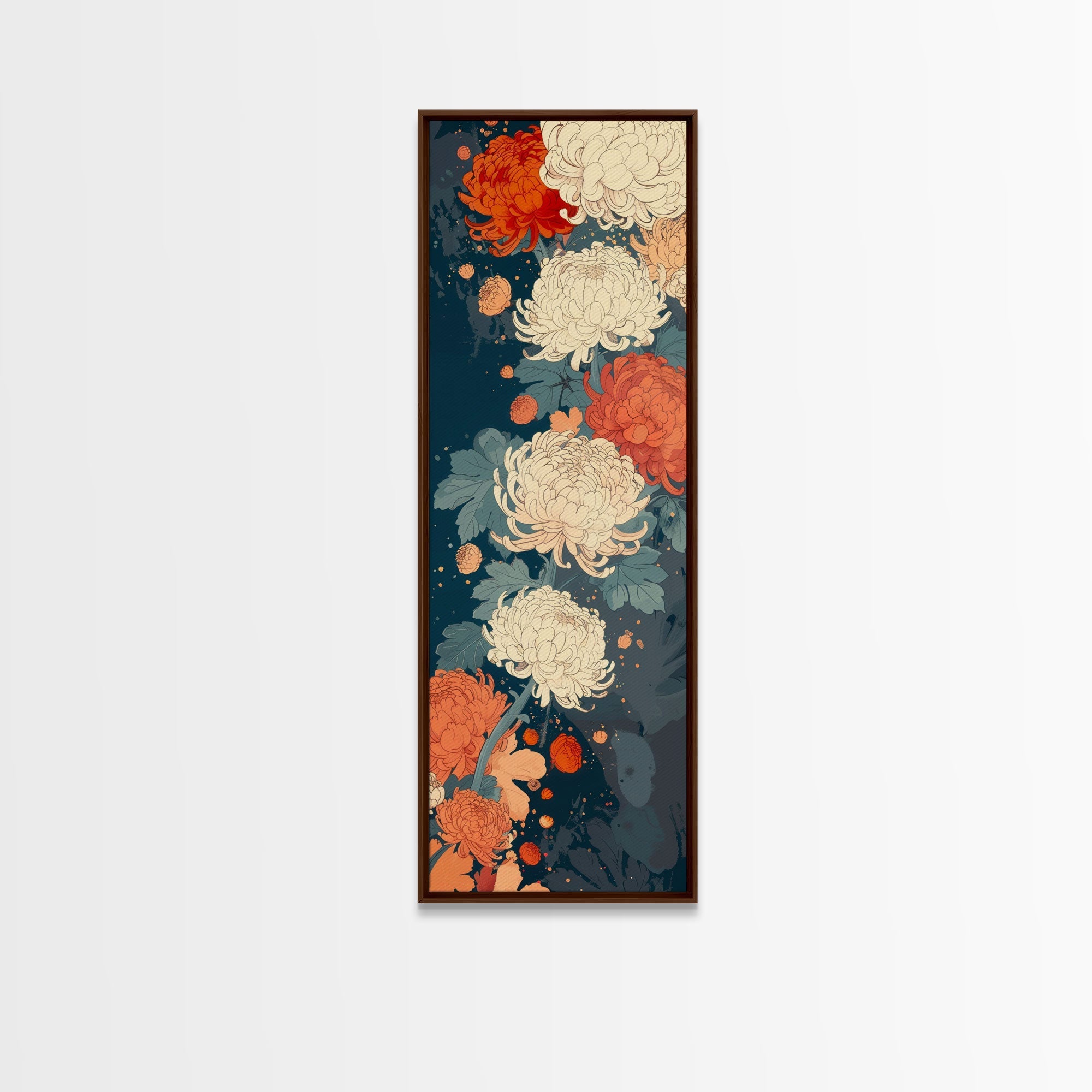Blooming Chrysanthemums in Rich Autumn Colors - Skinny Art, Japanese Wall Decor, Framed Canvas Print, Ukiyo-e Style