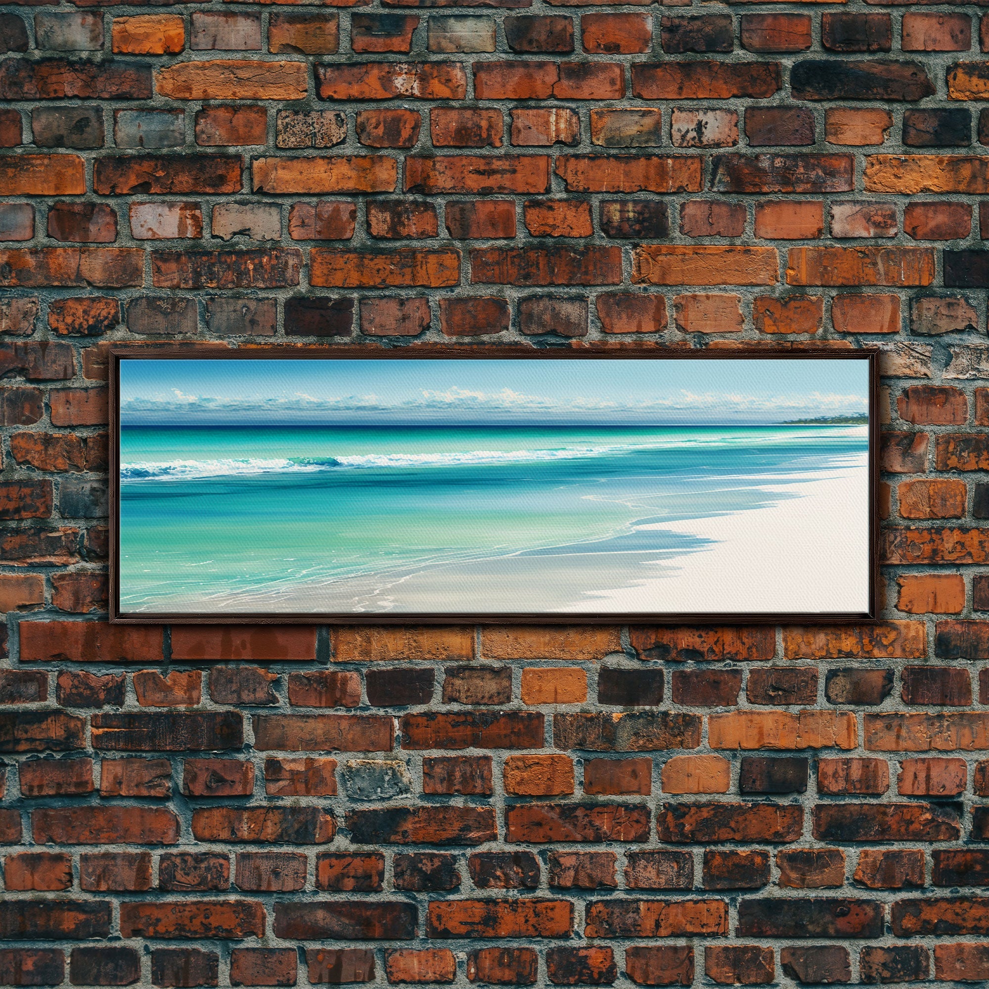 Blue Beach and Ocean Waves Panoramic Framed Canvas Print - Perfect for Living Room, Bedroom, Office Decor