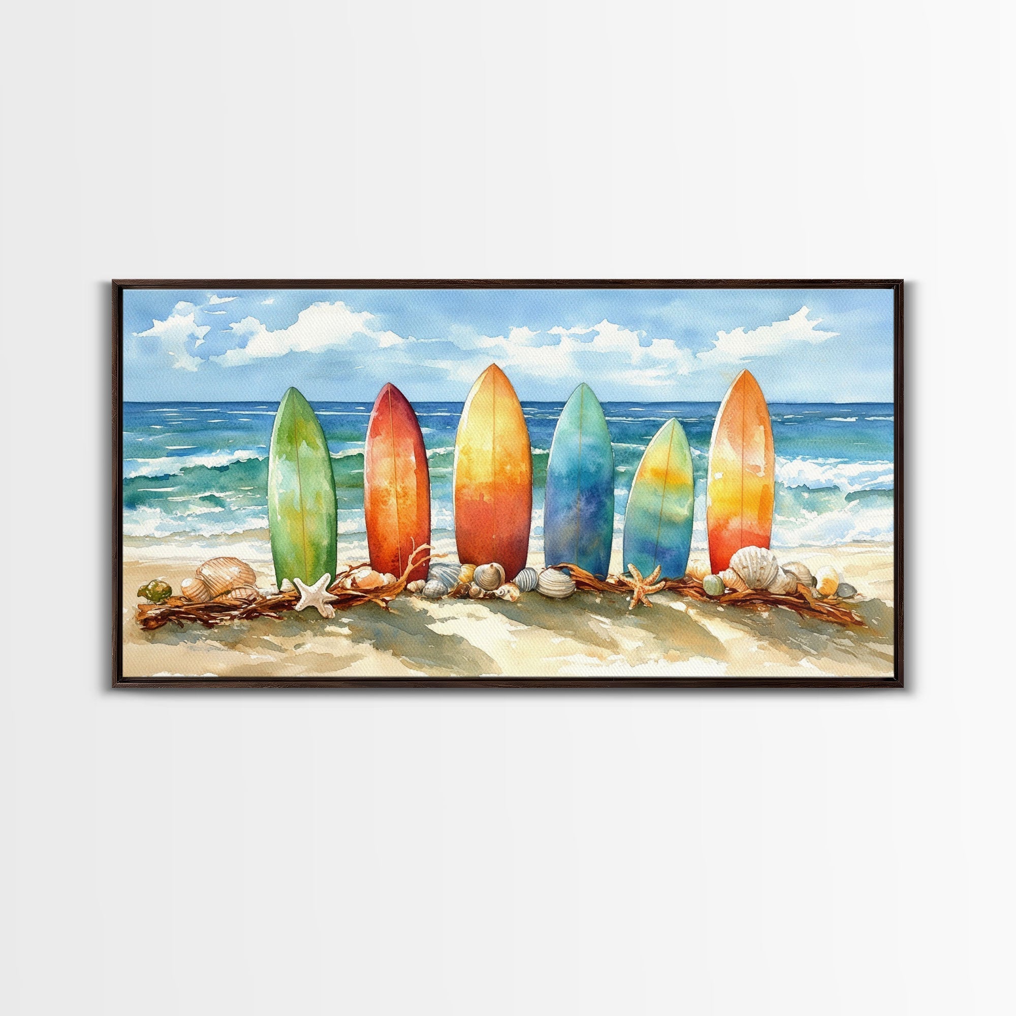 Colorful surfboards Christmas wall art, beach holiday decor, coastal Christmas art, framed canvas print, tropical Christmas art gift