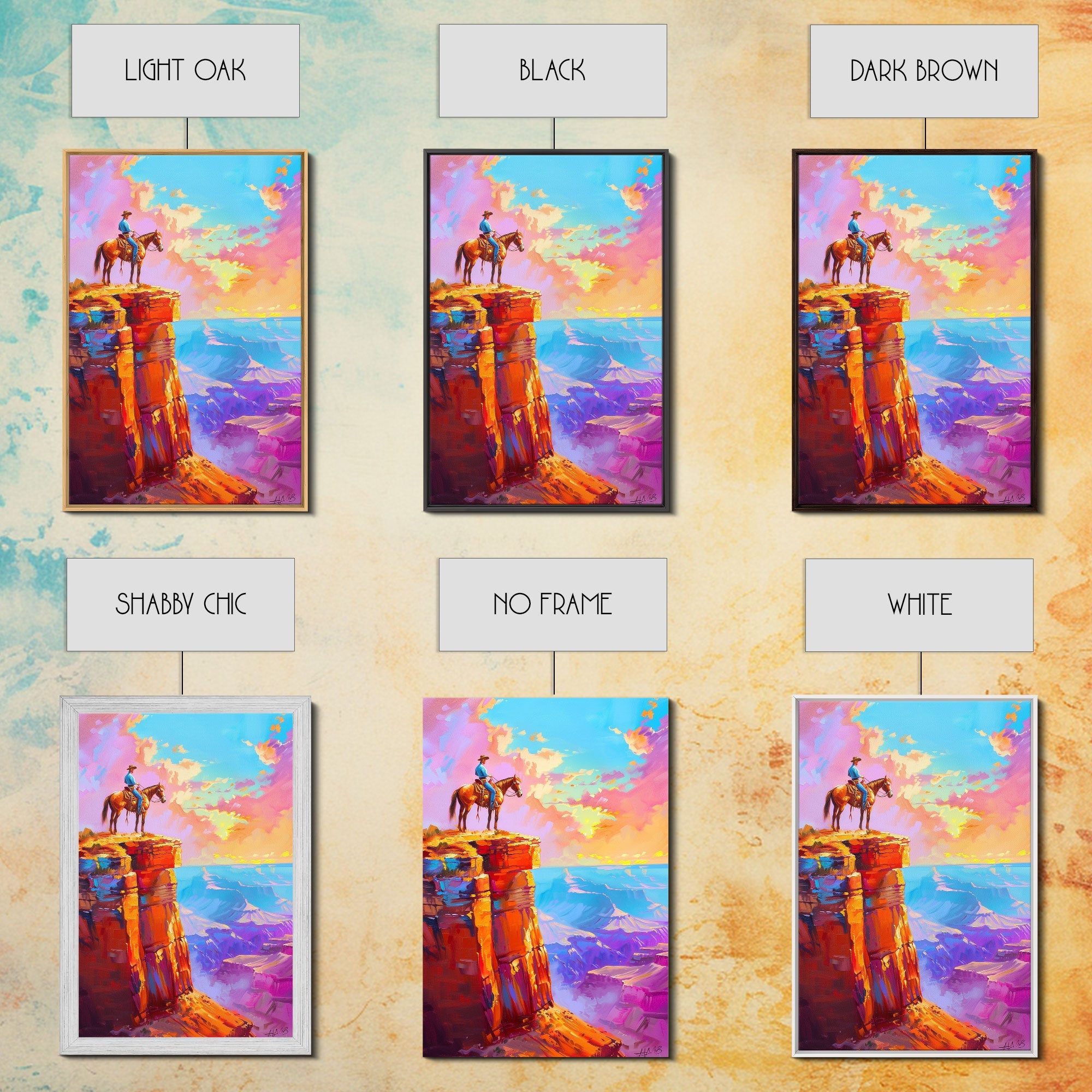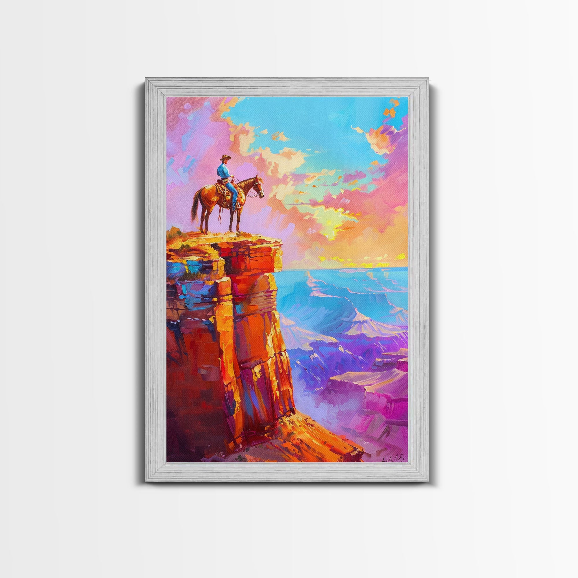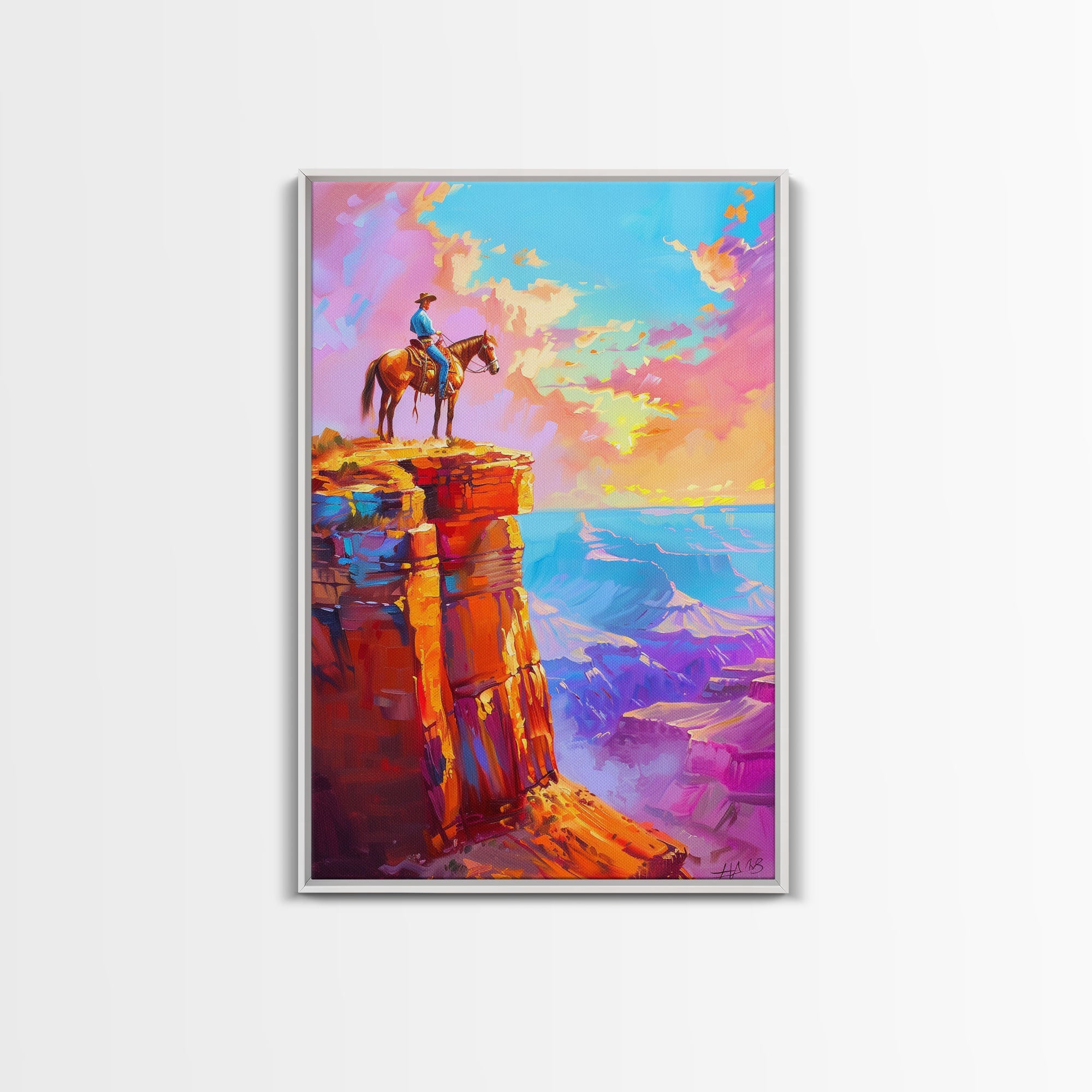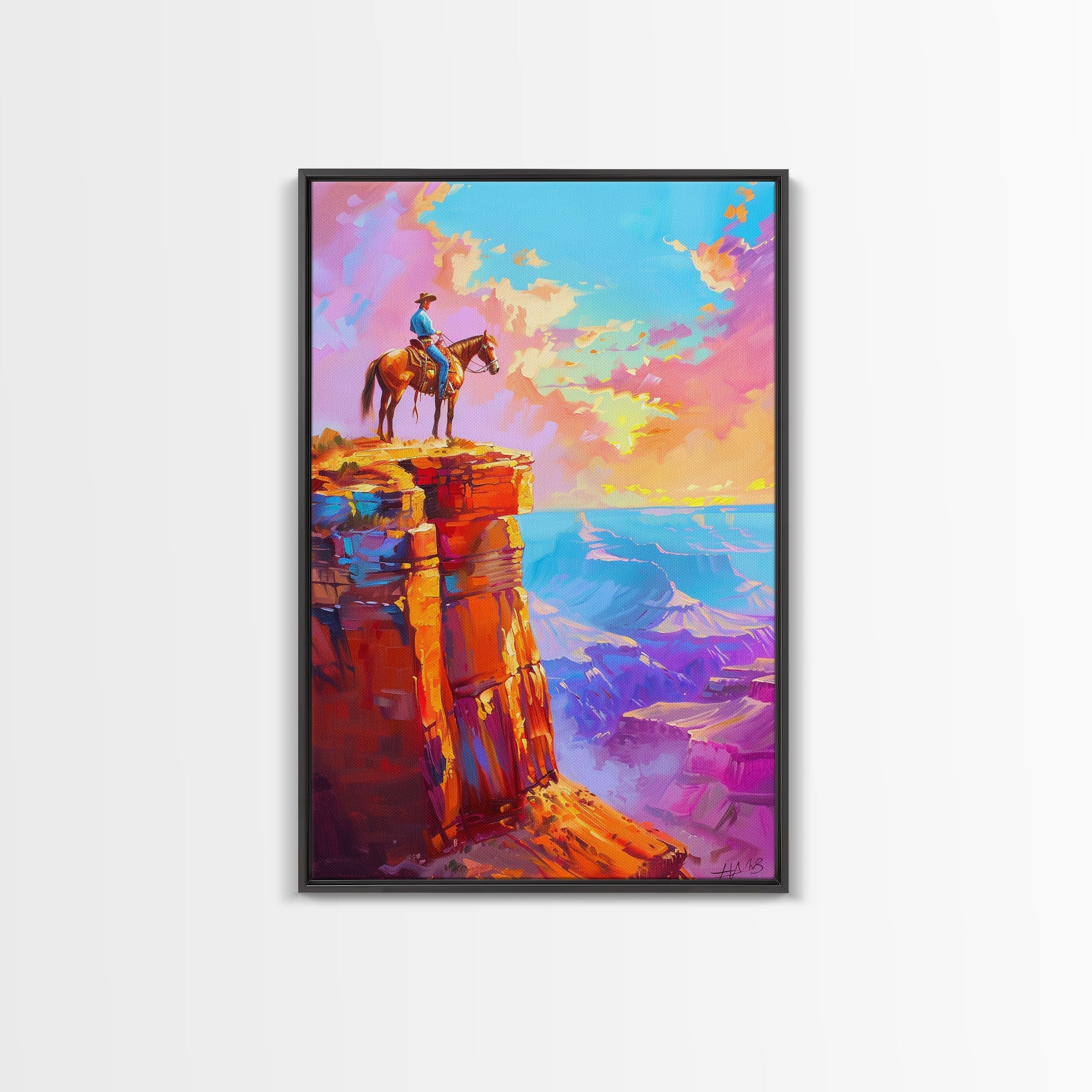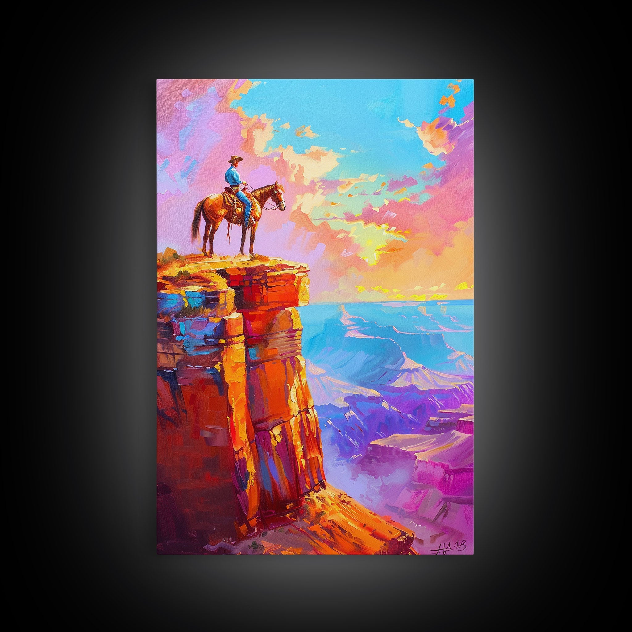 Cowboy on Cliff Edge at Sunset - Colorful Western Landscape Painting, Sunset Wall Art, Living Room Decor, Cowboy Canvas Print
