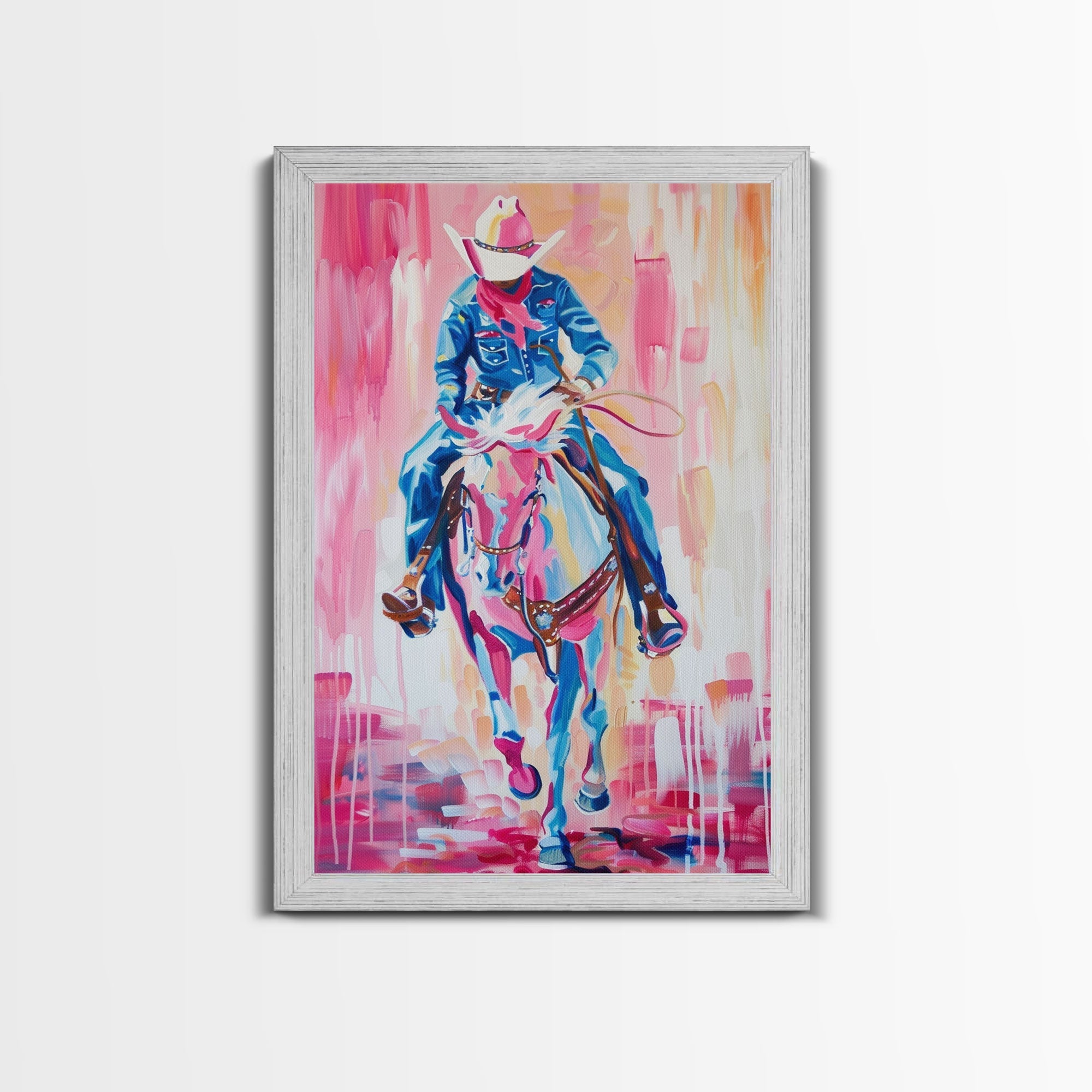 Cowboy Riding in Pink - Colorful Western Art, Framed Canvas Print, Living Room Decor, Cowboy Painting, Vibrant Wall Art