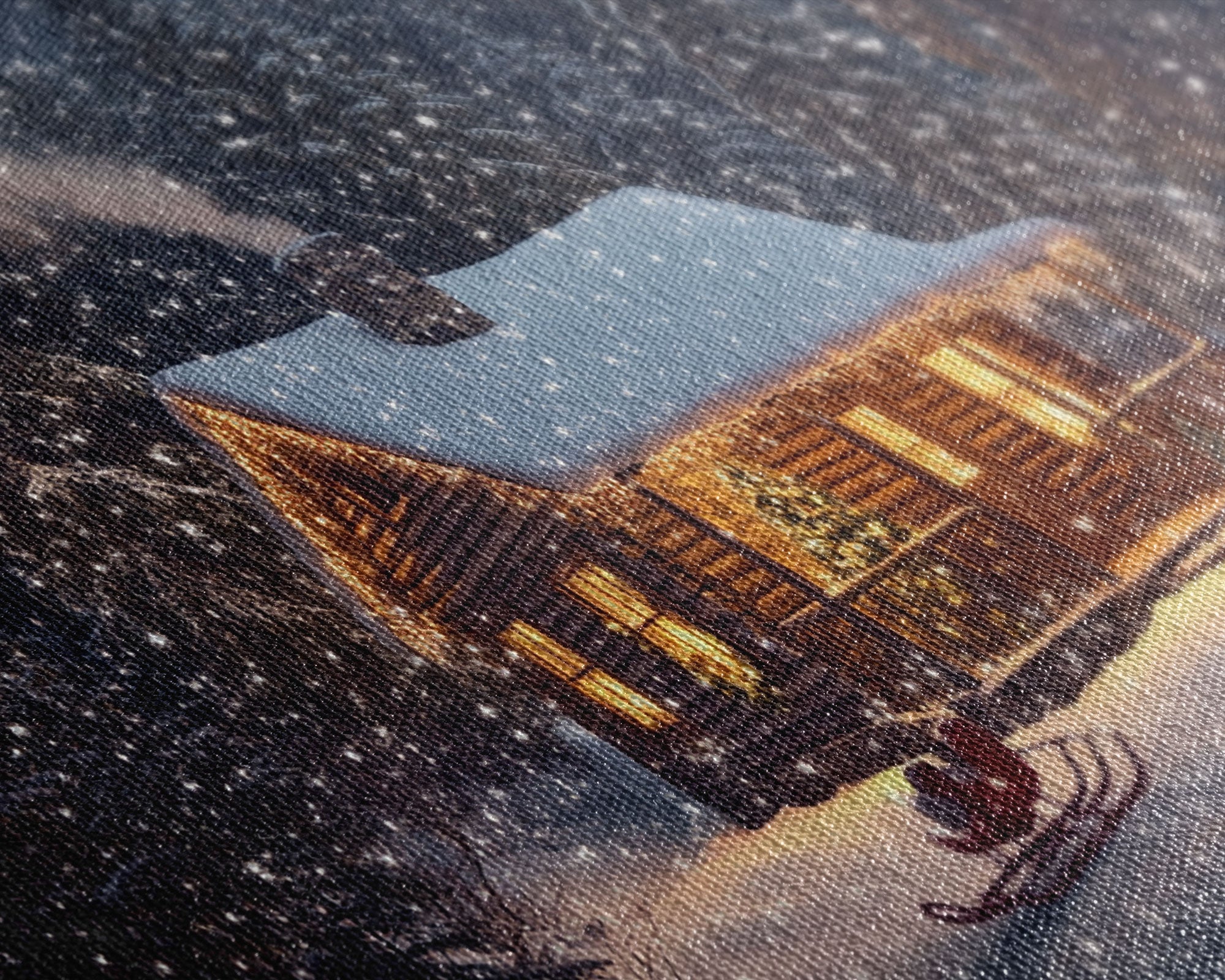Cozy Cabin in Snow Framed Canvas Print, Winter Wonderland Scene Art, Rustic Christmas Decor, Holiday Wall Art, Seasonal Gift Idea