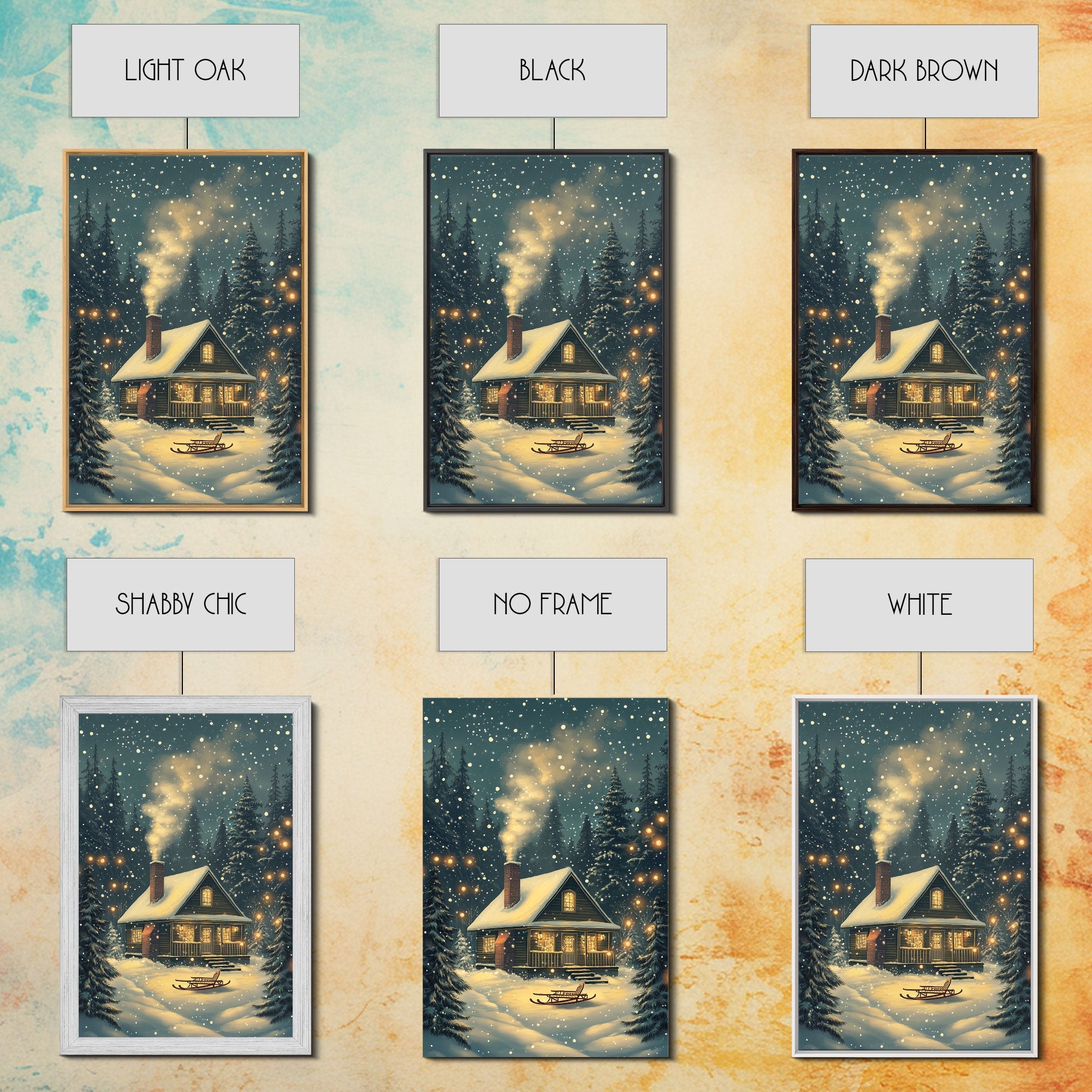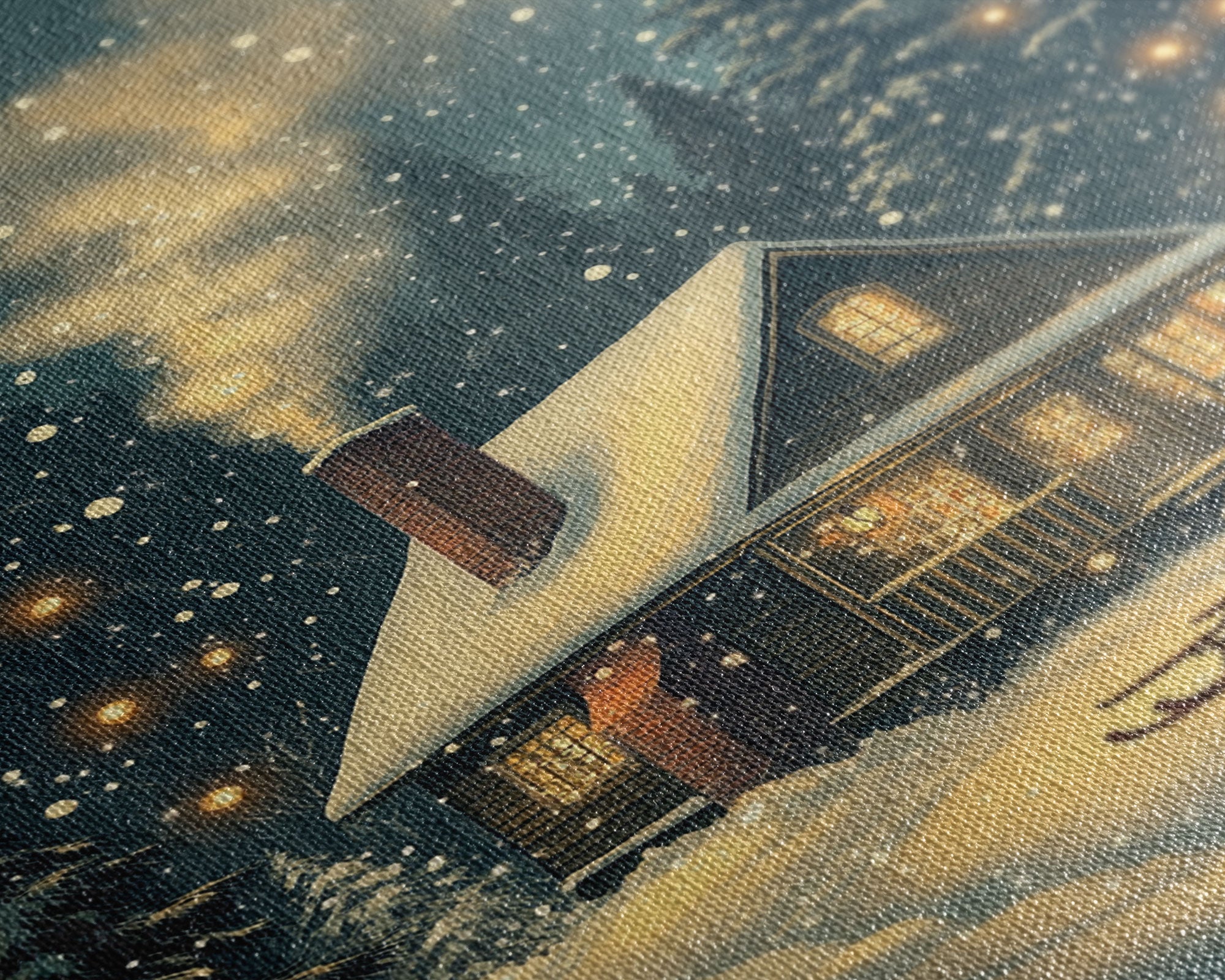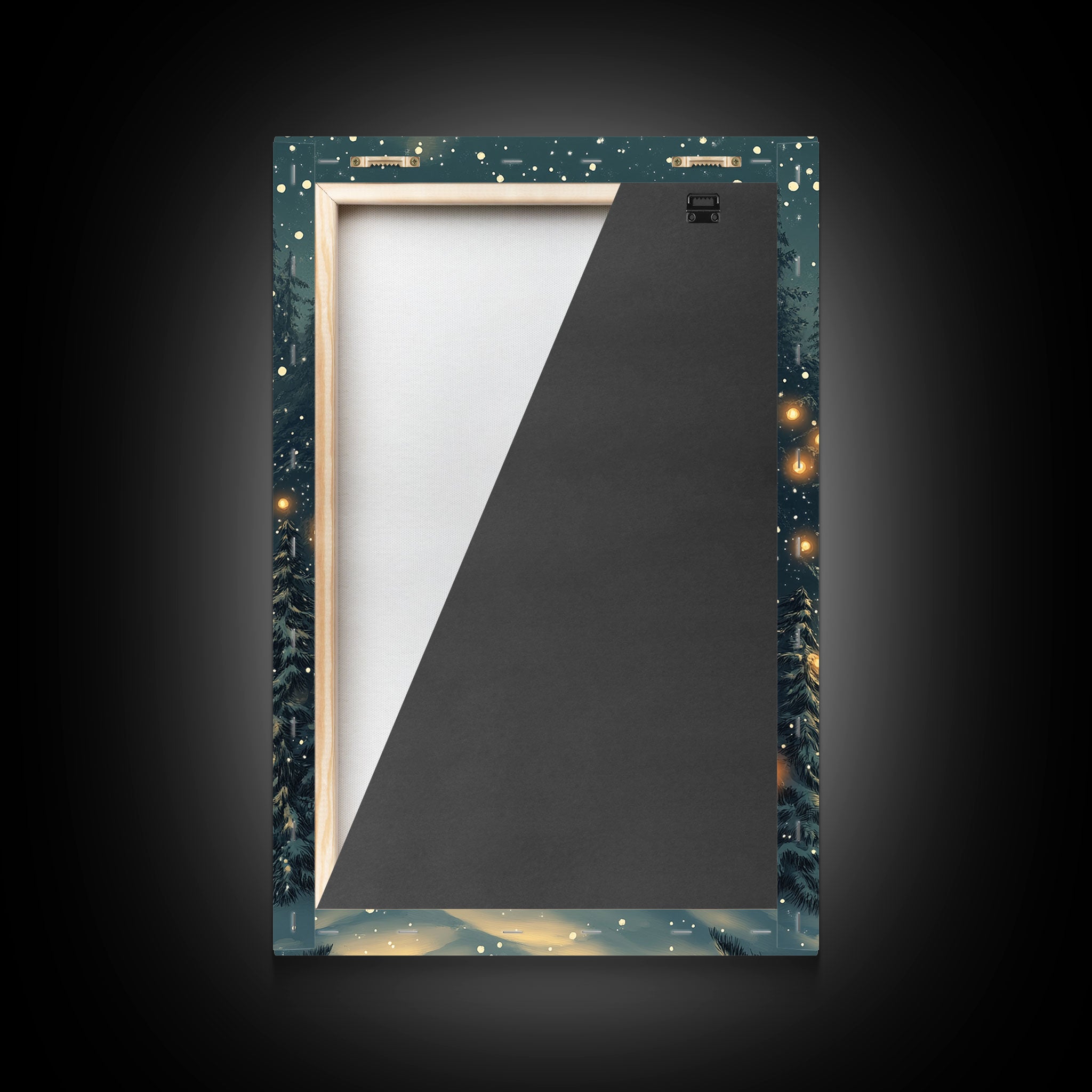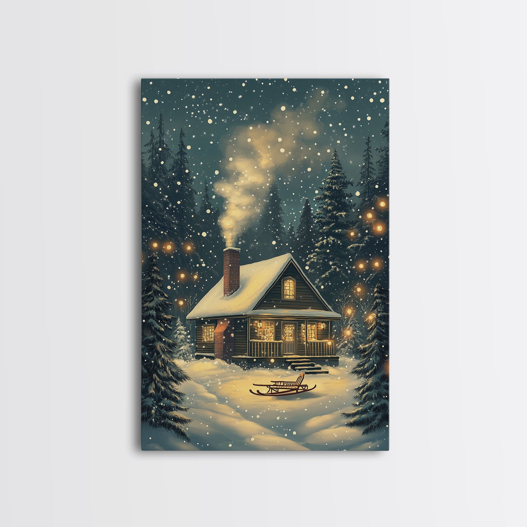 Cozy Cabin in Snowy Winter Forest, Warm Christmas Lights and Peaceful Holiday Scene, Perfect for Winter Wall Art, Framed Canvas Print