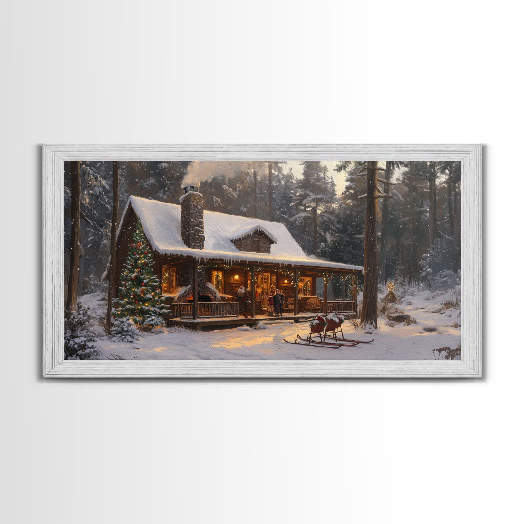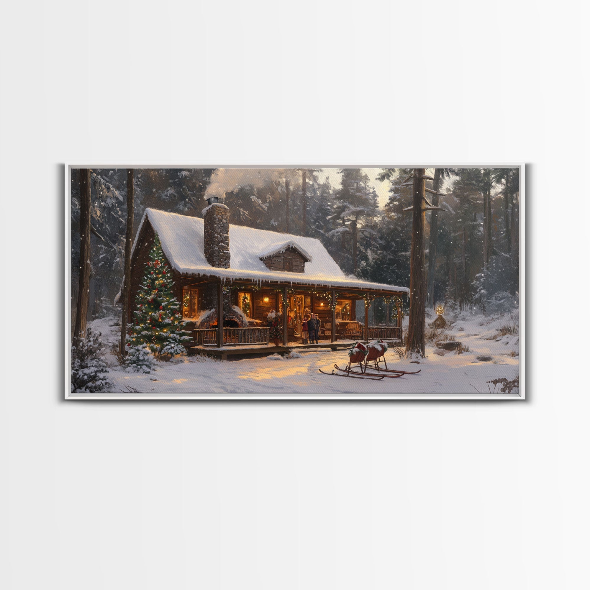 Cozy Christmas Cabin in Woods Framed Canvas Print - Rustic Christmas Decor and Winter Wonderland Scene with Holiday Wall Art