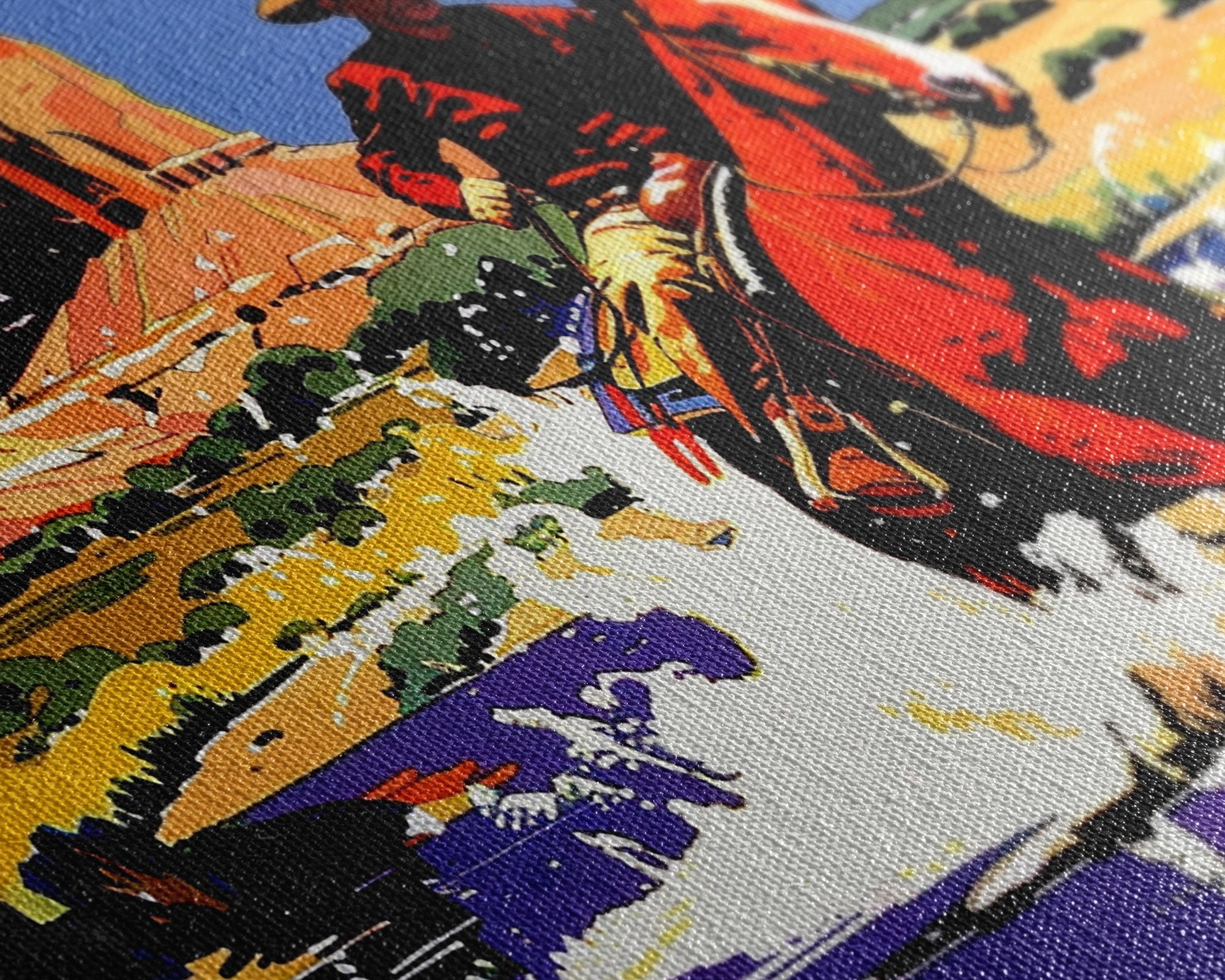 Most of our canvases are made in the USA, with the exception of canvases ordered with the light oak unstained frames, and any large canvases (24x48, 30x60, 16x48 and 20x60) ordered WITH a frame. These are temporarily made in and shipped from Europe, while we try to find a more consistent supplier in the USA.