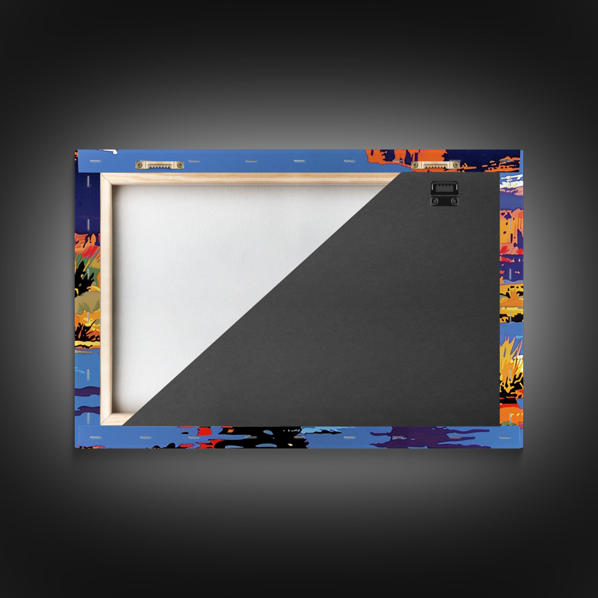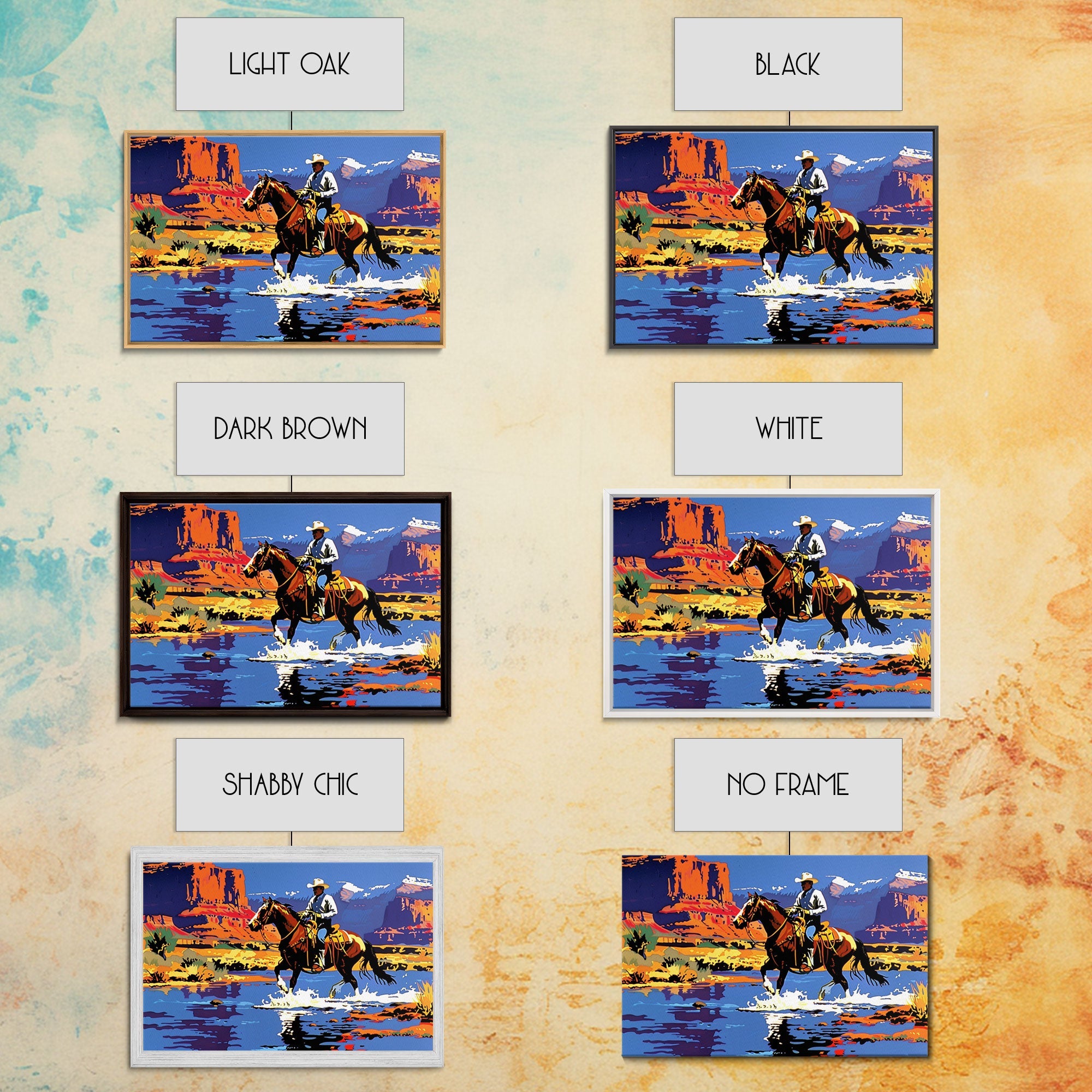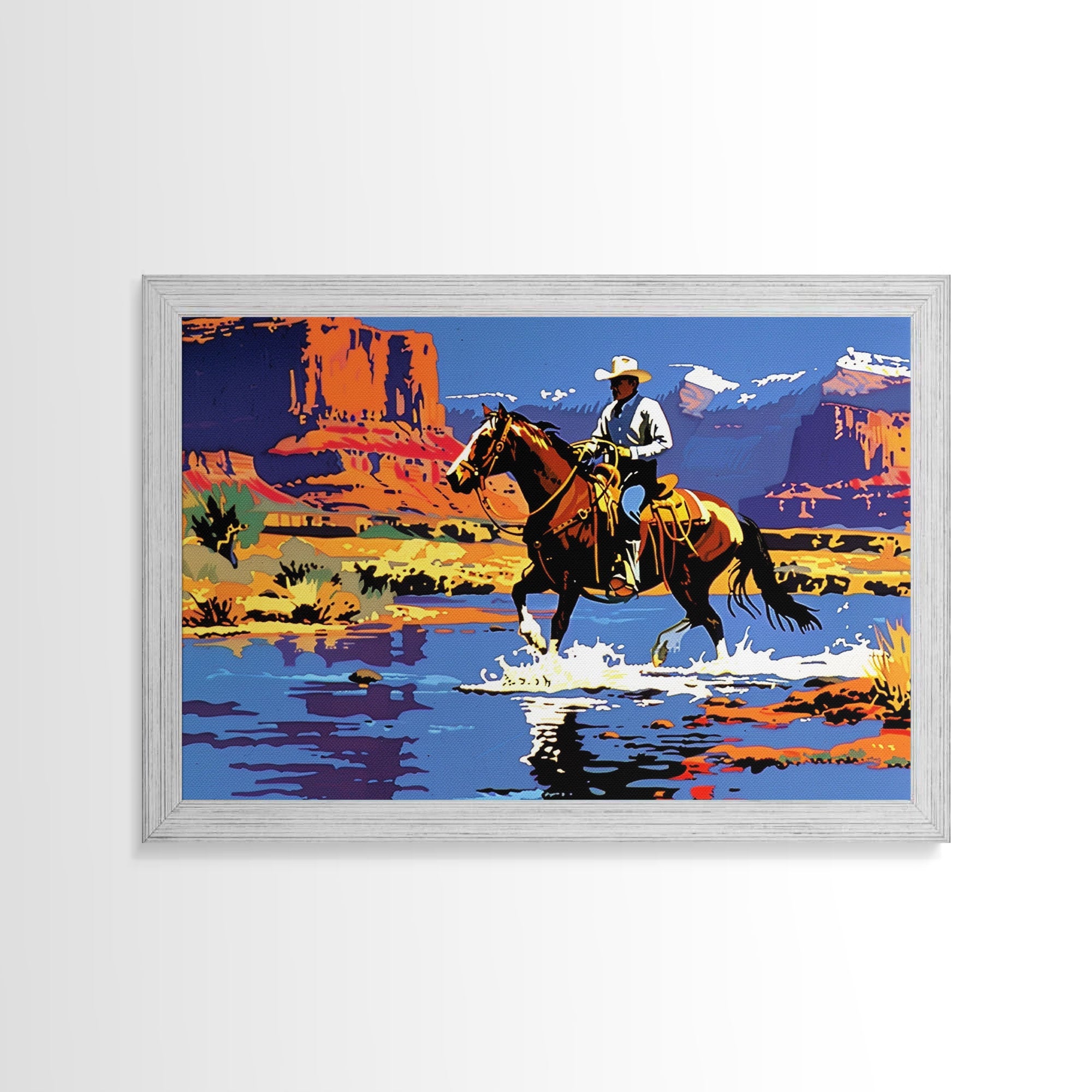 Crossing The Colorado River, Framed Canvas Print, Kitsch Western Wall Art, Colorful Western Painting Original Artwork, Pop Art Painting