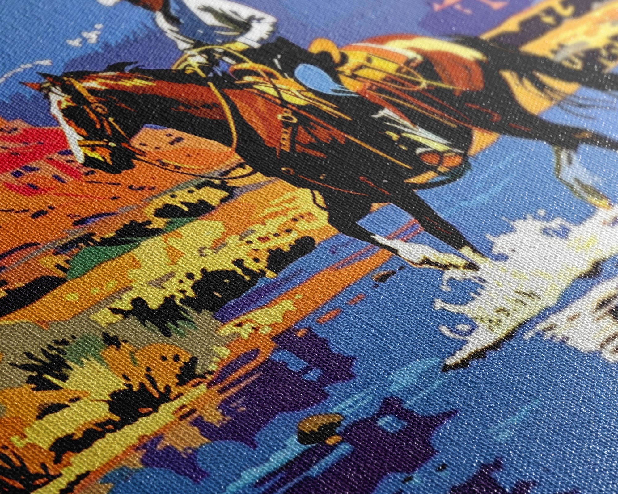 • Load image into Gallery viewer, Crossing The Colorado River, Framed Canvas Print, Kitsch Western Wall Art, Colorful Western Painting Original Artwork, Pop Art Painting