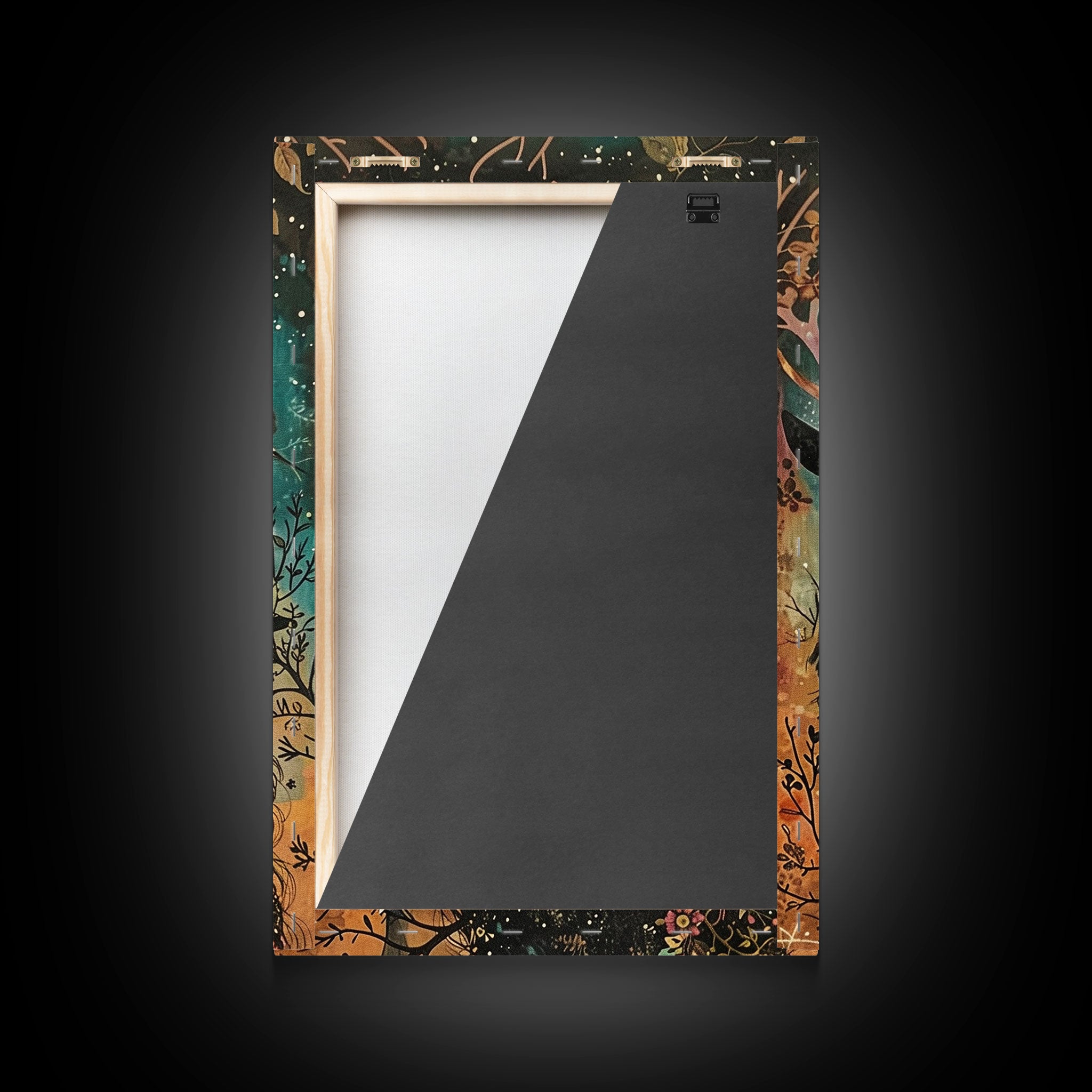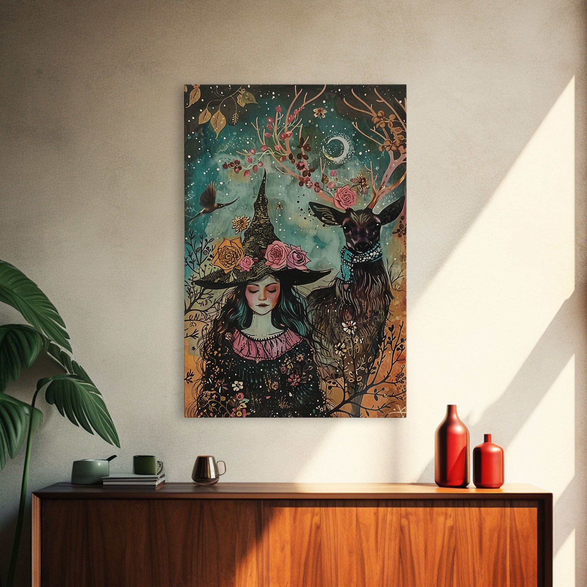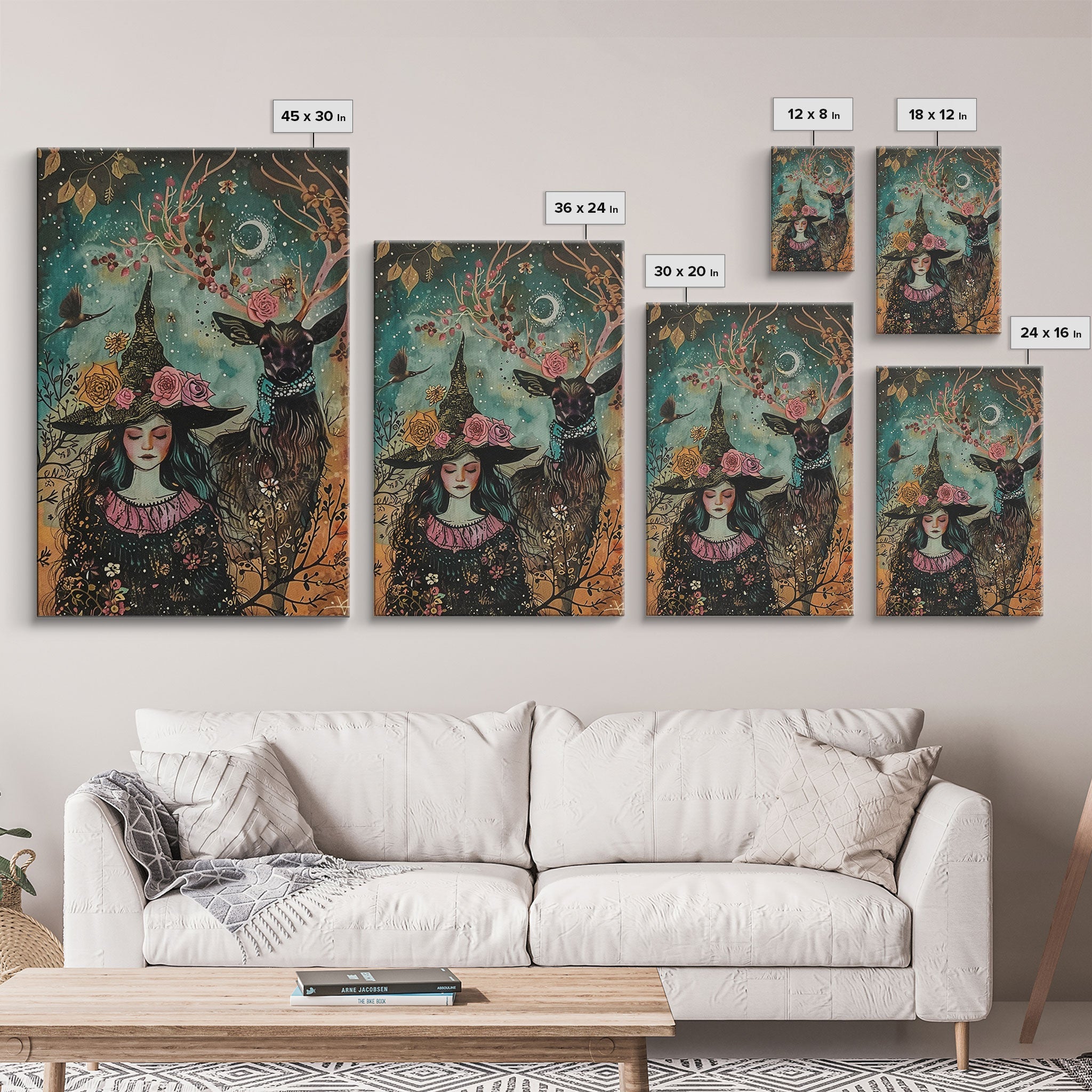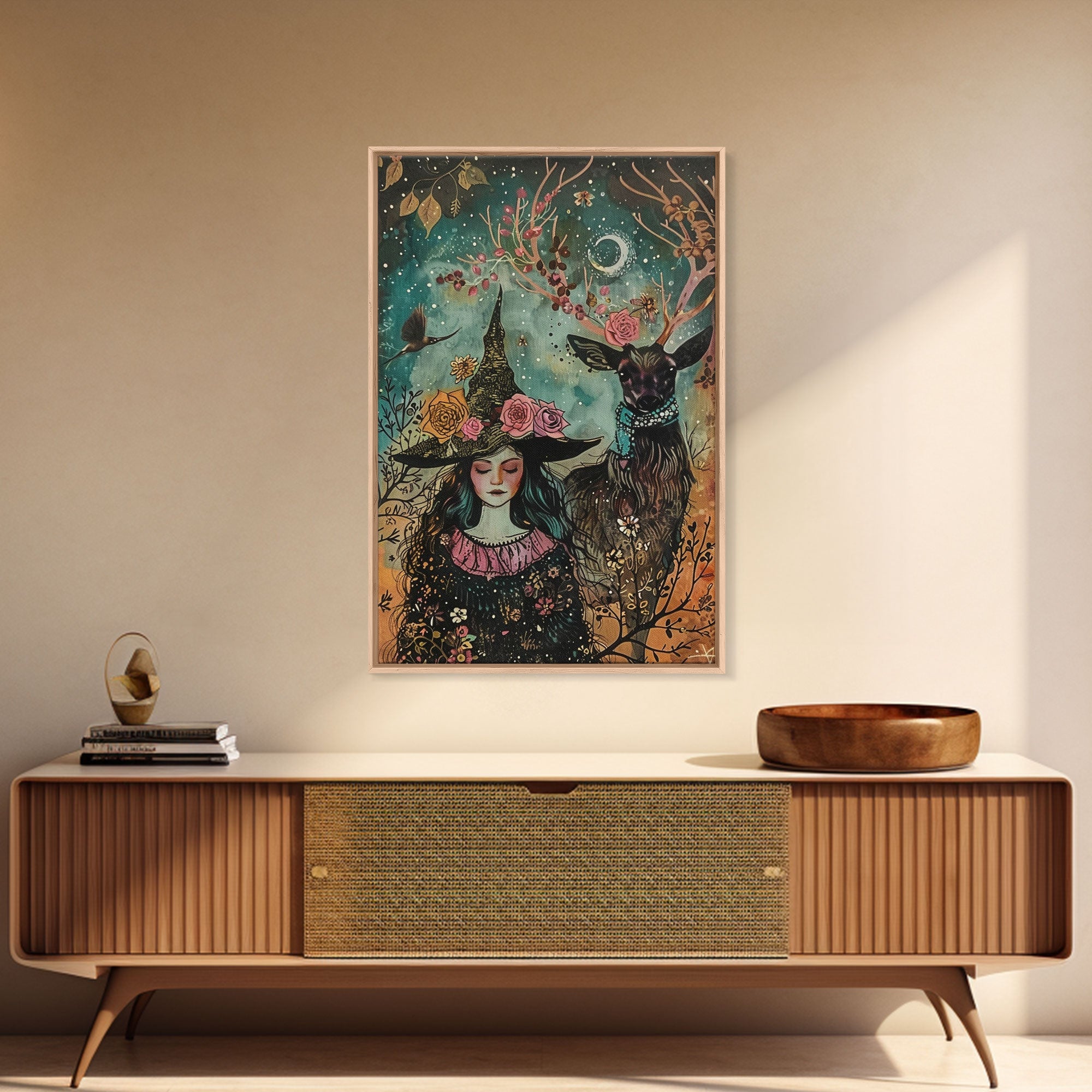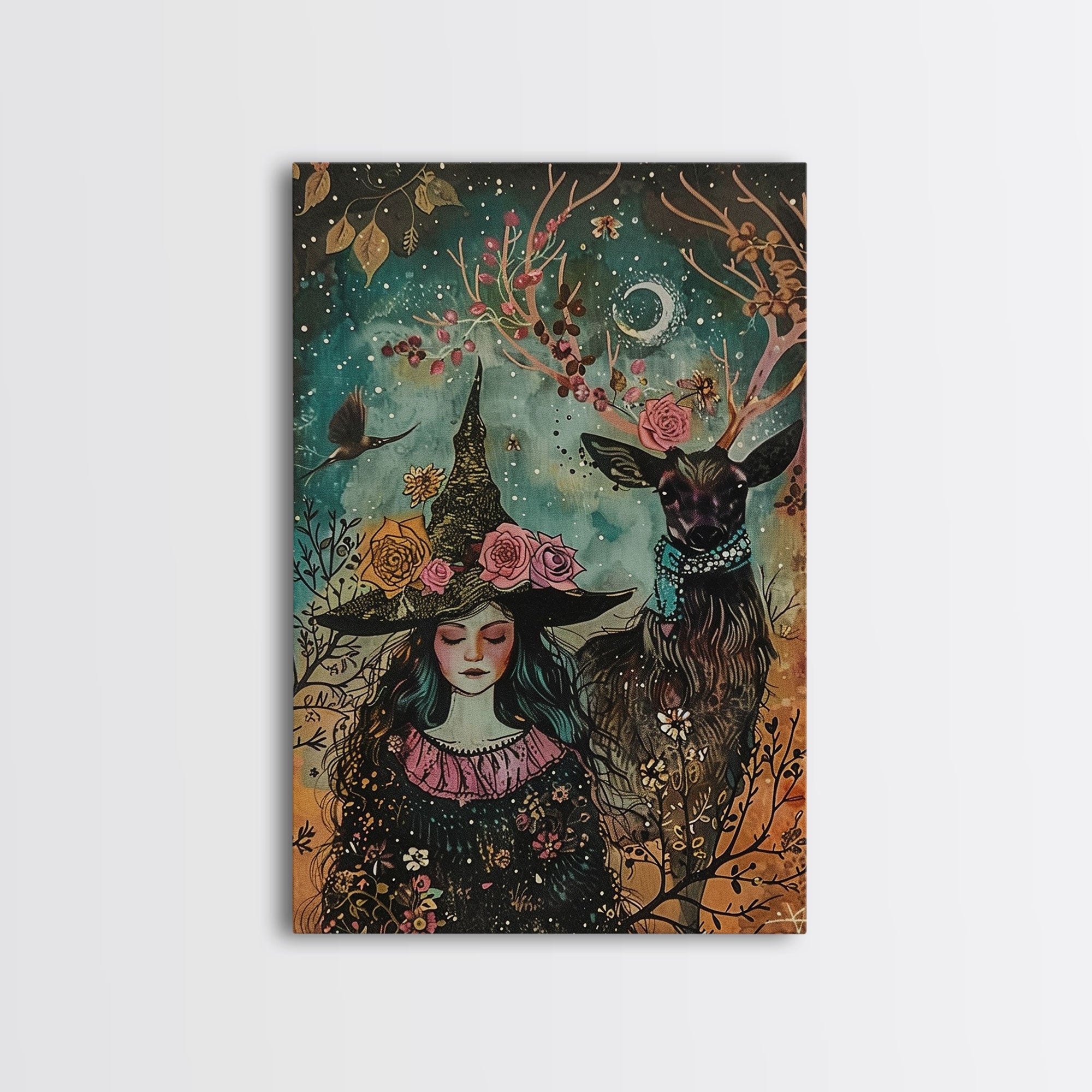 Elegant Witch with Tortoise - Halloween Art, Gothic Art, Spooky Decor, Dark Nature Art, Haunting Portrait, Framed Canvas Print