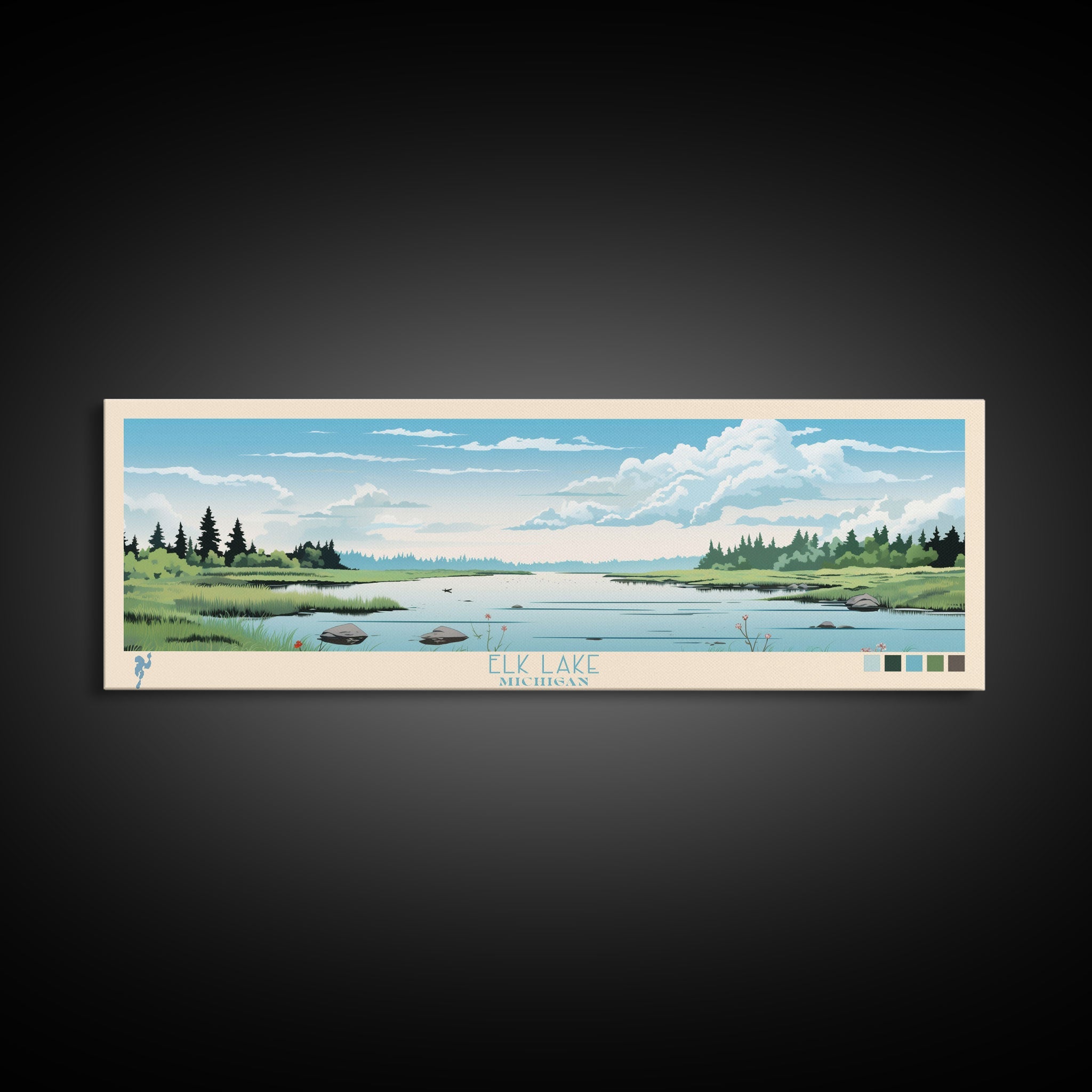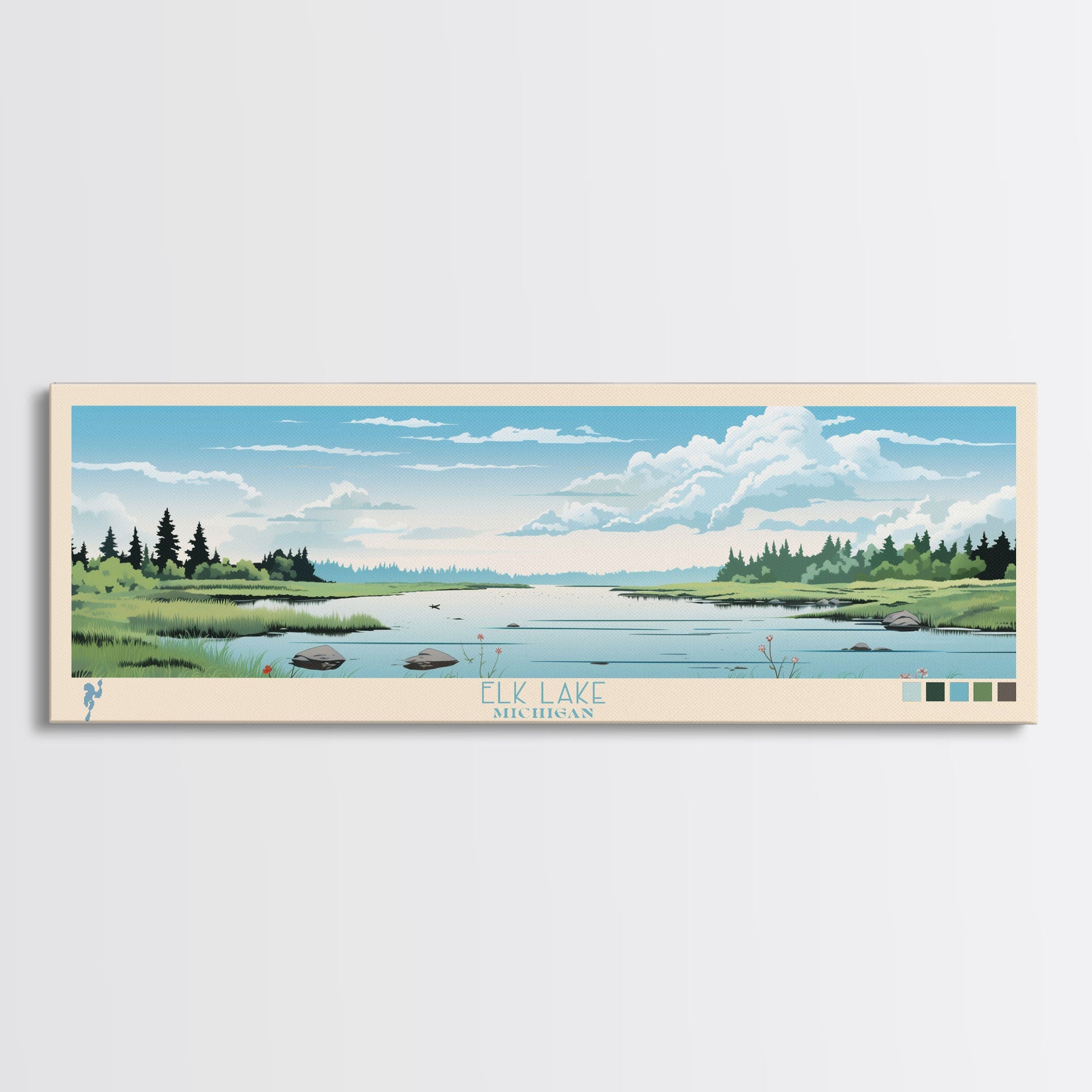 Elk Lake Michigan Framed Canvas Print, Panoramic Wall Art, Midcentury Modern, Pop Art, Bedroom Decor, Travel Poster, Nature Art