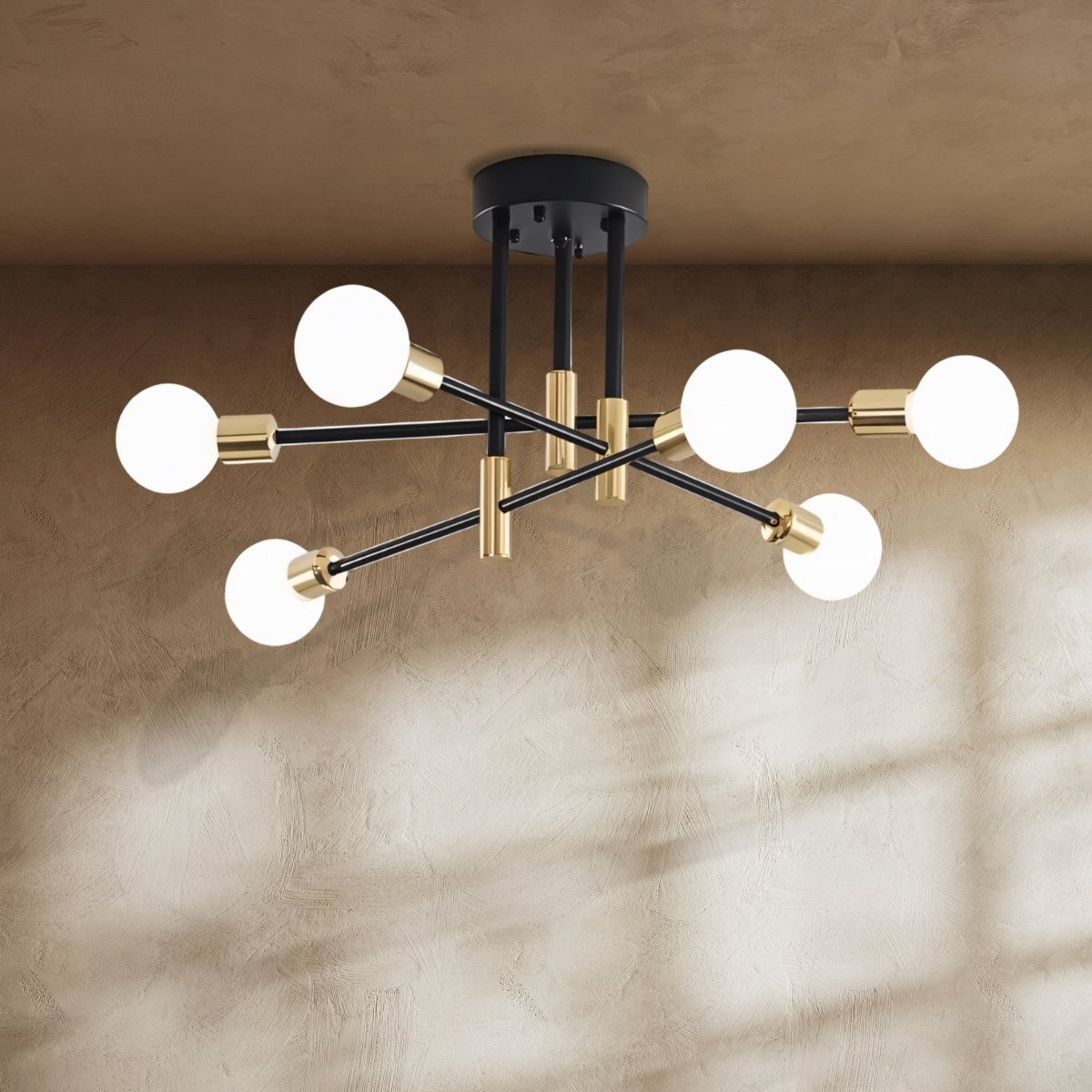 The Elyn Chandelier adds a touch of mid-century modern style to your house and is a chic replacement for traditional lighting fixtures. Its high-quality iron construction and design of intersecting rods with lights at their ends enable the light to radiate without glare and evenly in all directions. The Elyn comes in a range of head styles and has a gorgeous matte black finish with brass gold accents that give it an opulent appearance.