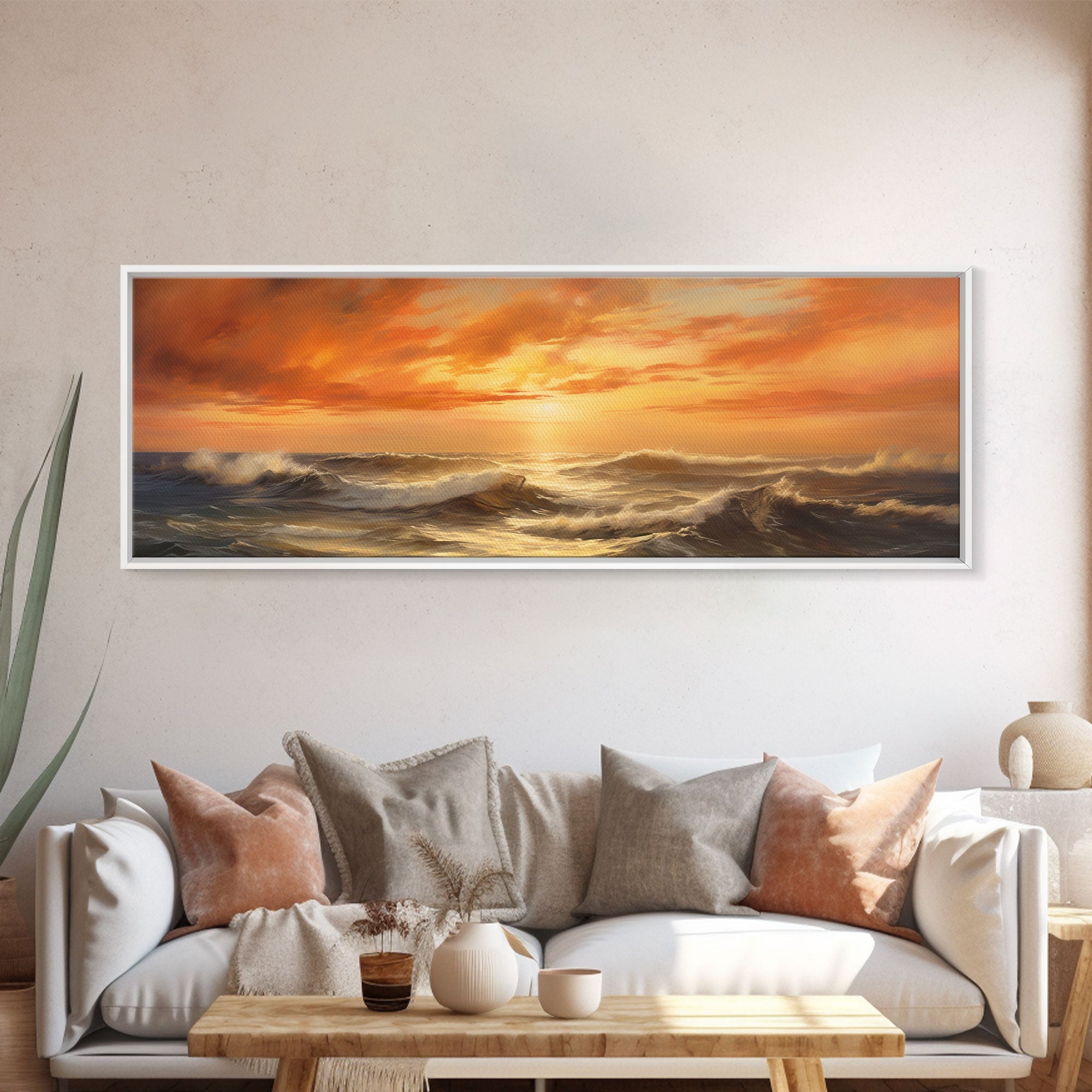 Framed Wall Art Print Set Sunset Horizon on Beach Shore Nature Ocean Oil Painting Nautical Scenic Colorful Multicolor Ultra