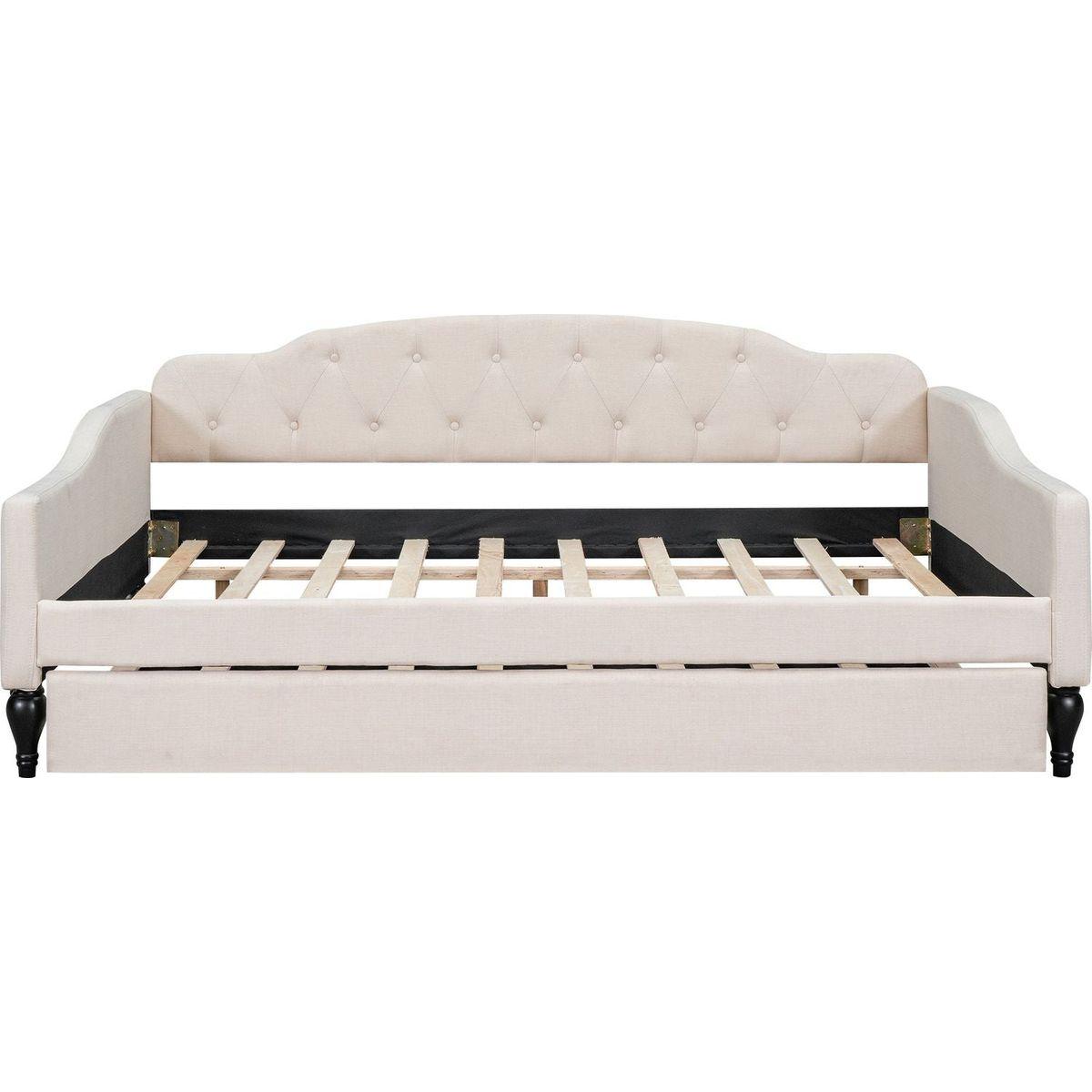 This full-size daybed is the perfect addition to any living space. The fabric selected for the collection features linen designed to last. Crafted with plywood frame with wood supports, this dapper design strikes a glamourous wingback silhouette padded with foam fill and draped in lush upholstery with a deep button tufting. This daybed is an ideal choice for a living room, den, office, or any living space. The design, construction, and overall functionality are certain to grace your interior with added charm.