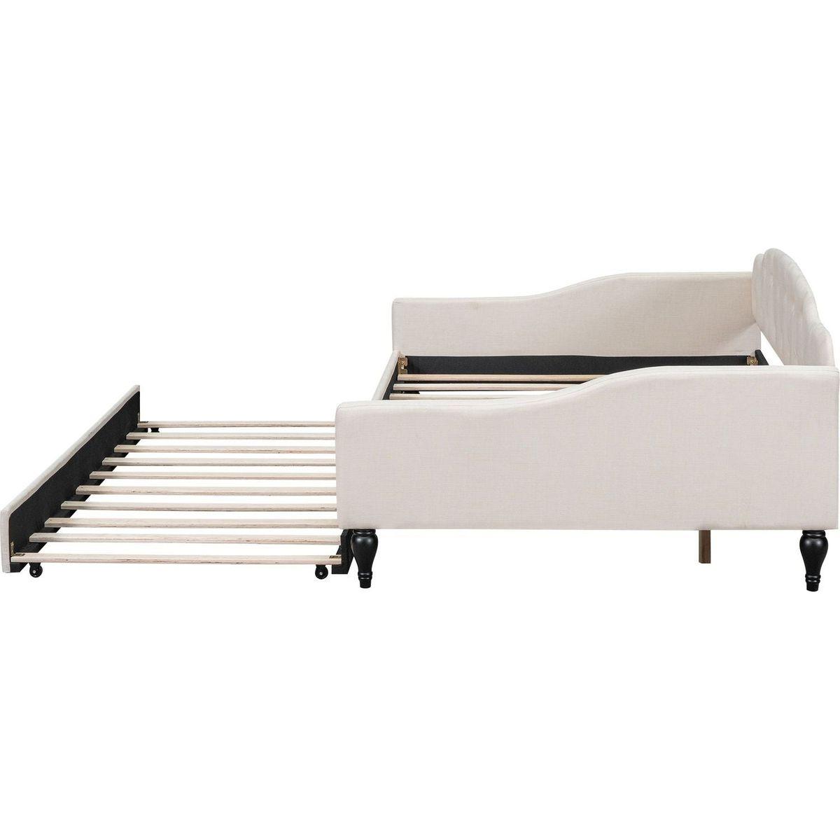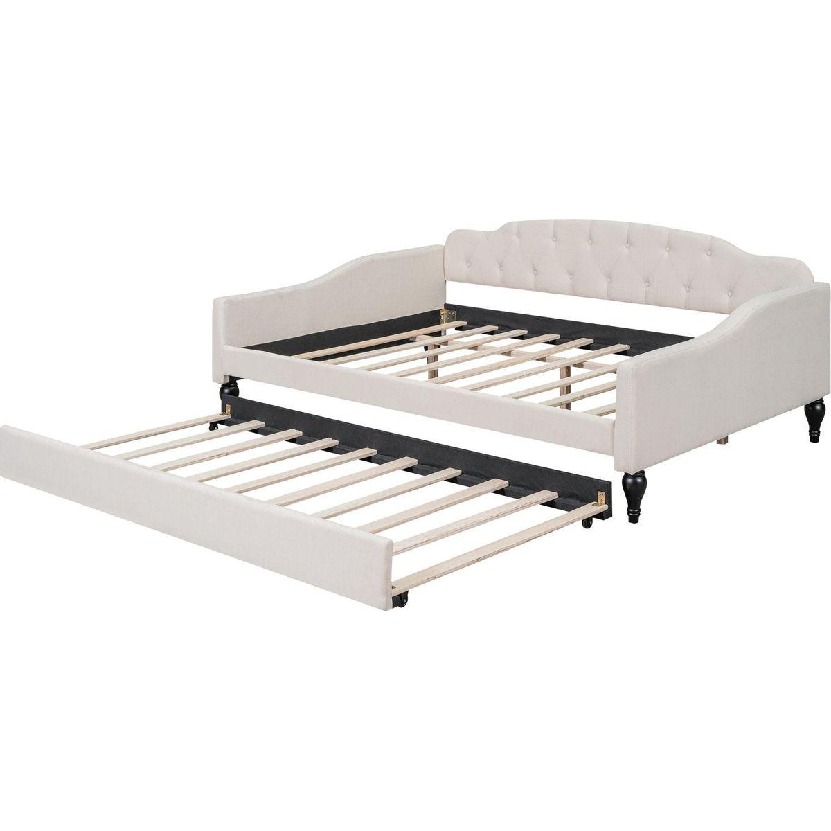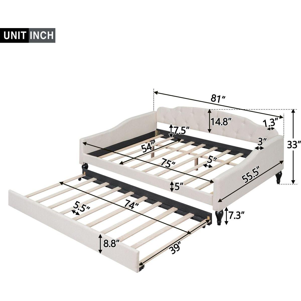 Full Size Upholstered Tufted Daybed Bed with Twin Size Trundle, Beige