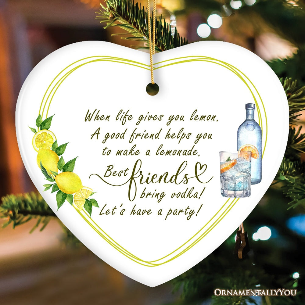 Forget the usual clichés—this ornament redefines friendship with a dash of humor and a twist of lemon! Emblazoned with the witty phrase, "When life gives you lemons, a good friend helps you make lemonade, but best friends bring vodka," it's a tribute to those partners-in-crime who make every moment a celebration. This cheeky keepsake is perfect for adding a splash of fun to your holiday decor or as a quirky gift for your bestie. Let’s raise a glass to laughter and lifelong friendships! 🍋🍸🎉