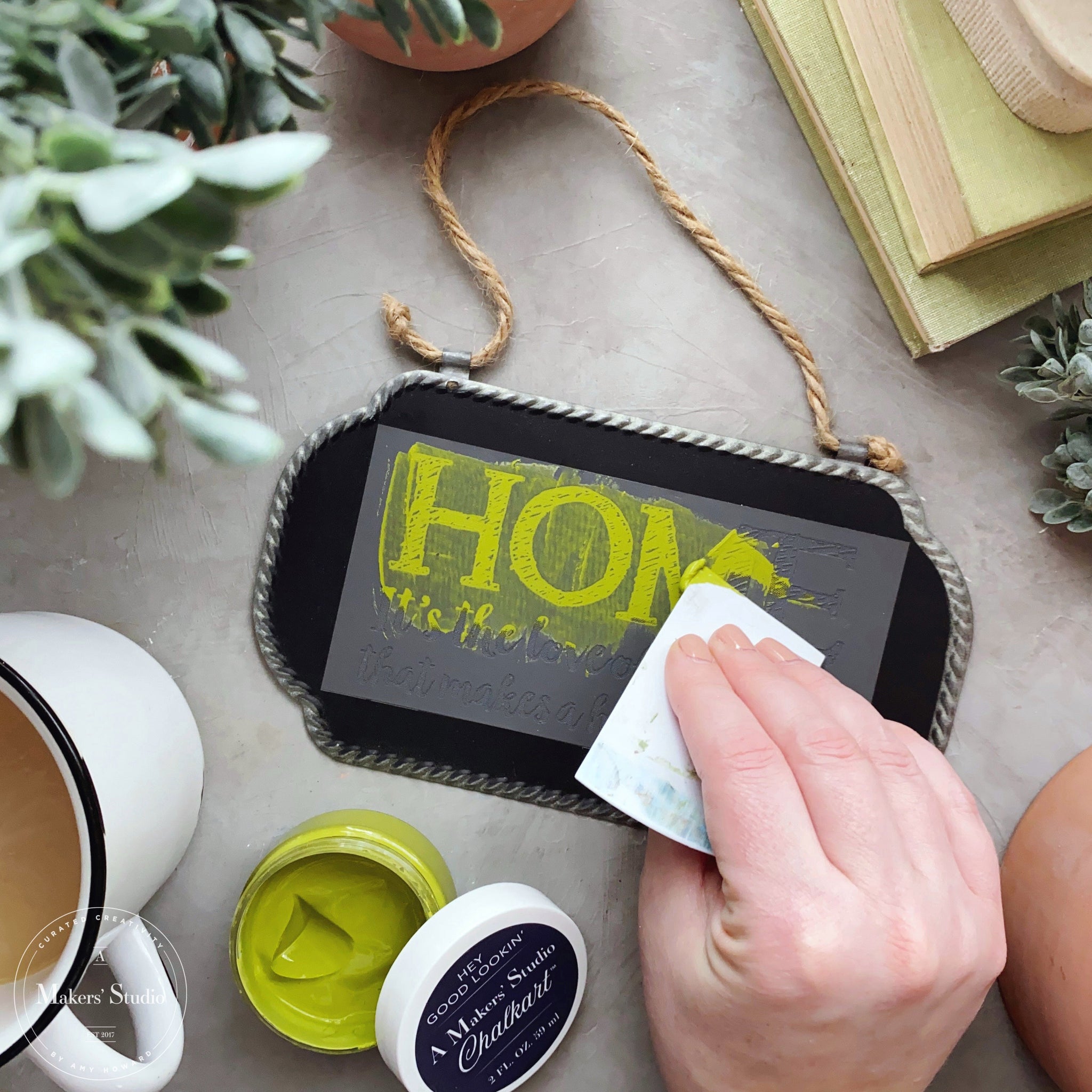 Create beautiful stenciled words and imagery for any occasion! Use over and over again on almost any surface and with almost any finish, from One Step Paint to ChalkArt and even gilding. New and improved design features stronger adhesive, easier cleaning, and simpler transfer between different surfaces.