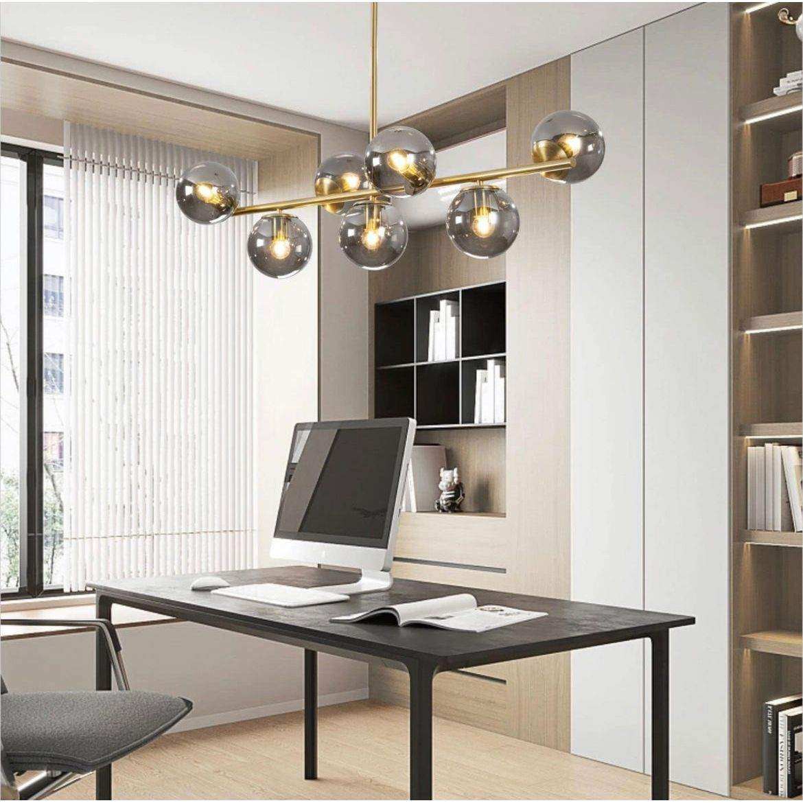 Long Sputnik Chandelier】The gold linear globe chandelier made of brass with brushed brass finish and 7 white spherical glass lampshades, 7 light bulbs are staggered, which enhances the light range. The 7 lights modern sputnik chandelier with white glass globe lampshade, brings a modern and elegant atmosphere and fully lighting up your home.