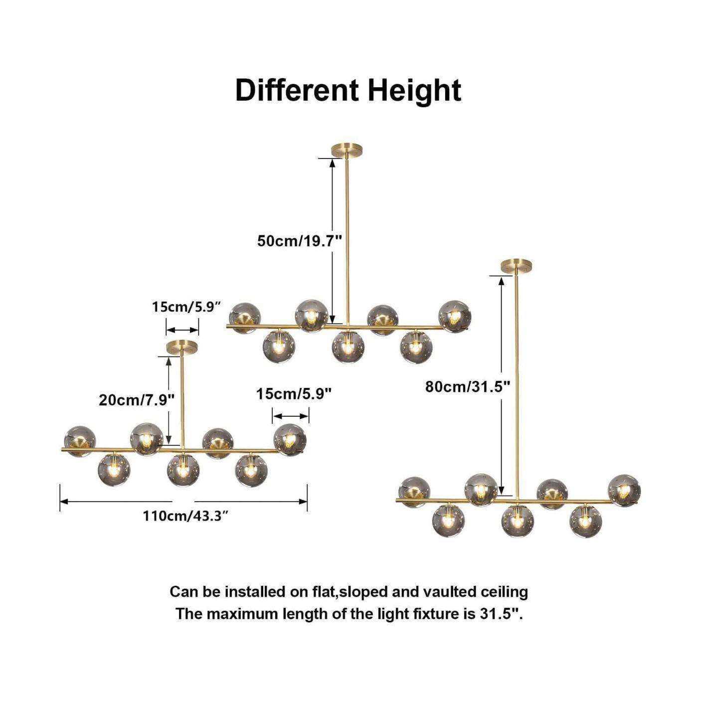 【Brushed Brass Chandelier Size】The modern kitchen island lamps ceiling hanging length: 43.3”(110cm), globe diameter: 5.9”(15cm)(Globe replacement ASIN: B083H7PCR8), extension rods: 7.9”+11.8”+11.8”(20+30+30cm)(If need extra extension rod, we will send you free), canopy: 5.9”(15cm). Light source: E26 base (Light bulb replacement ASIN:B081WVNCVM), voltage: 110-240V for worldwide. Globe chandelier can be dimmable when work with dimmable bulb and dimmable switch.