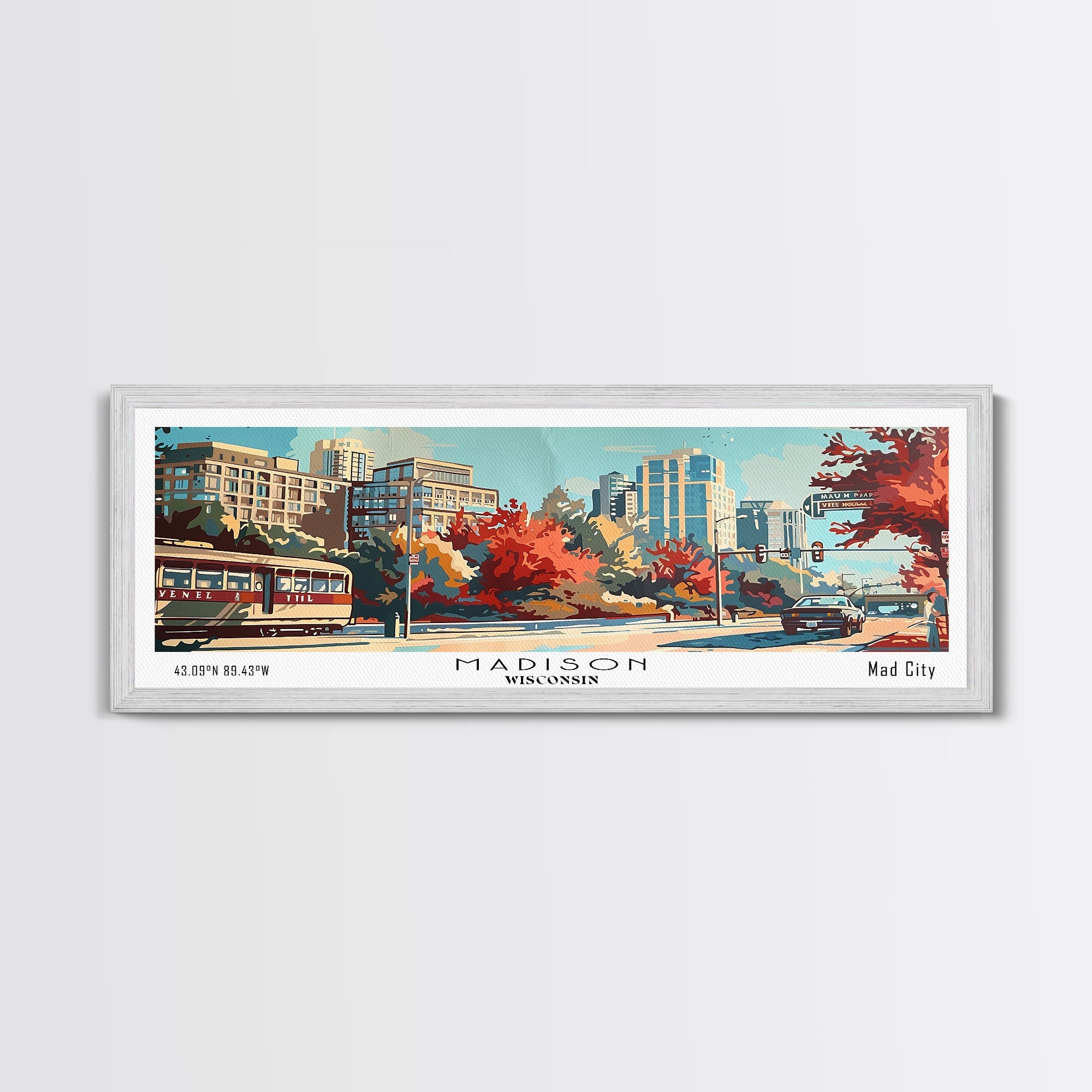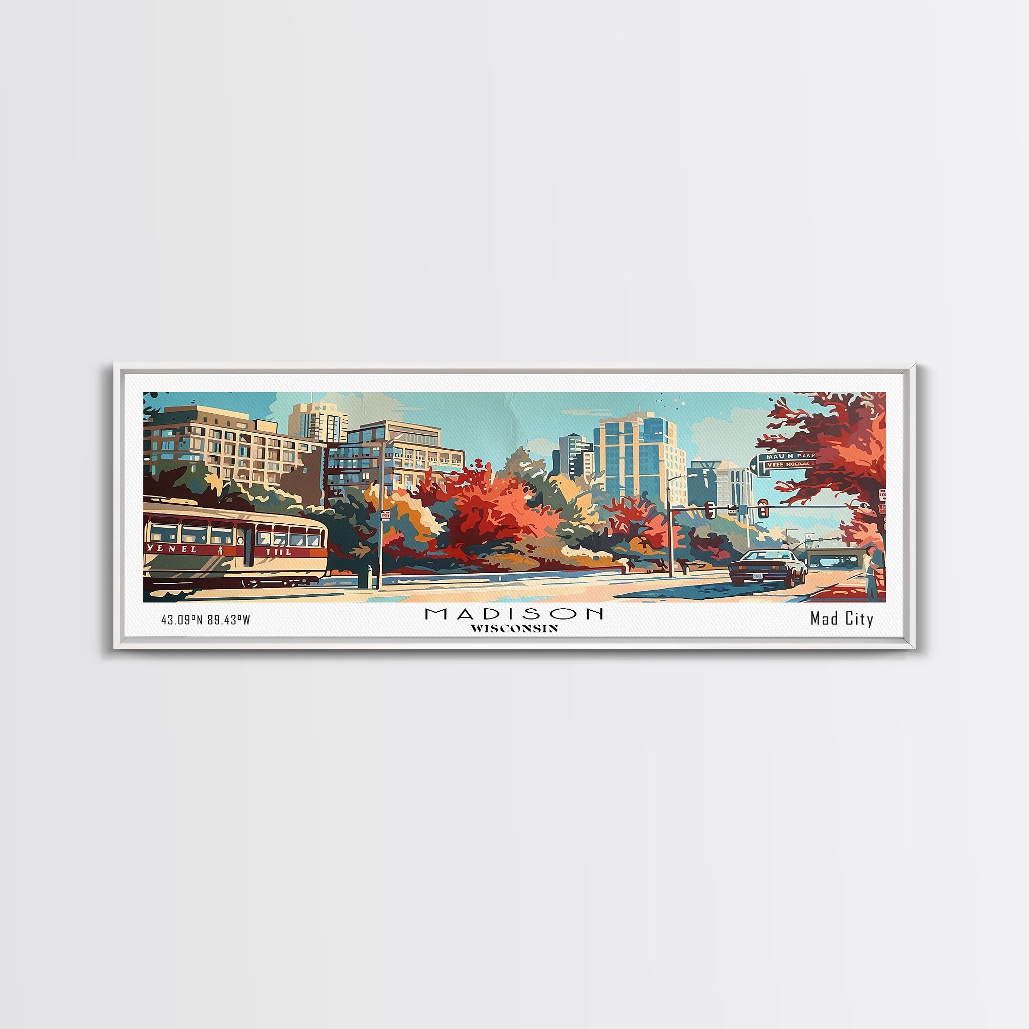 Madison Wisconsin Panoramic Painting, Mid Century Modern Framed Canvas Print, Retro Pop Art Travel Poster, Wall Art, Home Decor, Office Wall Art, Living Room Decor