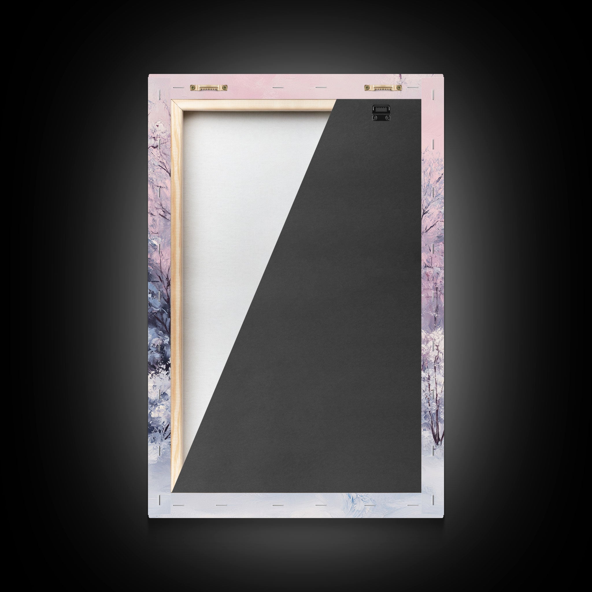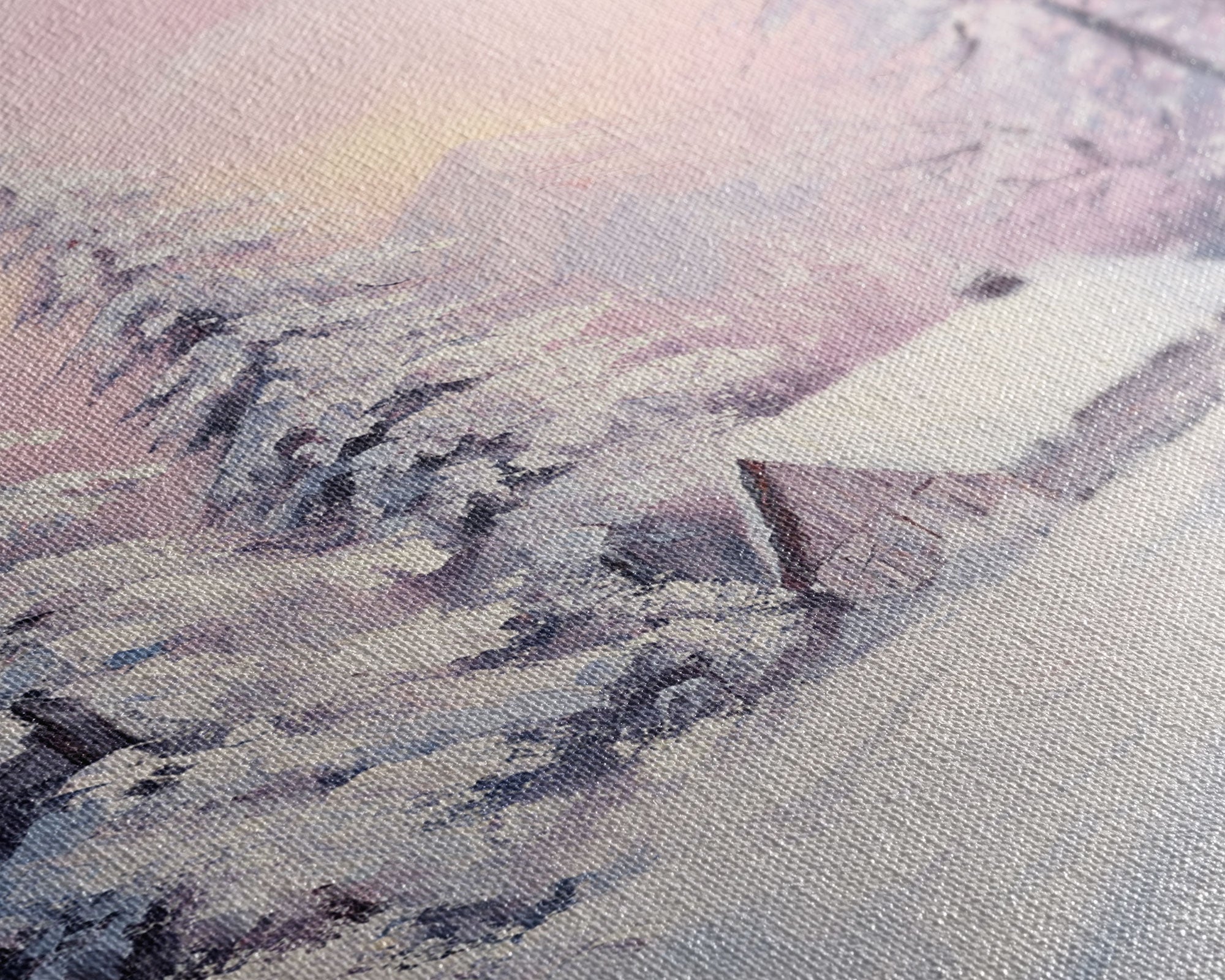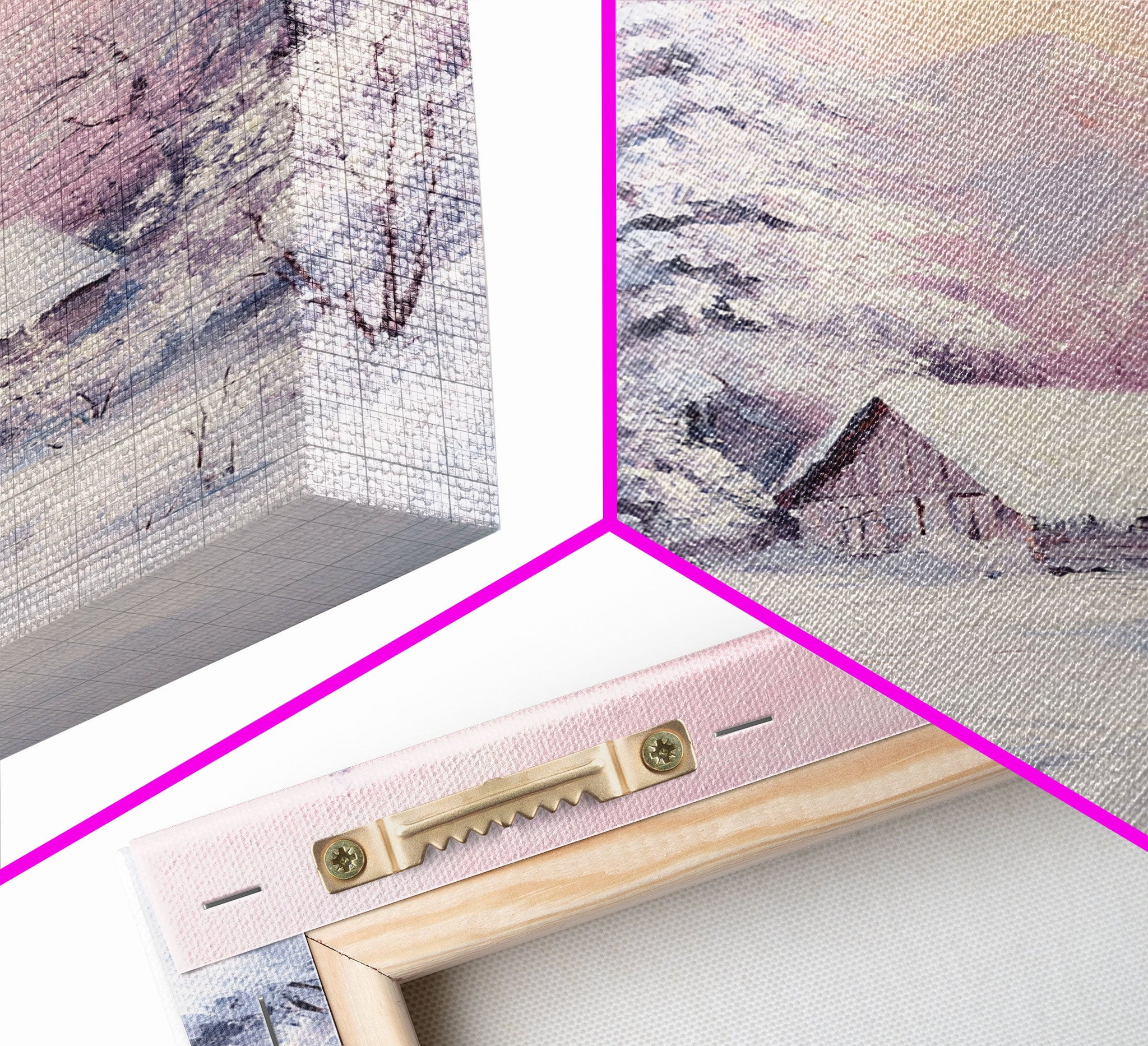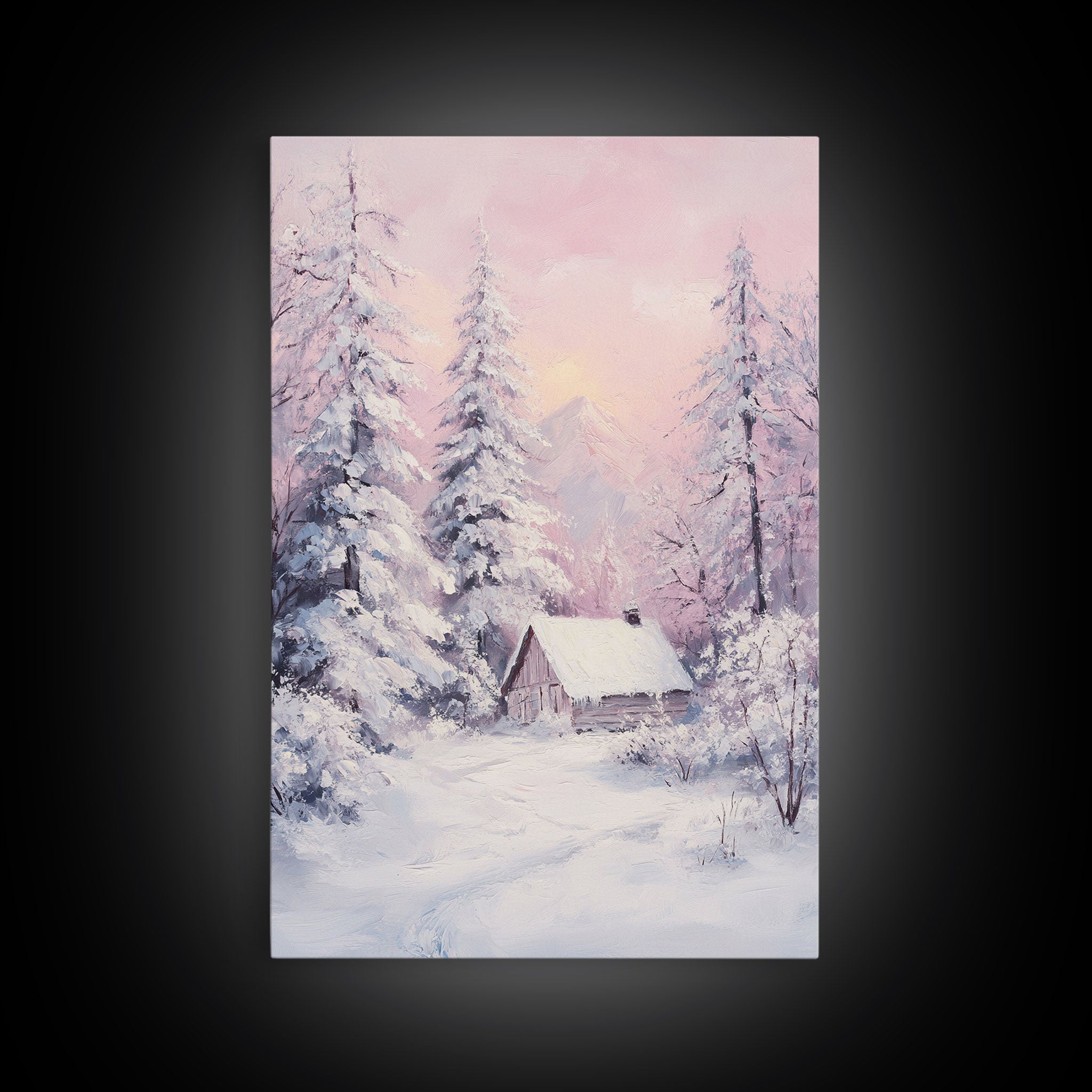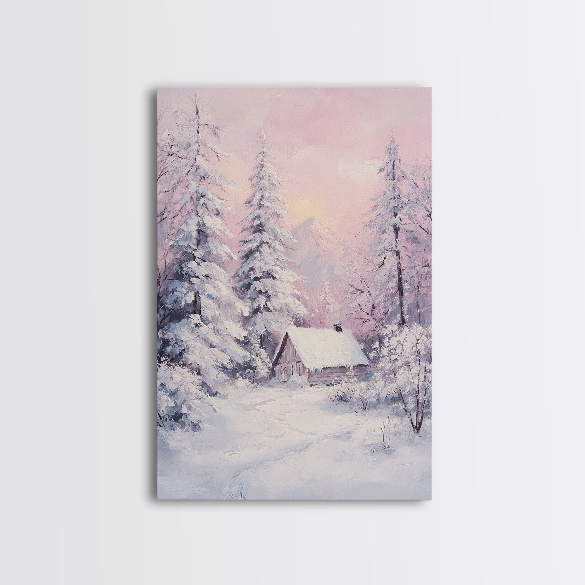 Pink Snowy Cabin Landscape Framed Canvas Print Wall Art Winter Wonderland Decor, Christmas Art Gift, Rustic Winter Scene Art