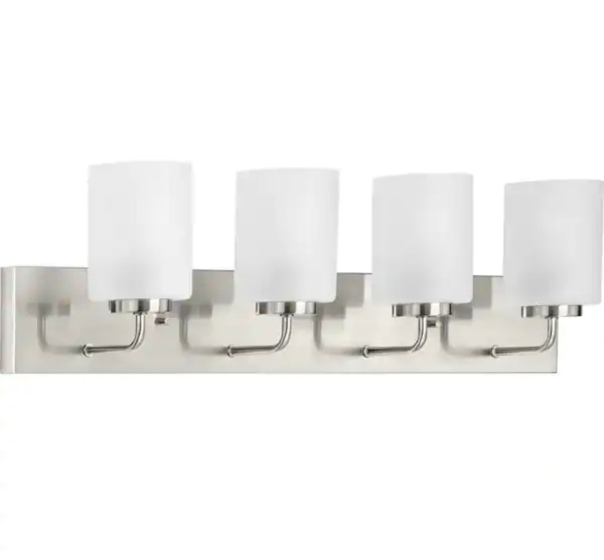 Incorporate a clean, contemporary design with the Merry Collection 4-Light Etched Glass Brushed Nickel Transitional Bath Vanity Light. Light sources glow from within crisp etched glass shades for a generous elegant glow sure to transform any bath to a modern retreat. The rectangular backplate, curved arms, and round light bases are coated a beautiful brushed nickel finish that perfectly blends transitional and modern character. For ideal illumination, use 4 medium base bulbs that are sold separately (100-Watt maximum- LED/CFL/incandescent). The bath light is compatible with dimmable bulbs. The bath vanity light's contemporary design is ideal for any bathroom modern transitional style settings. It's time to breathe new life to the mundane every day with timeless and truly transformative lighting. Make your purchase today to begin your journey to a whole new lighting experience. Progress Lighting products are designed for exceptional quality, reliability, and functionality.