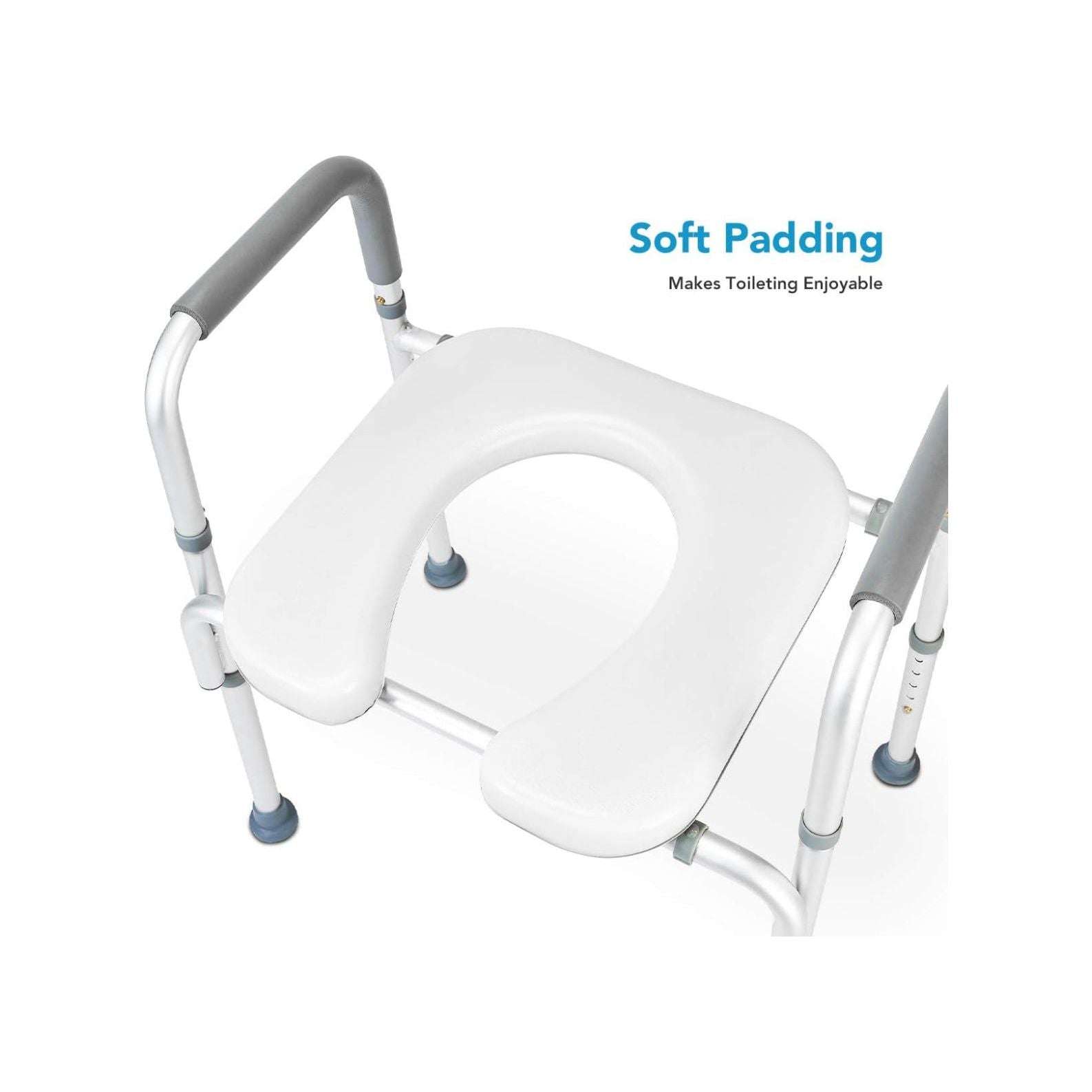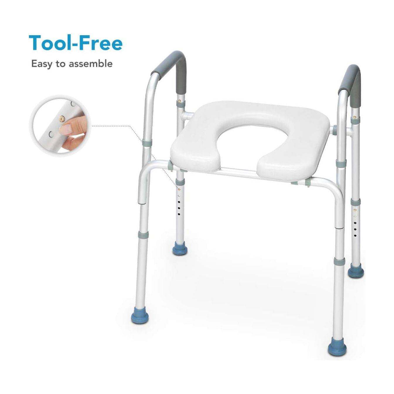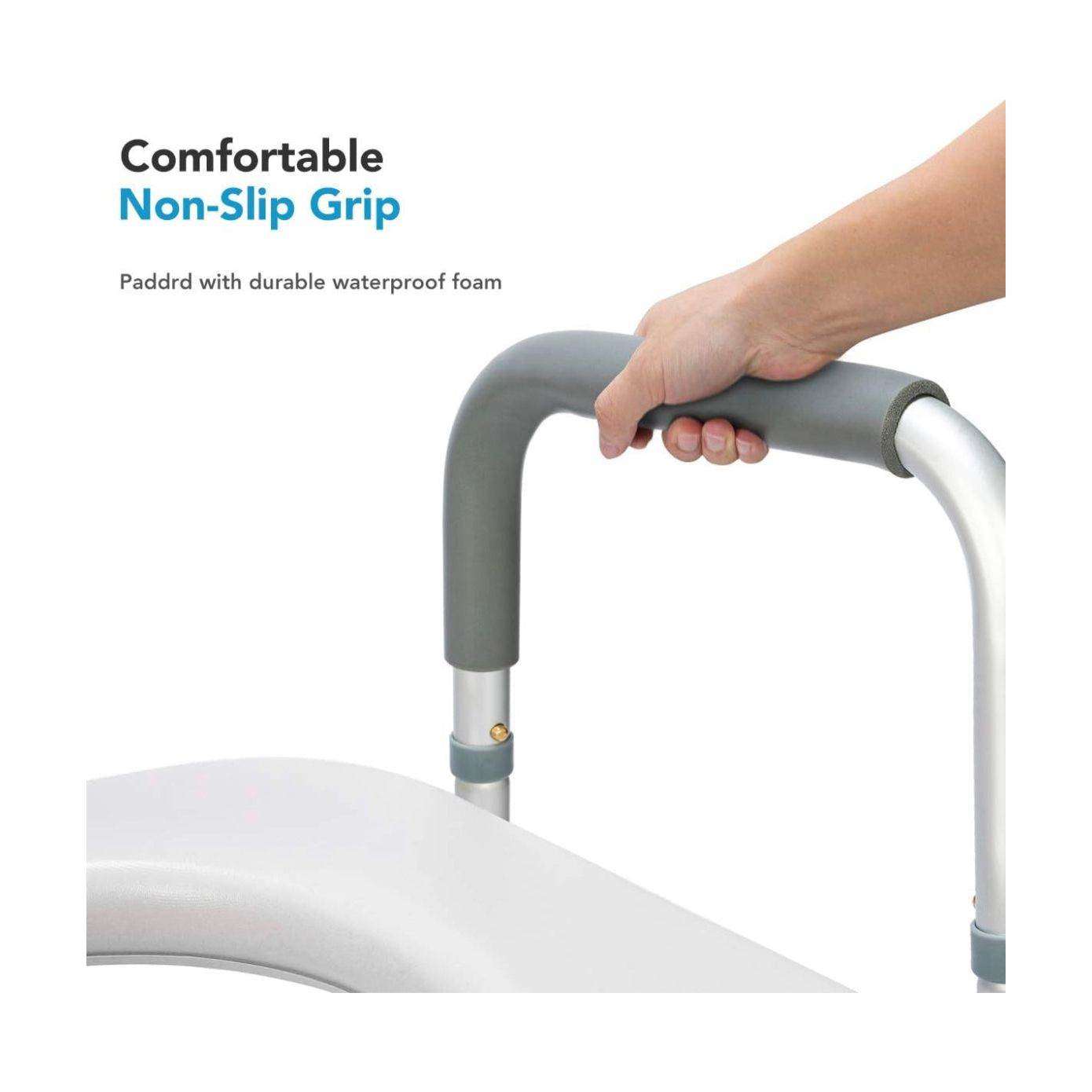 - Padded Grip and Non-Slip Tip: Toilet chair for elderly and disabled is padded with a soft rubber for superior support. The textured rubber handles create a comfortable, non-slip surface for a safe and secure grip when sitting or standing. Each outside leg is capped with a non-skid, non-slip tip for a safe and secure experience.