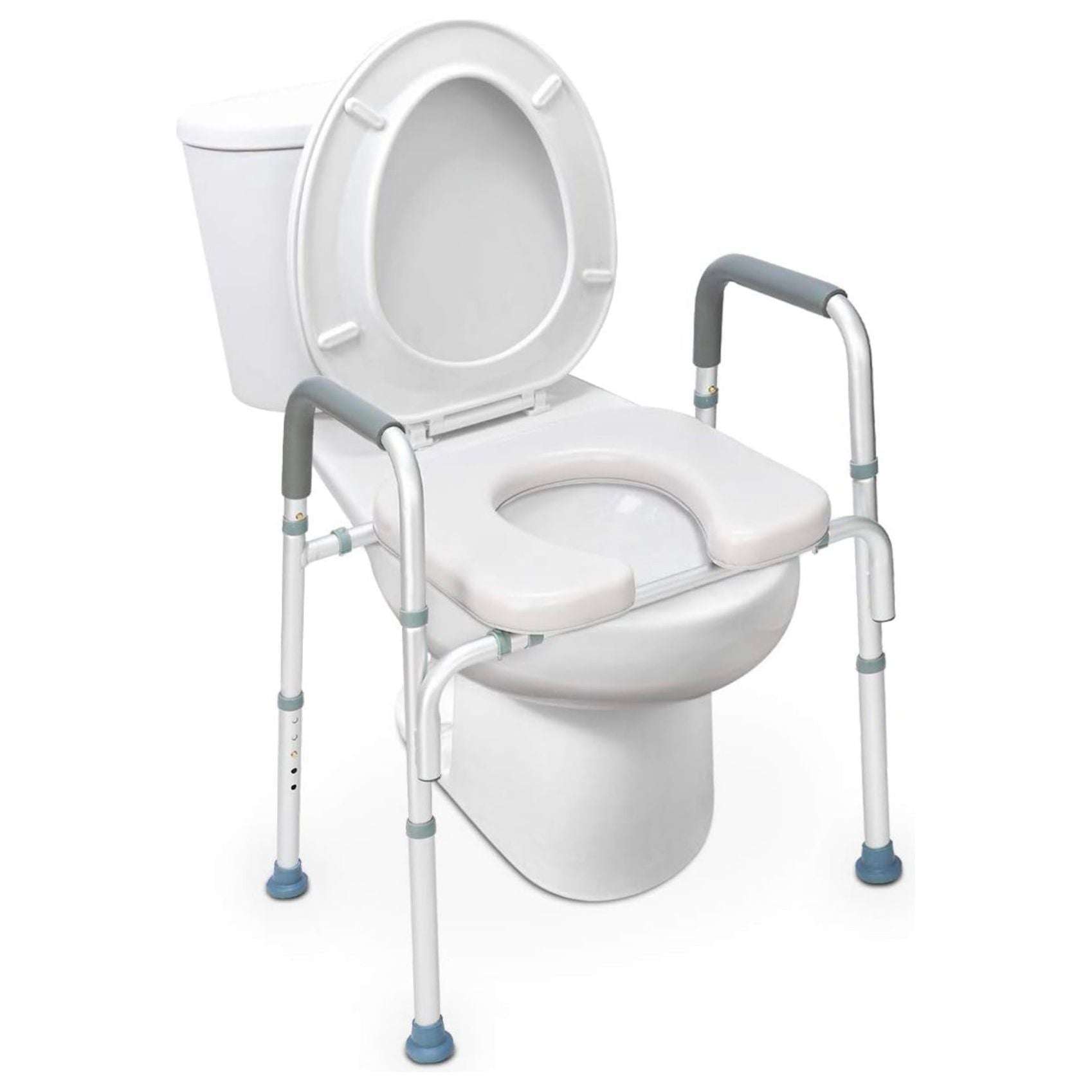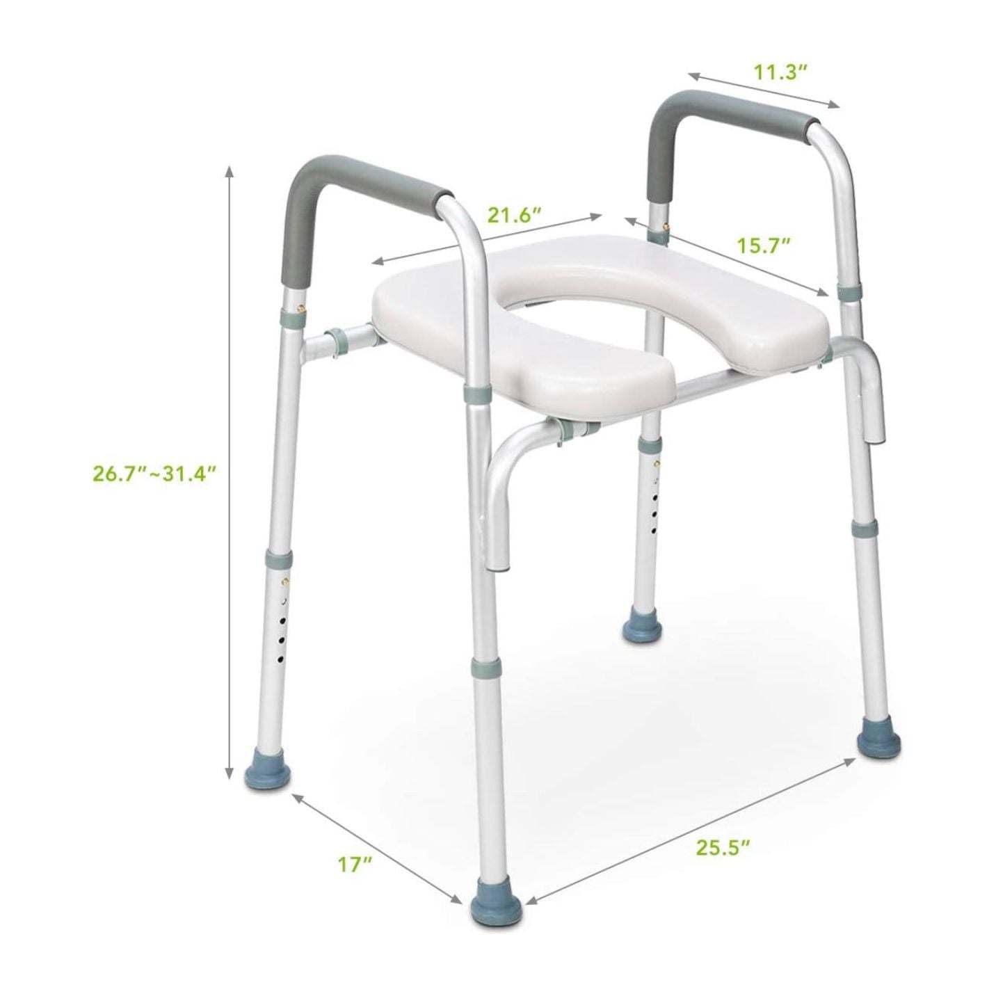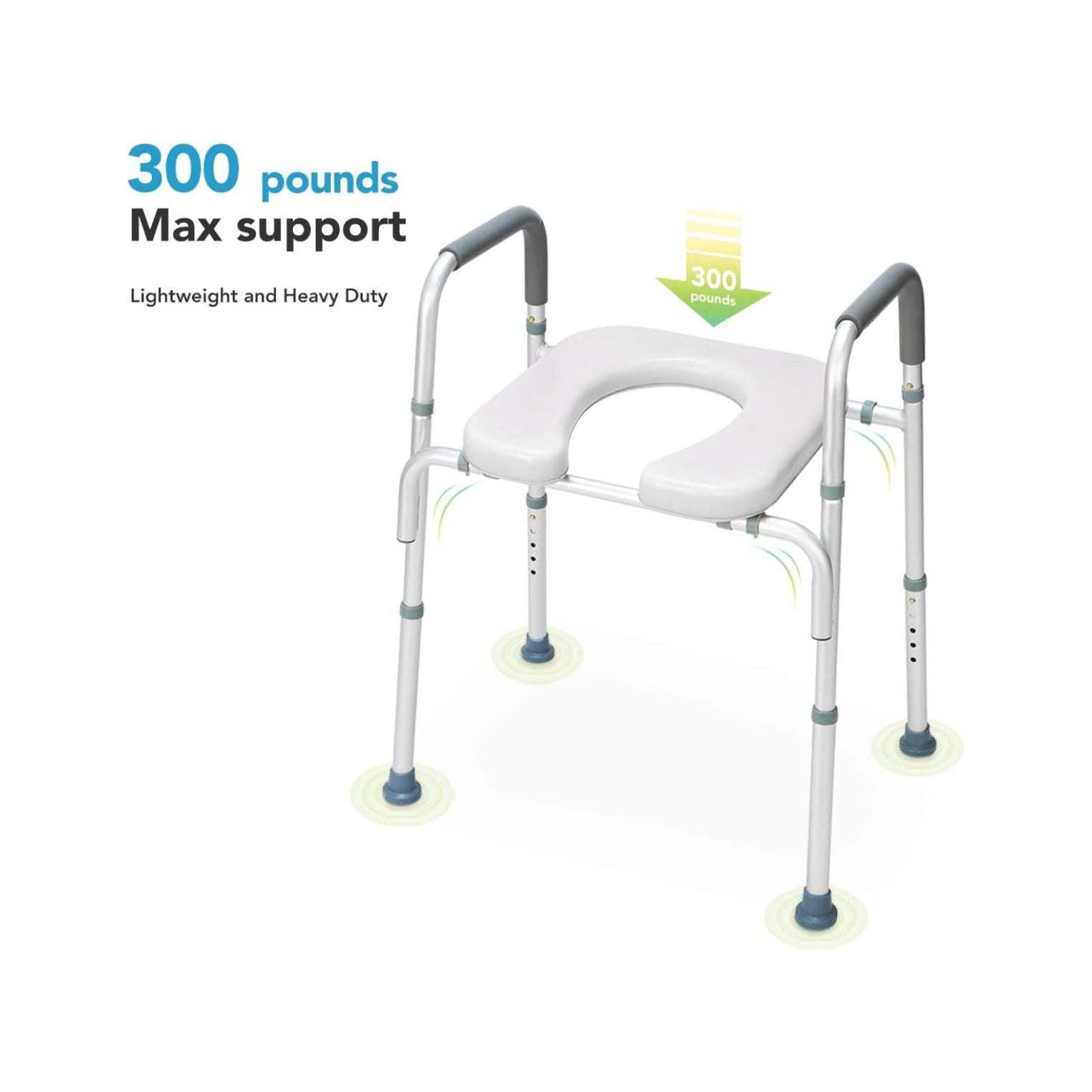 - Padded Grip and Non-Slip Tip: Toilet chair for elderly and disabled is padded with a soft rubber for superior support. The textured rubber handles create a comfortable, non-slip surface for a safe and secure grip when sitting or standing. Each outside leg is capped with a non-skid, non-slip tip for a safe and secure experience.
