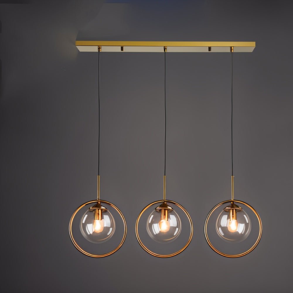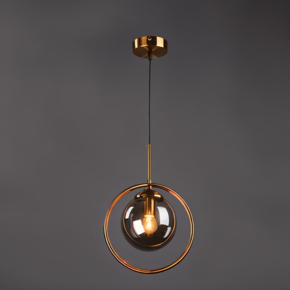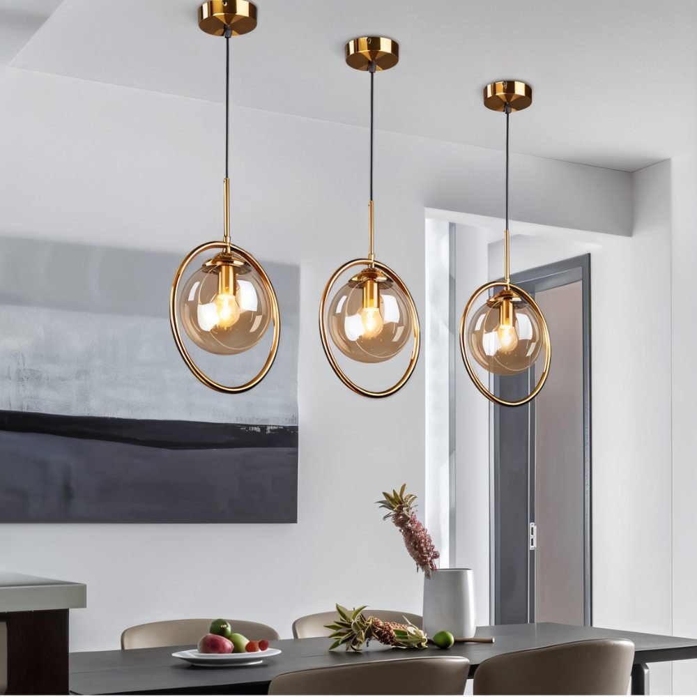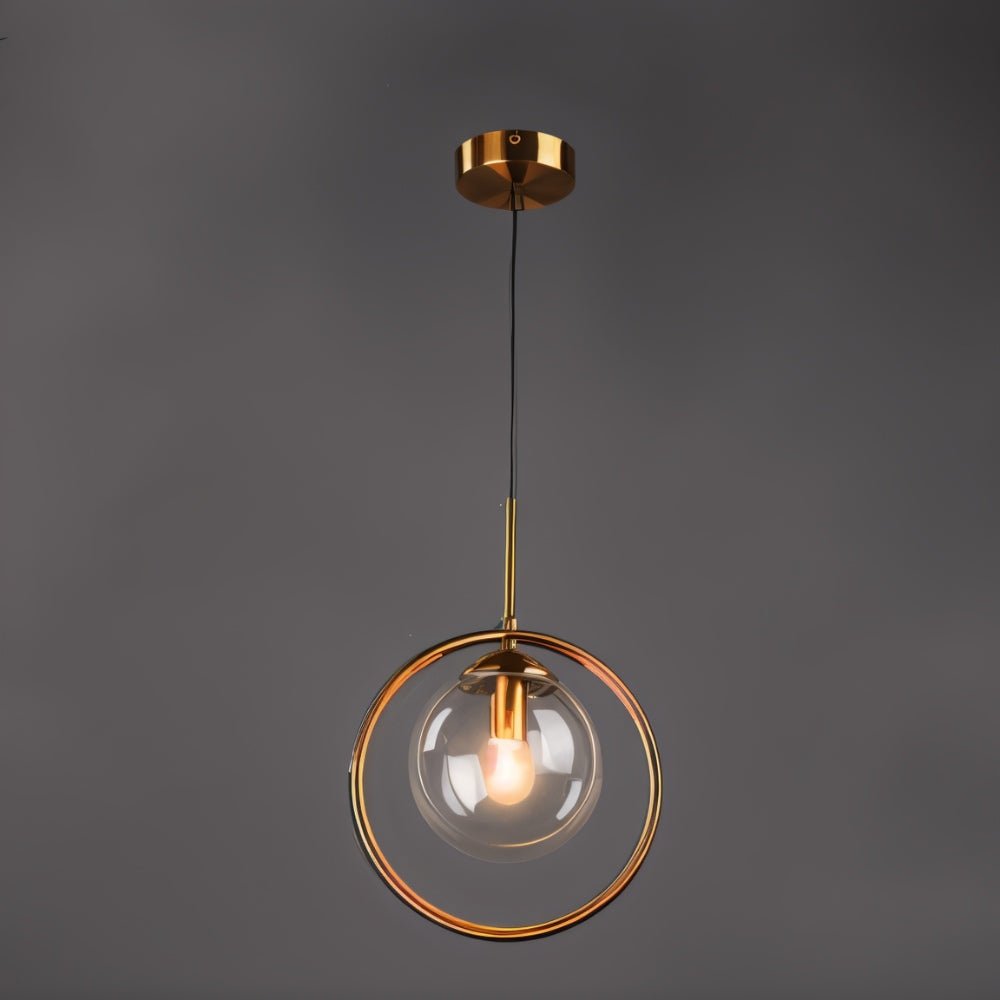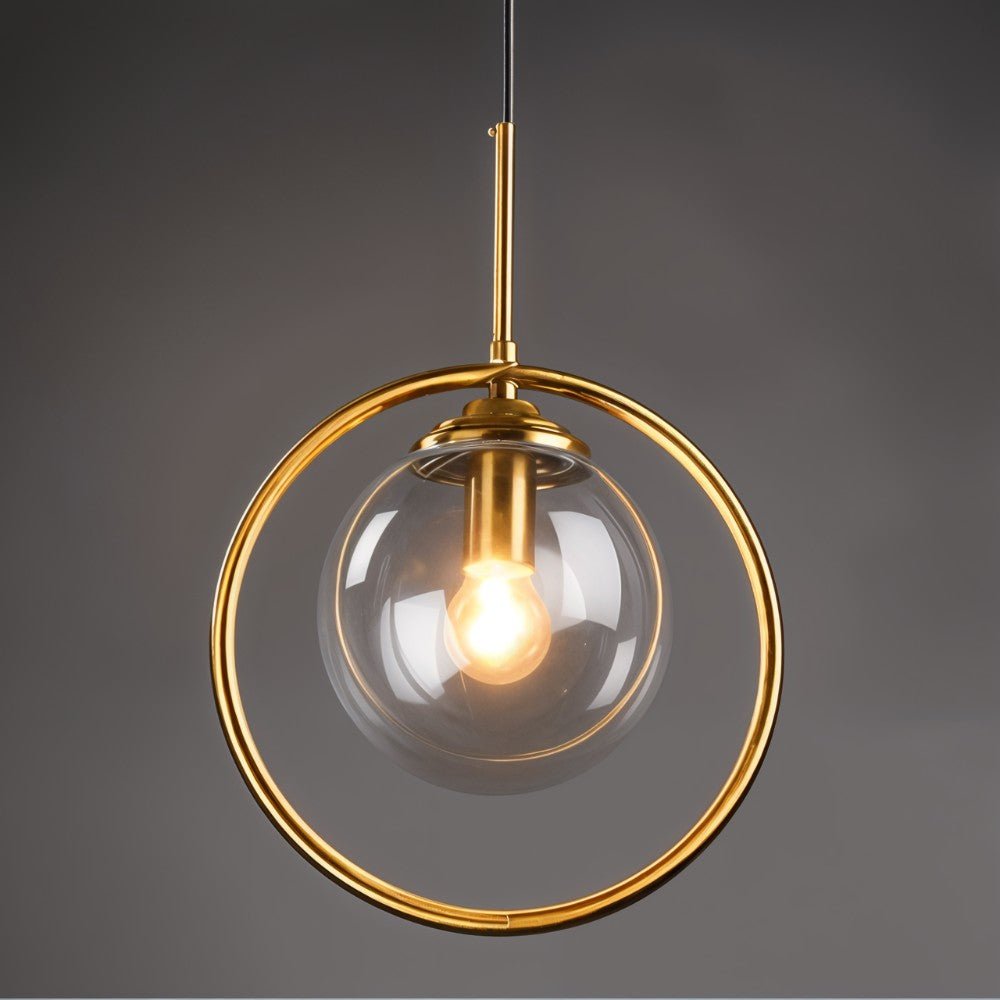 The Ring Pendant Light features a captivating design with a clear glass globe suspended within a sleek gold metal ring. This modern light fixture creates a warm and inviting atmosphere, perfect for illuminating dining rooms, kitchens, and living spaces. Its unique design adds a touch of sophistication to any contemporary interior