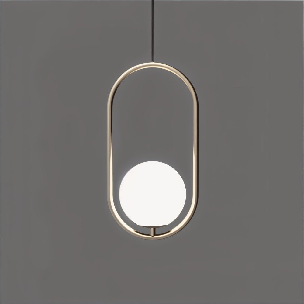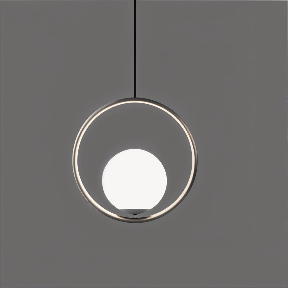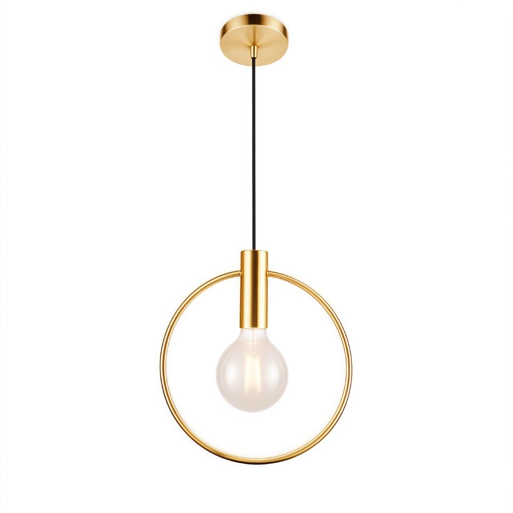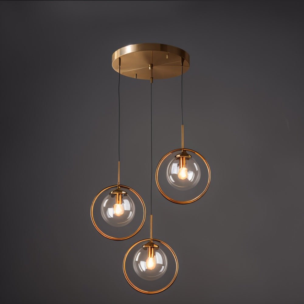 The Ring Pendant Light features a captivating design with a clear glass globe suspended within a sleek gold metal ring. This modern light fixture creates a warm and inviting atmosphere, perfect for illuminating dining rooms, kitchens, and living spaces. Its unique design adds a touch of sophistication to any contemporary interior