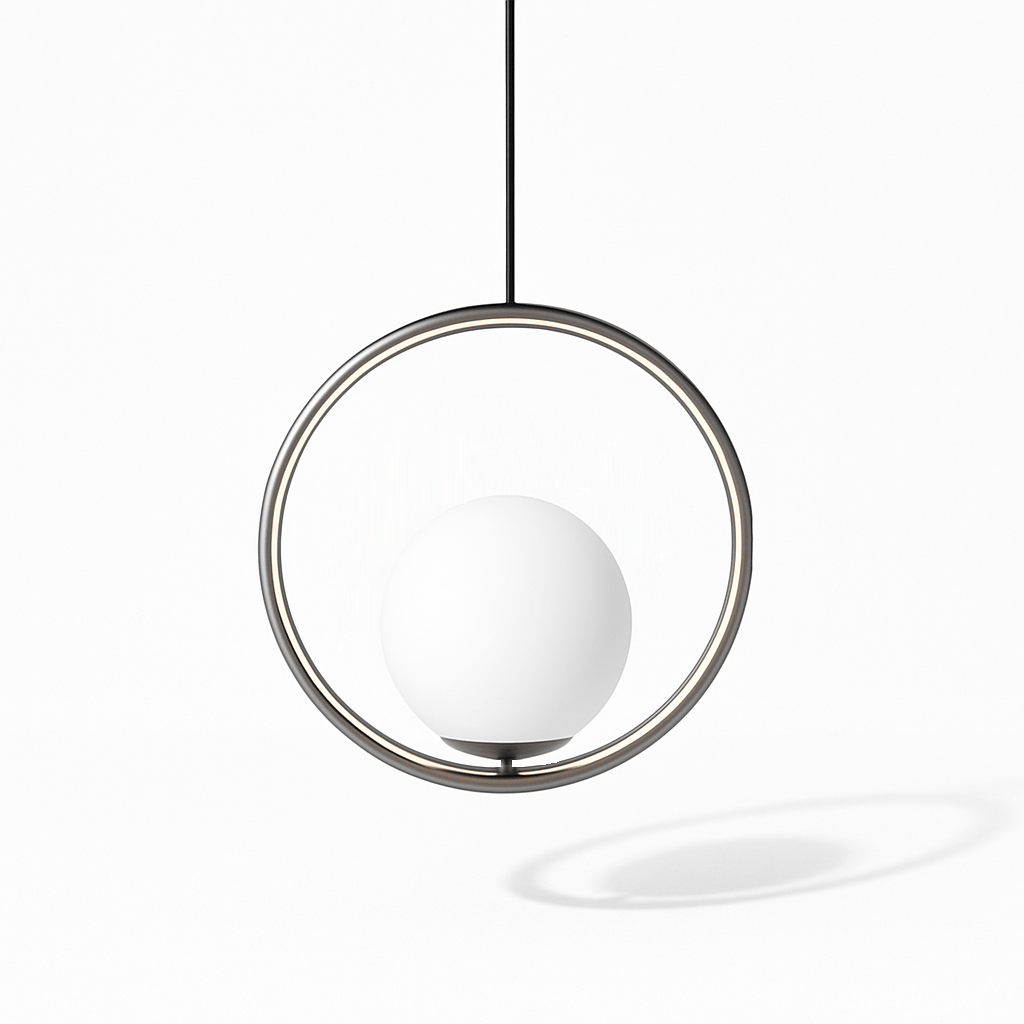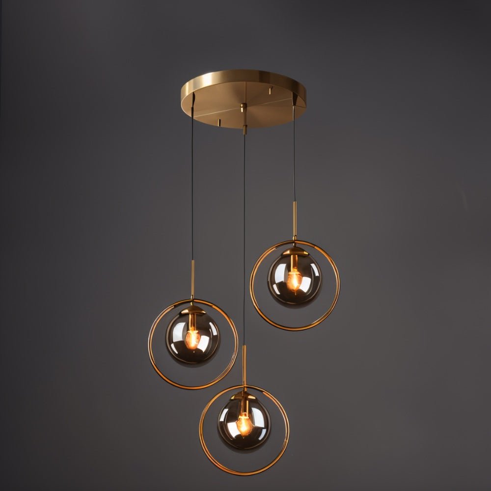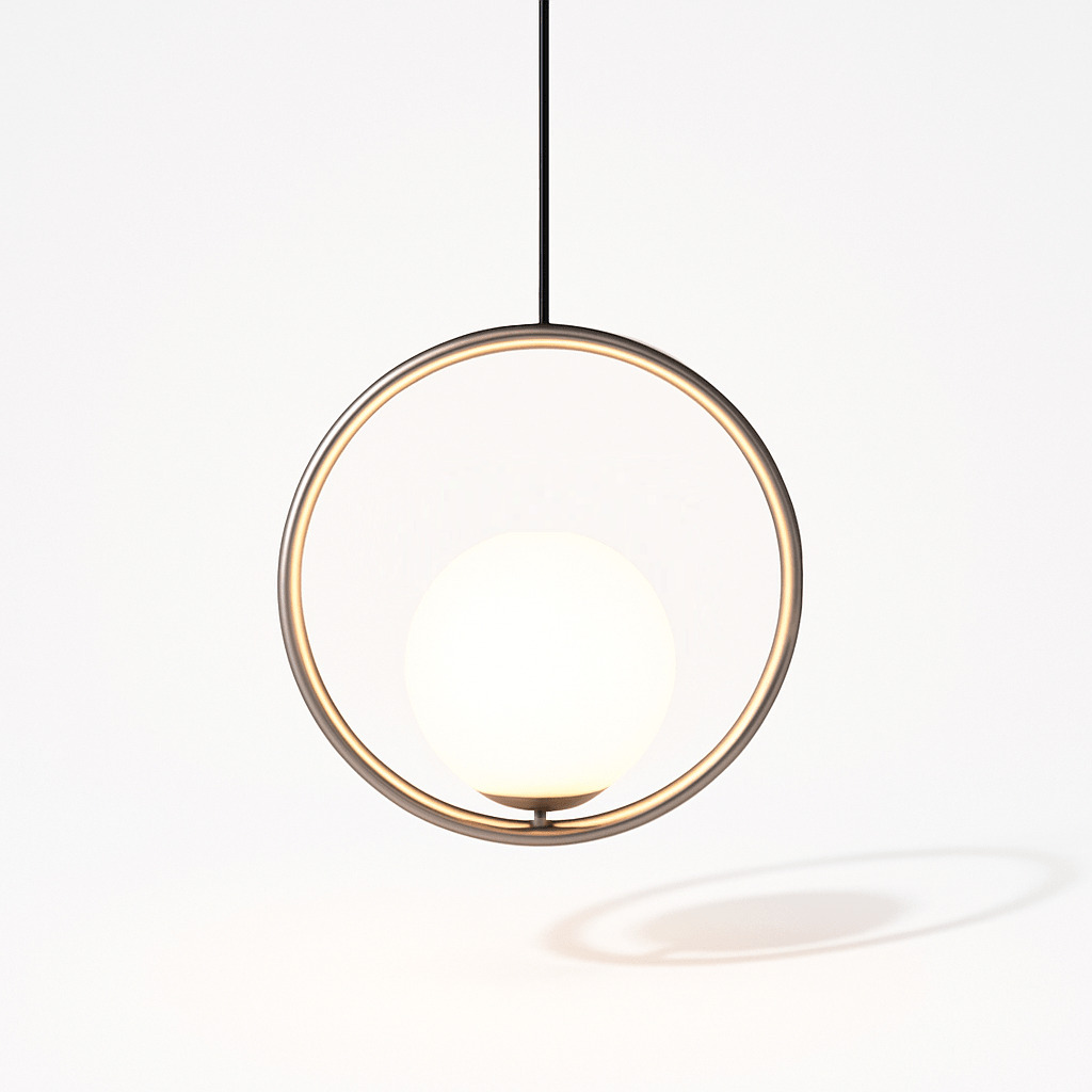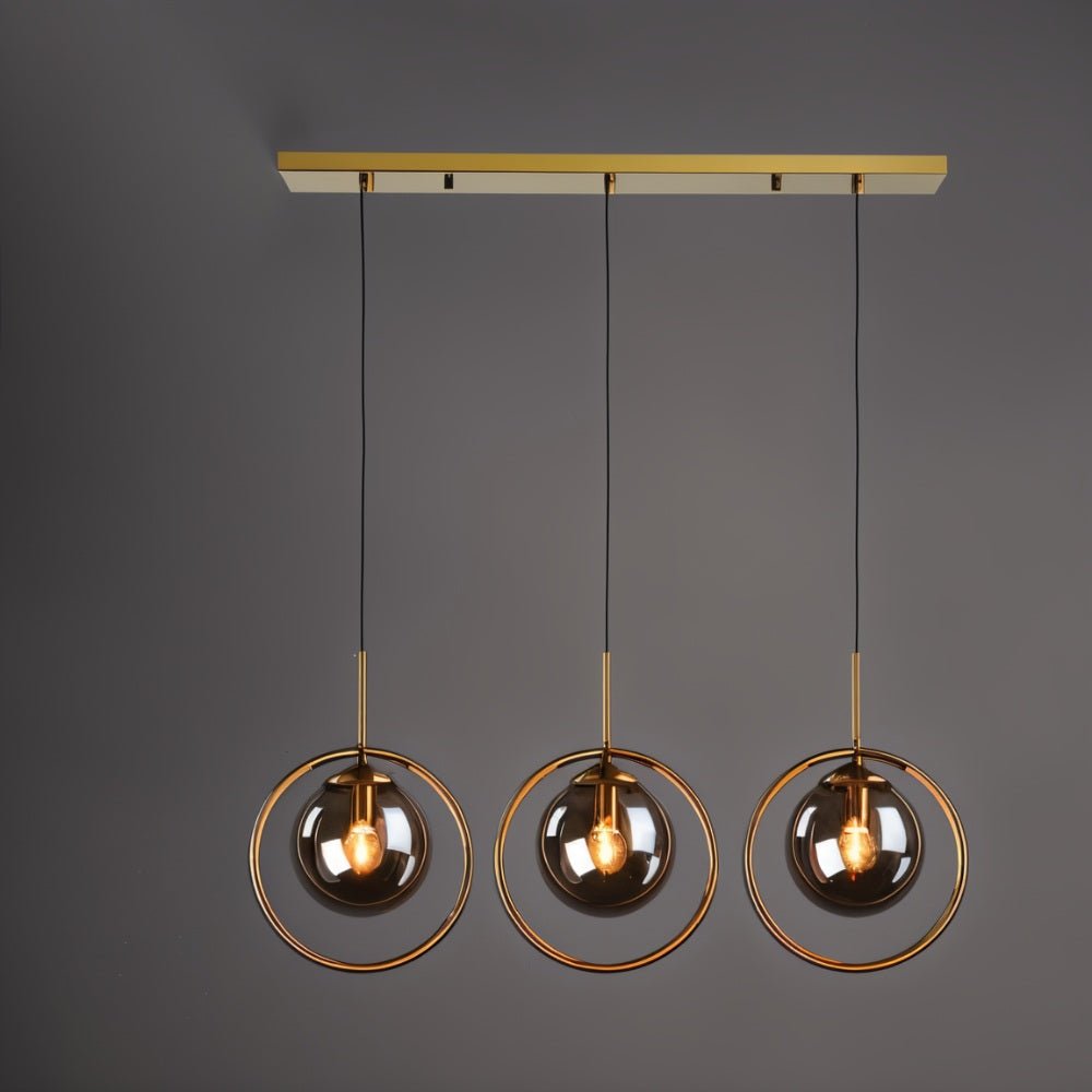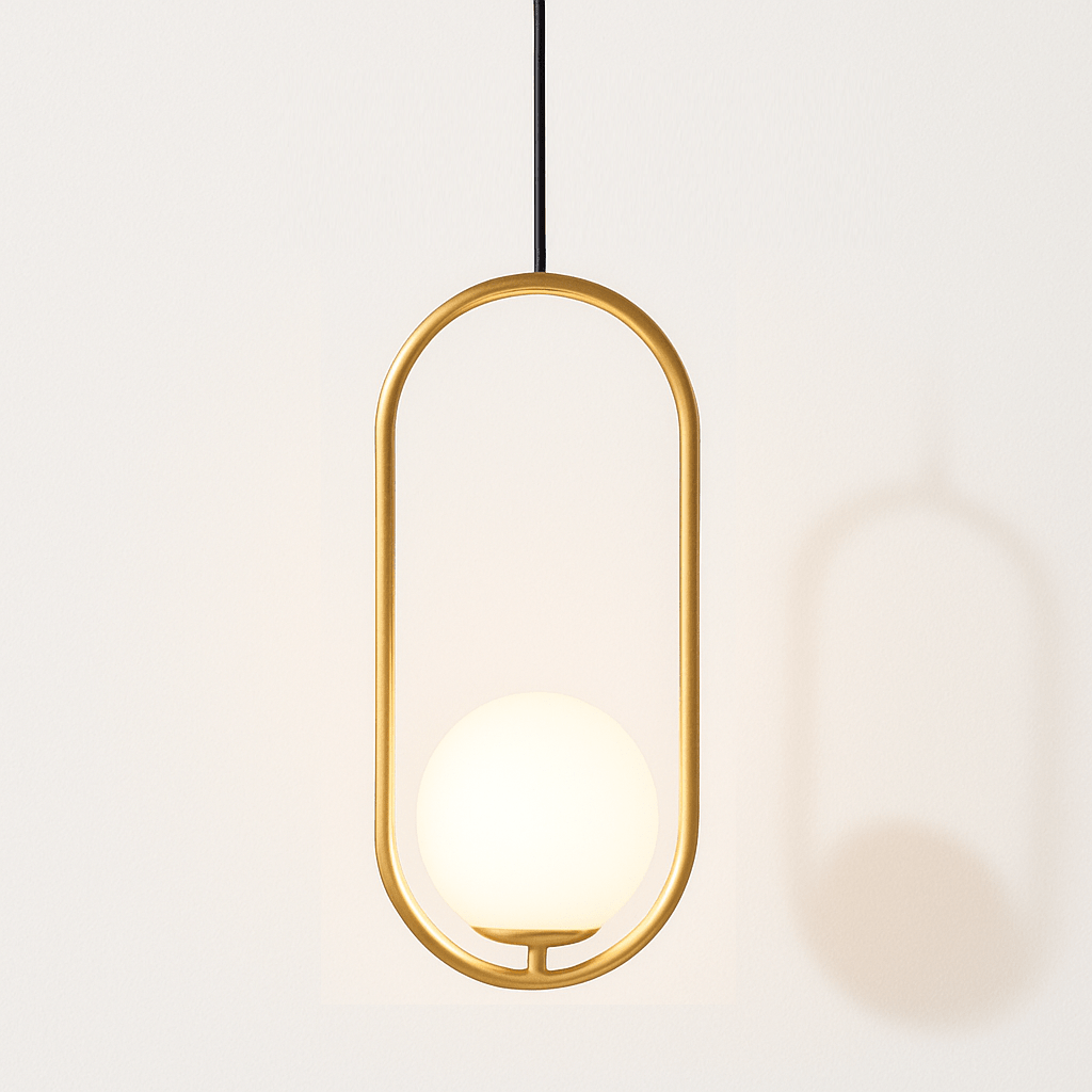 The Ring Pendant Light features a captivating design with a clear glass globe suspended within a sleek gold metal ring. This modern light fixture creates a warm and inviting atmosphere, perfect for illuminating dining rooms, kitchens, and living spaces. Its unique design adds a touch of sophistication to any contemporary interior