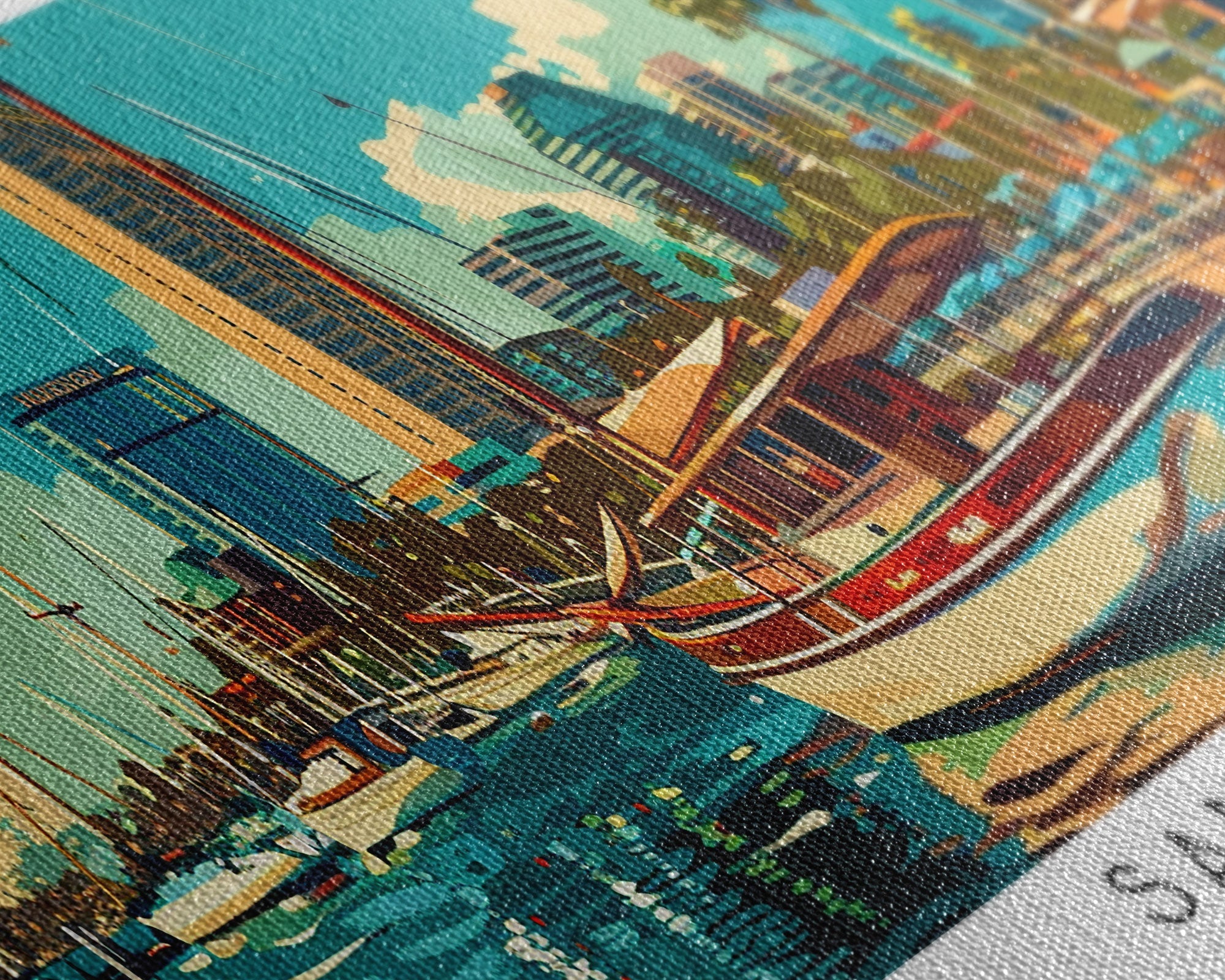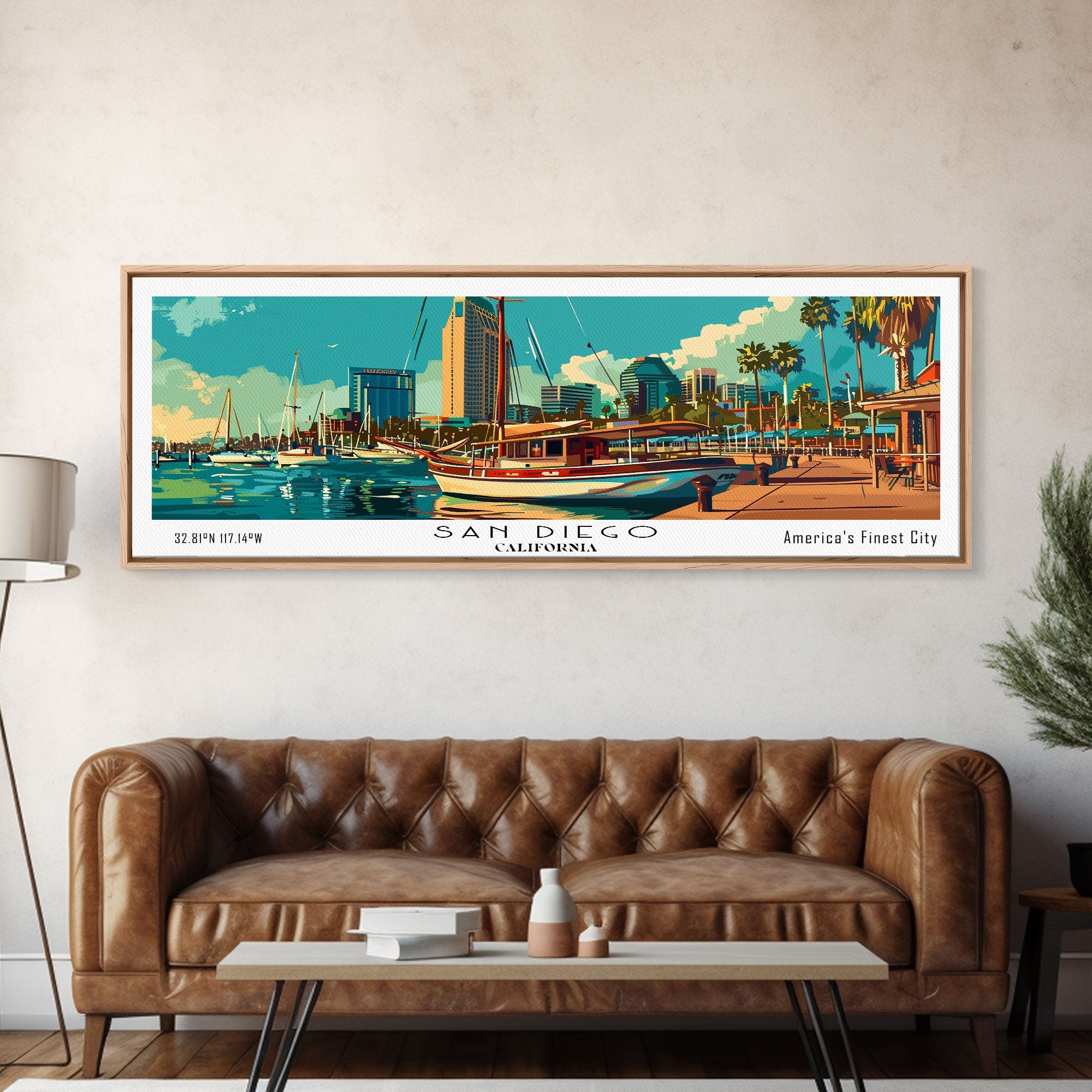 San Diego California Panoramic Painting, Retro Style Framed Canvas Print, Mid Century Modern Wall Art, Pop Art Travel Poster