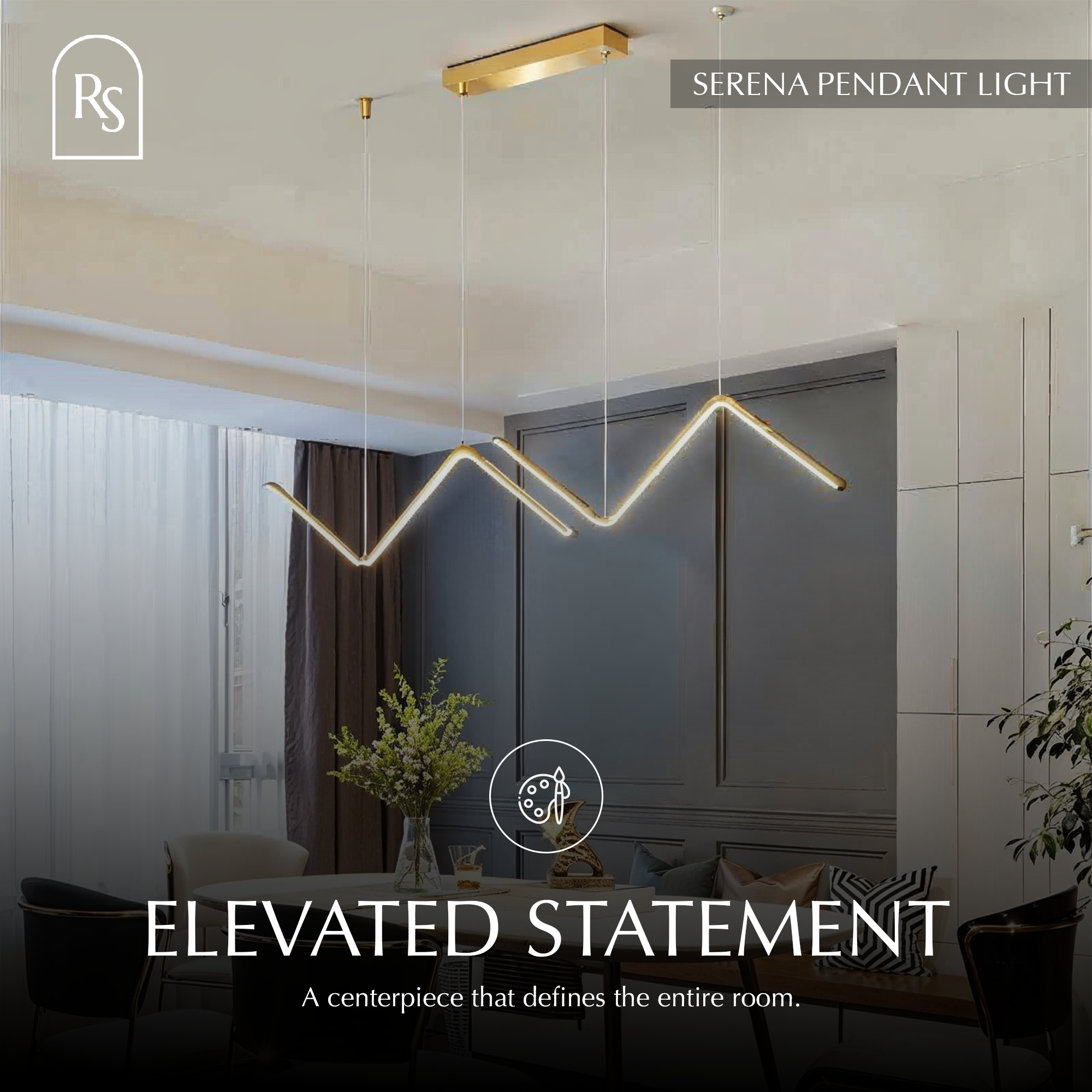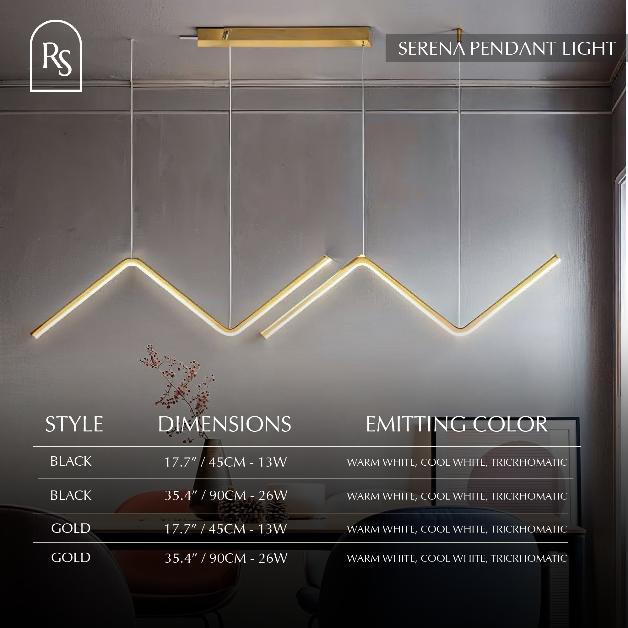 Serena Pendant Light' sleek and captivating zig-zag design commands attention, becoming the centerpiece of any room. With a touch-sensitive sensor, this LED pendant light offers convenient control from your mobile devices. From the bedroom to the kitchen, office, or restaurant, the Serena Pendant Light adds a touch of sophistication and charm to every corner, redefining your lighting experience.