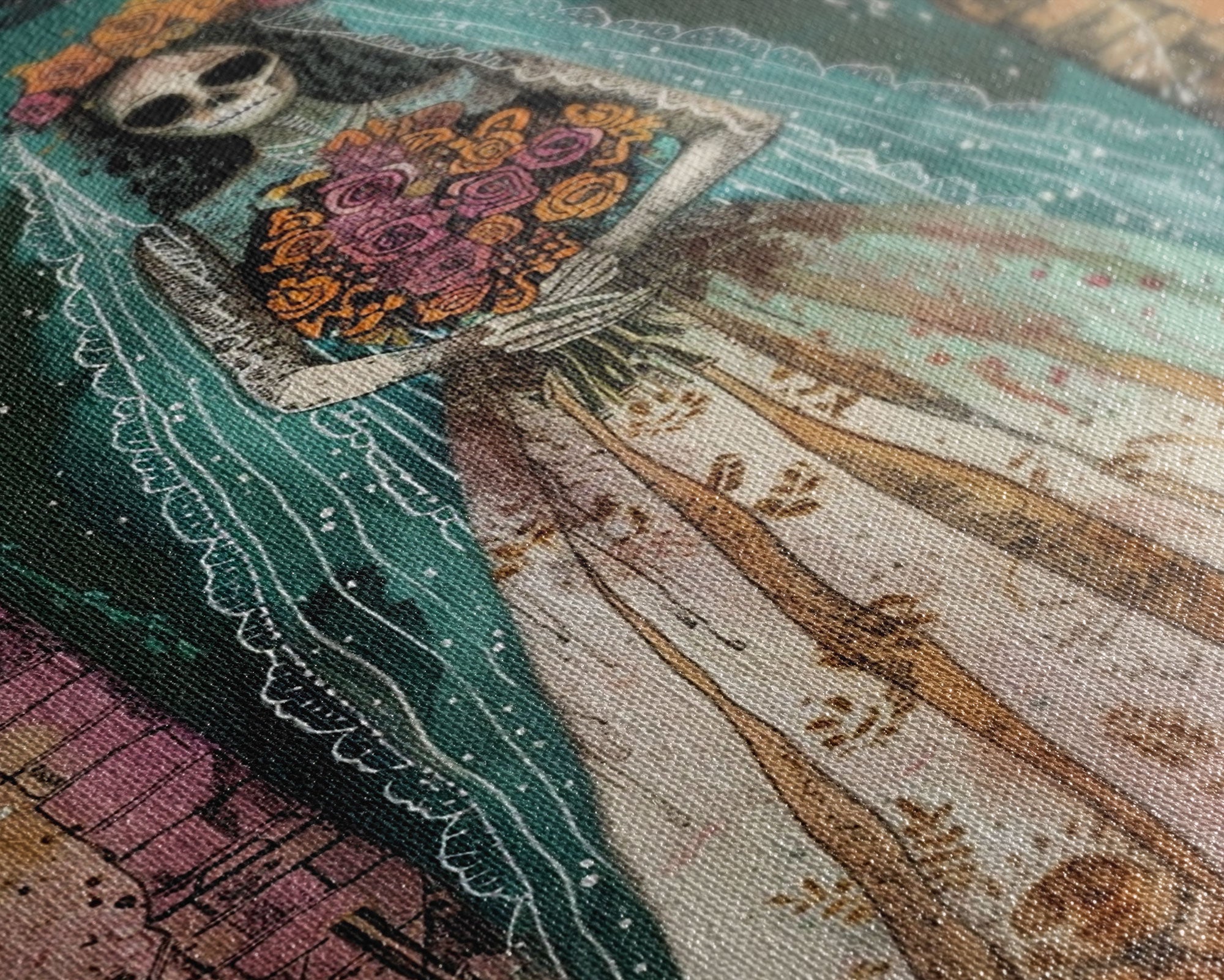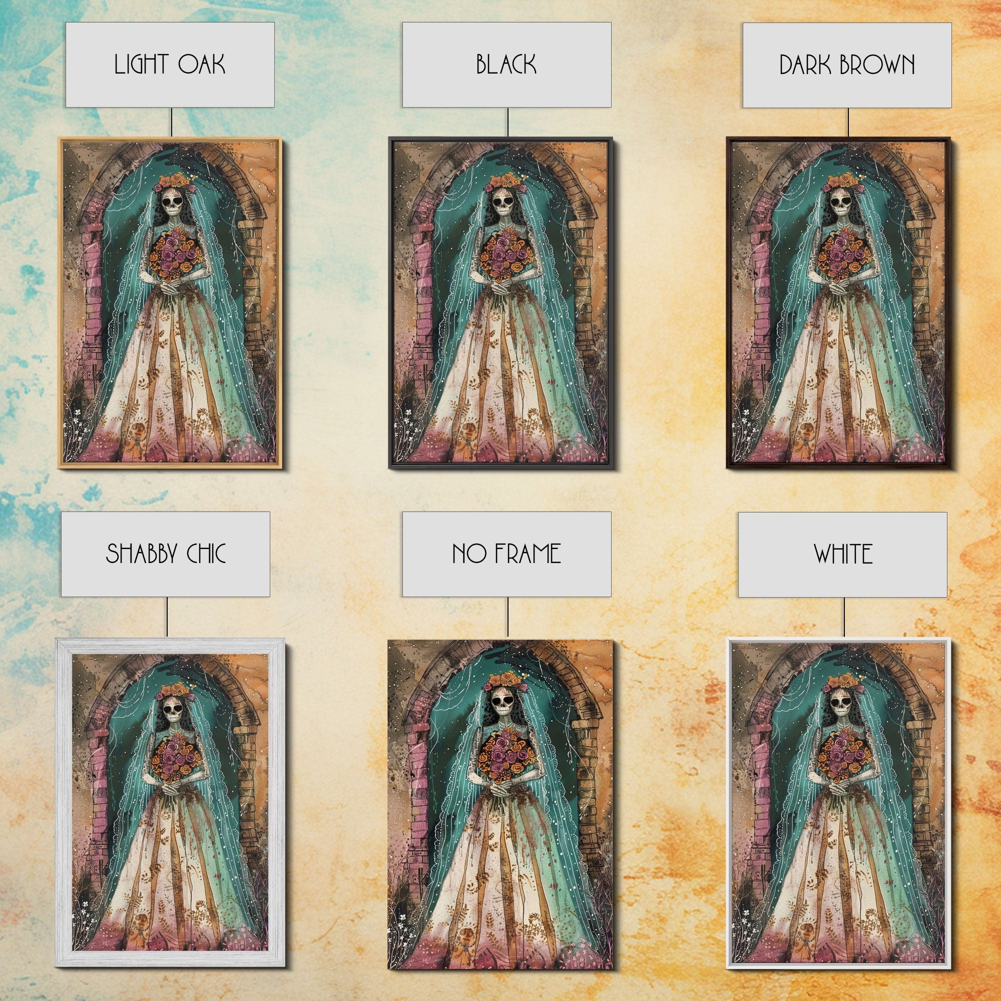 Skeleton Bride in Floral Arch Framed Canvas Print | Halloween Bride Art | Spooky Bride Decor for Home | Gothic Wedding Artwork