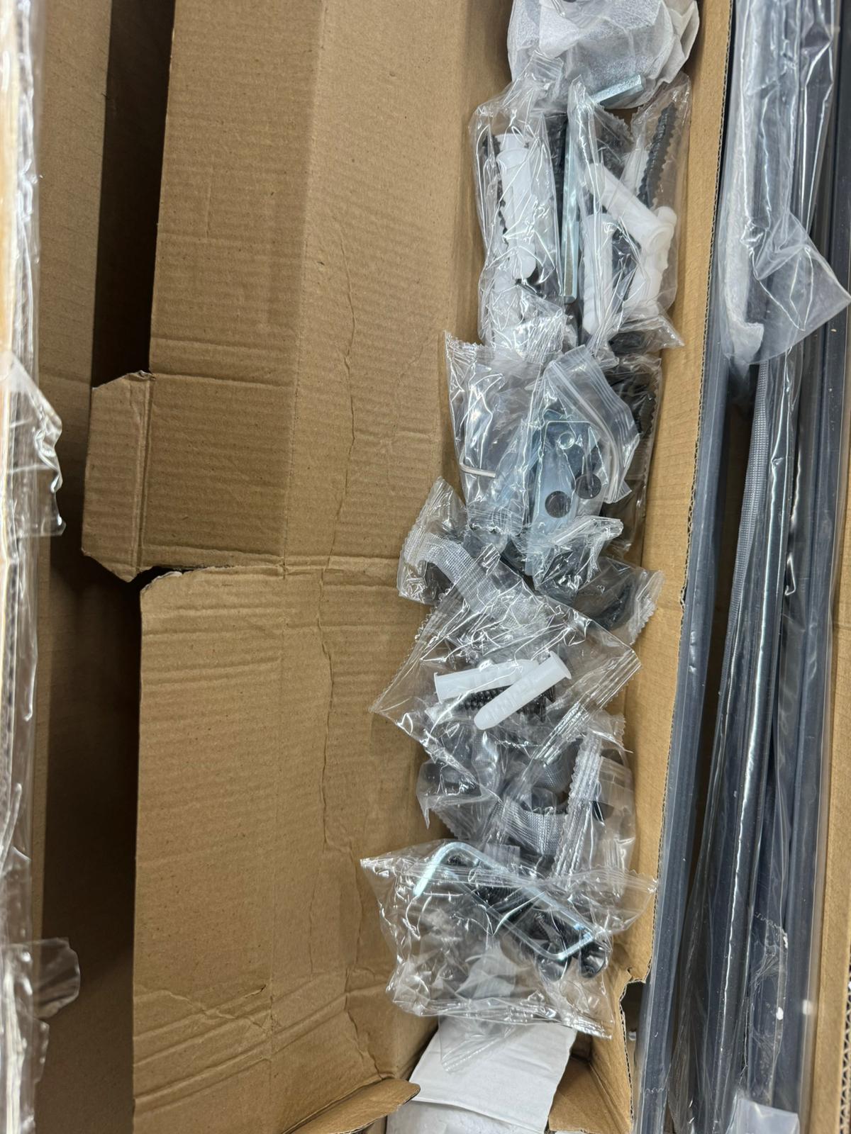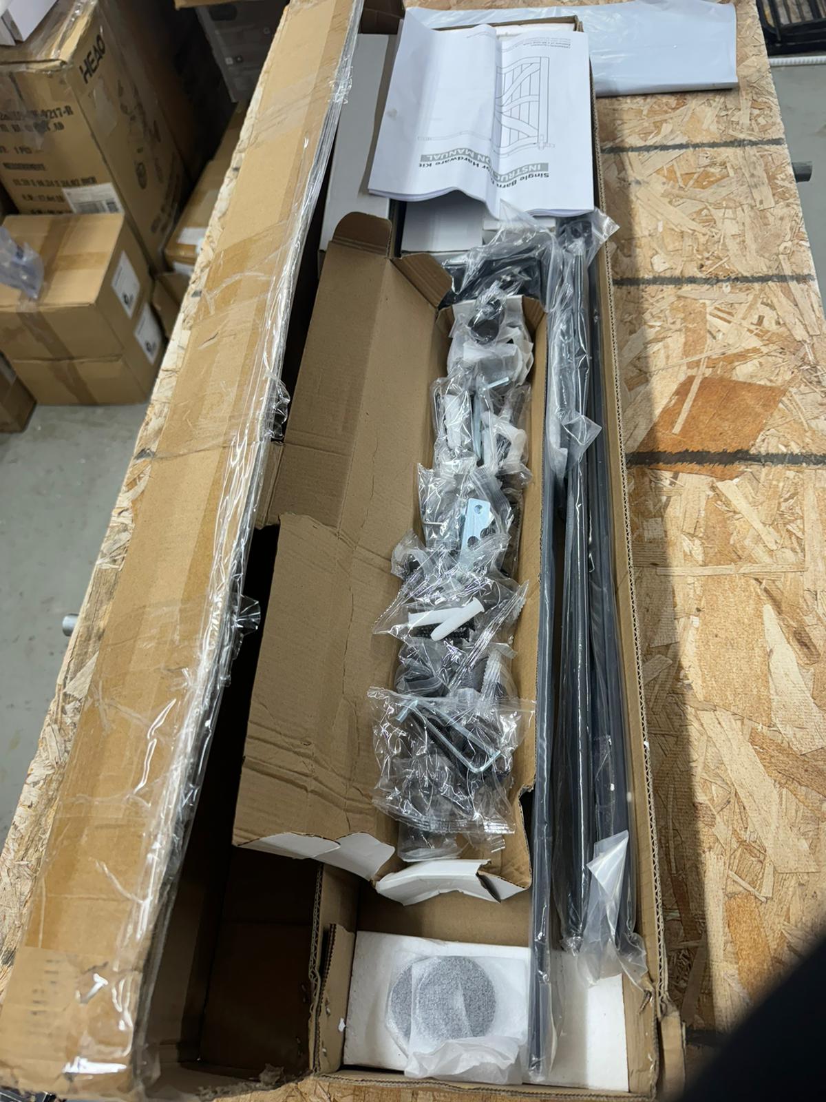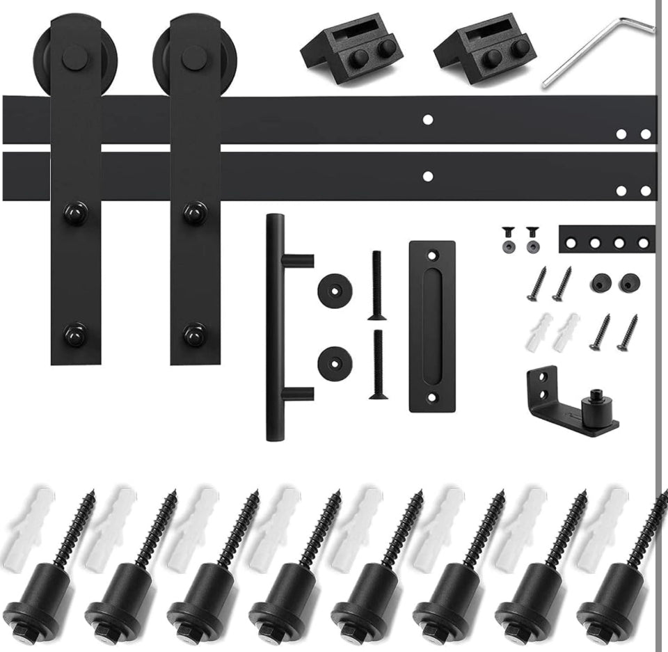 [Package Included]: A Barn Door Hardware Kit (4pcs Rails, 1x Handle and Pull, 1x Roller Floor Guide, 1x Connector, 8x Rail Spacers, 2x Rollers, 2x Door Stops, 2x End Caps, 1x Floor Guide ,1x Hex Key; All other necessary hardware is included as you see in the pictures. For 16 inch stud.)(DOOR NOT INCLUDED.)
