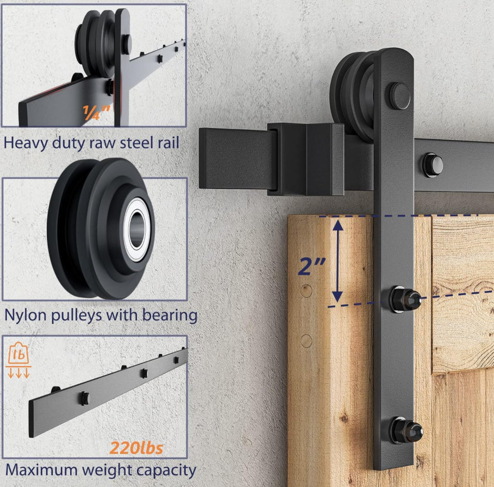 [Heavy Duty Barn Door Hardware Kit]: Barn door track is made of high quality Aluminium alloy m aterial, is more sturdy and durable. The nylon roller has undergone 100,000 tests and slides smoothly and quietly.(DOOR NOT INCLUDED.)