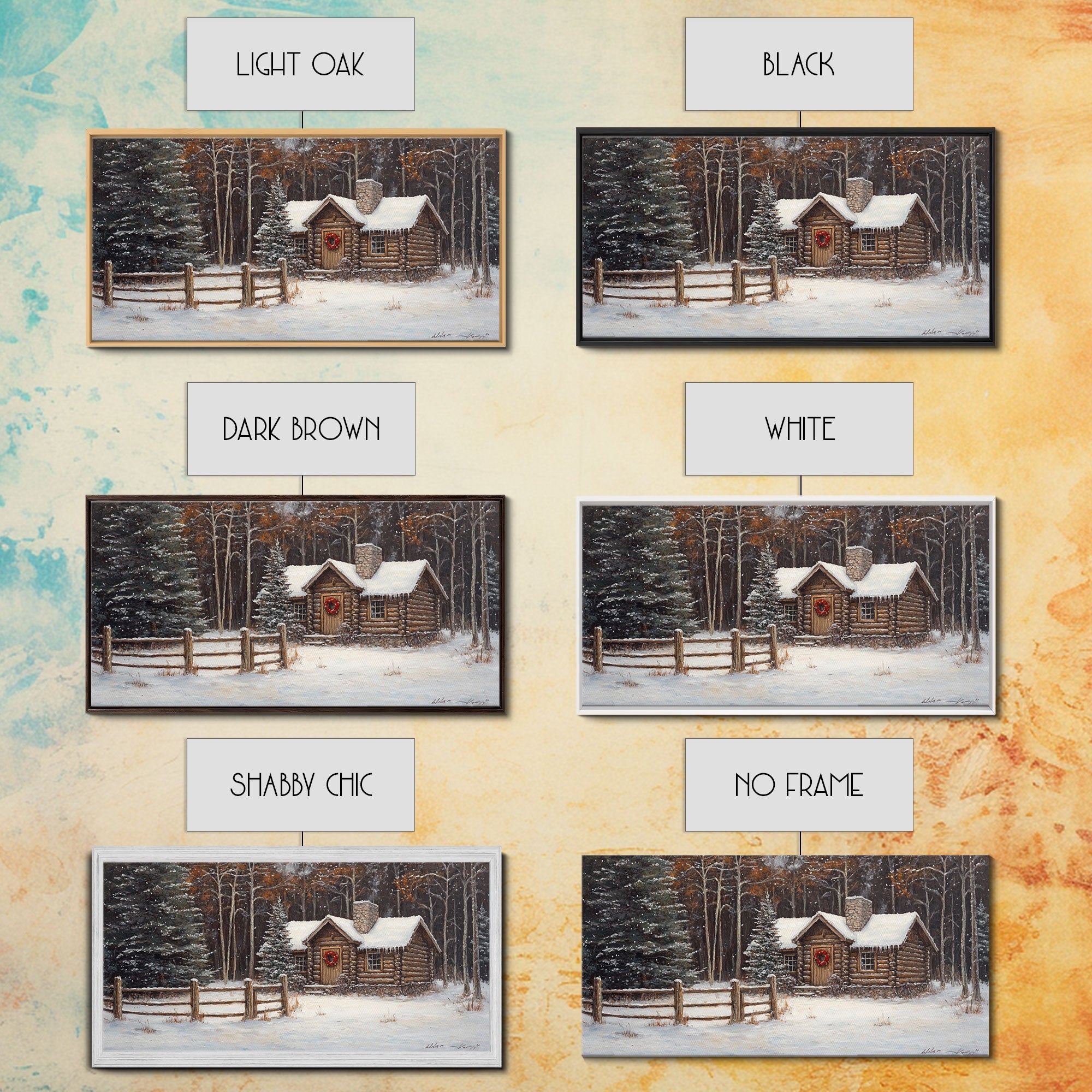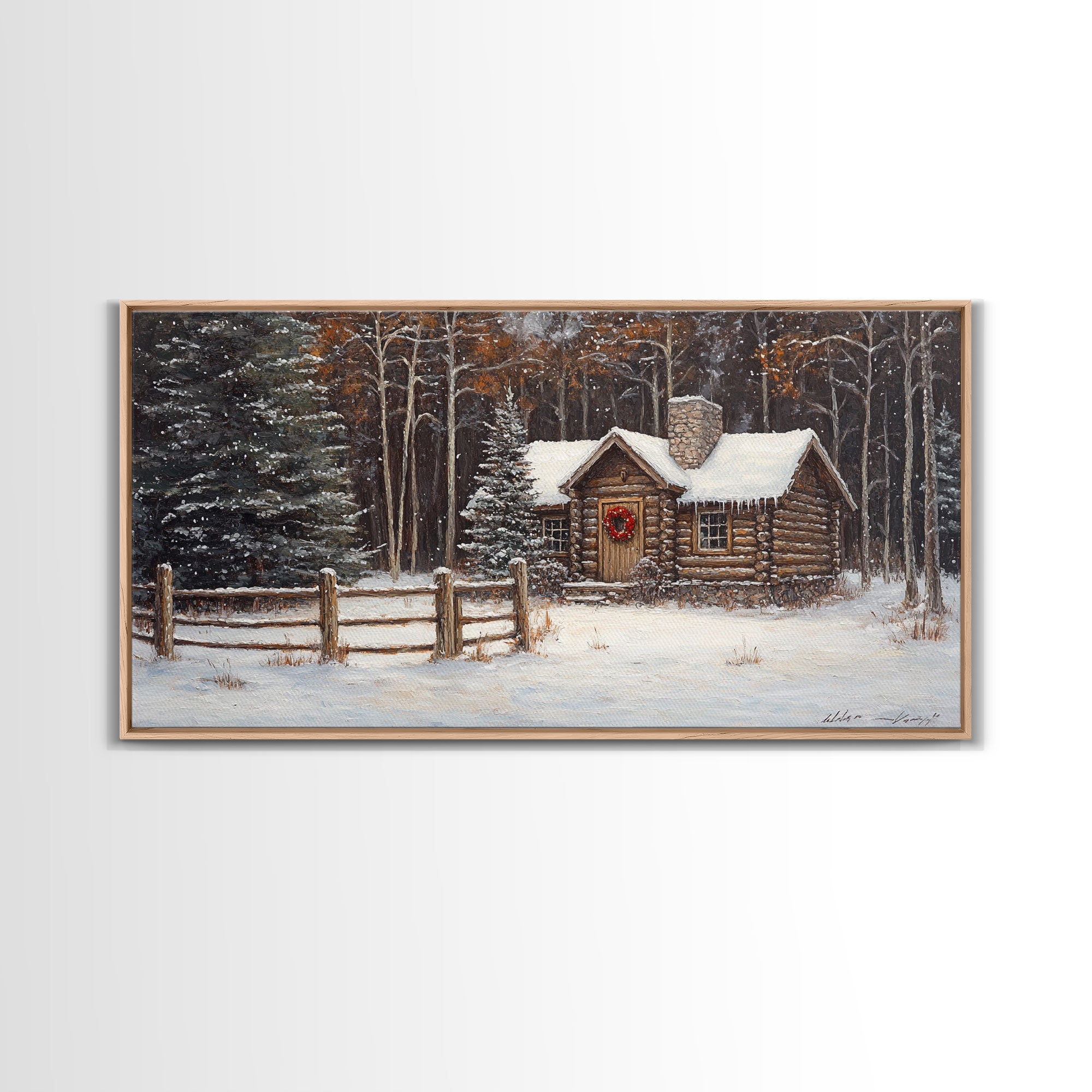 Snowy Log Cabin Christmas Framed Canvas Print, Rustic Winter Wonderland Art, Cozy Holiday Decor, Best Gift Christmas Wall Art