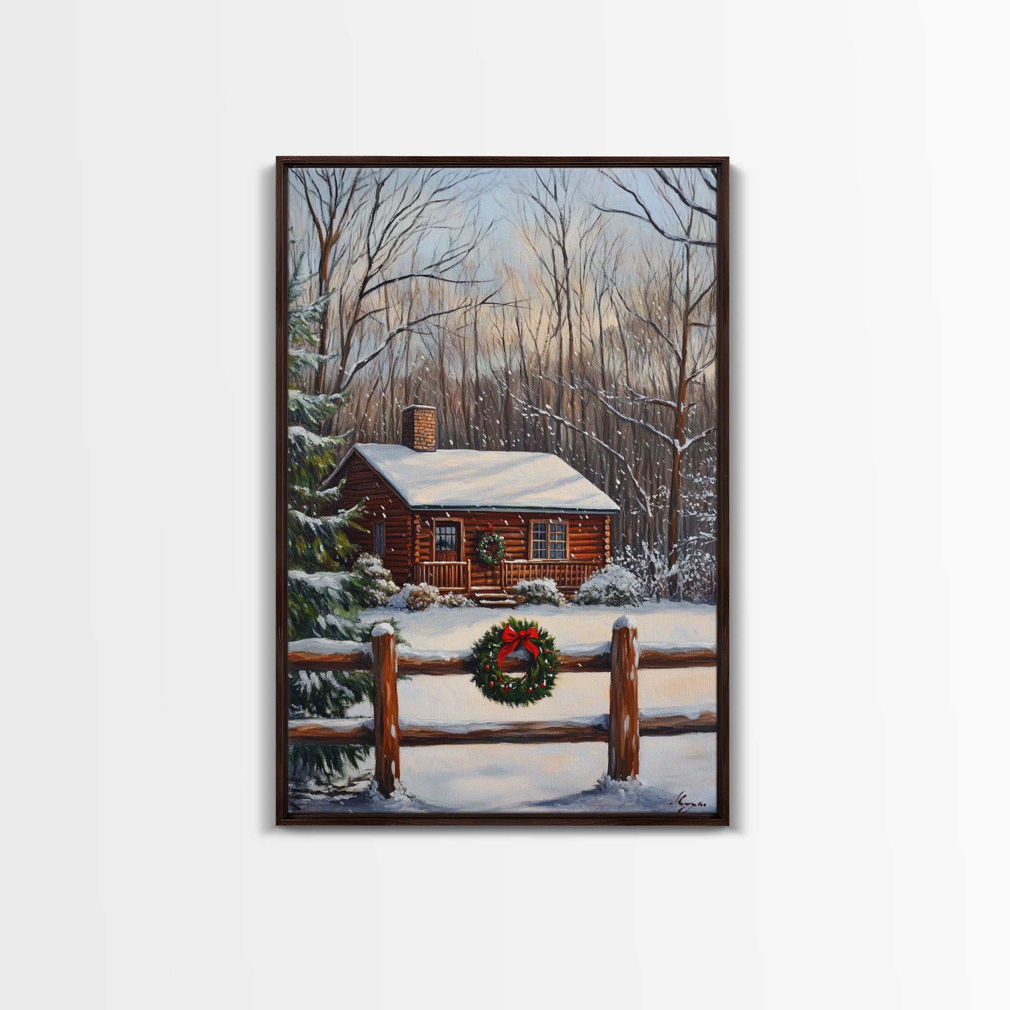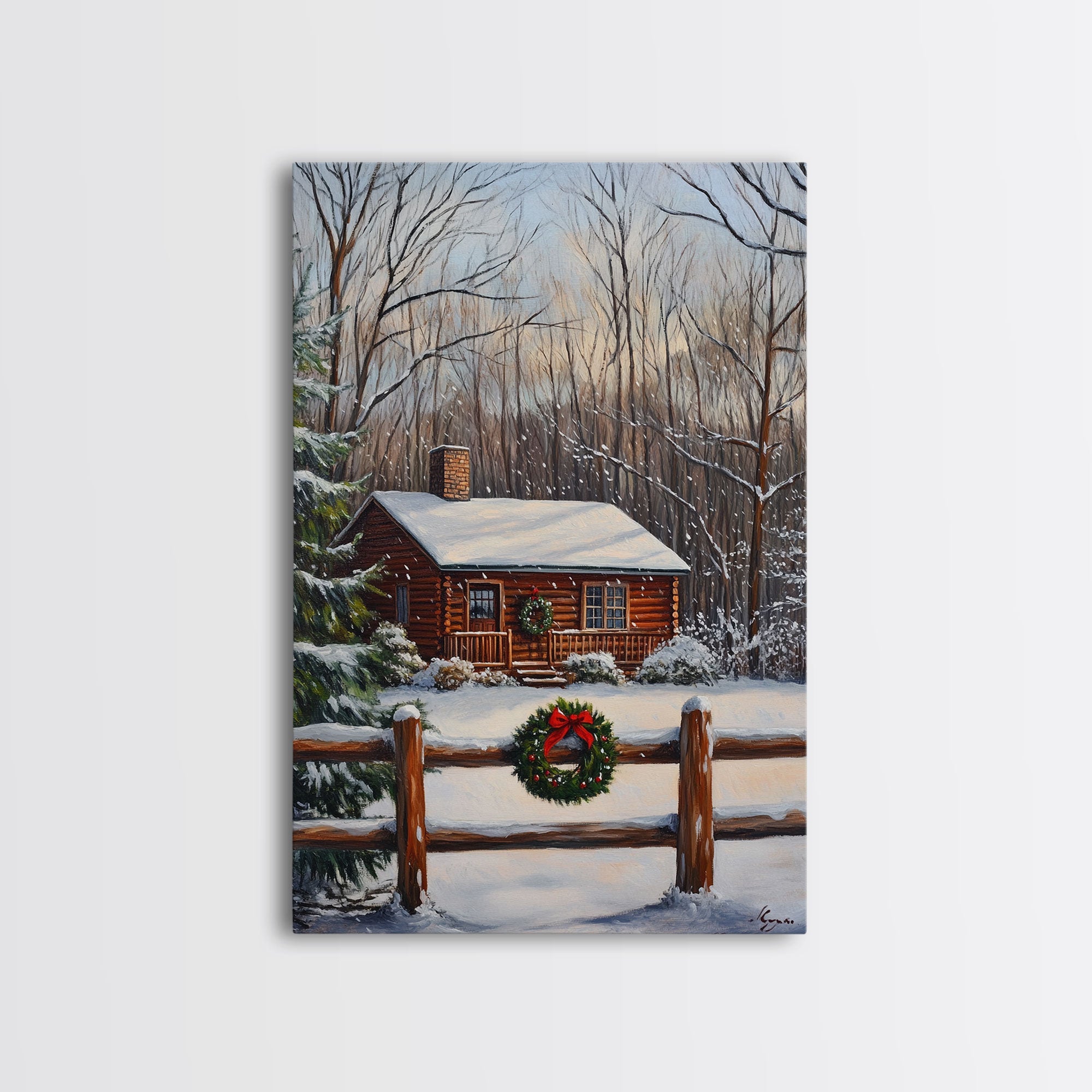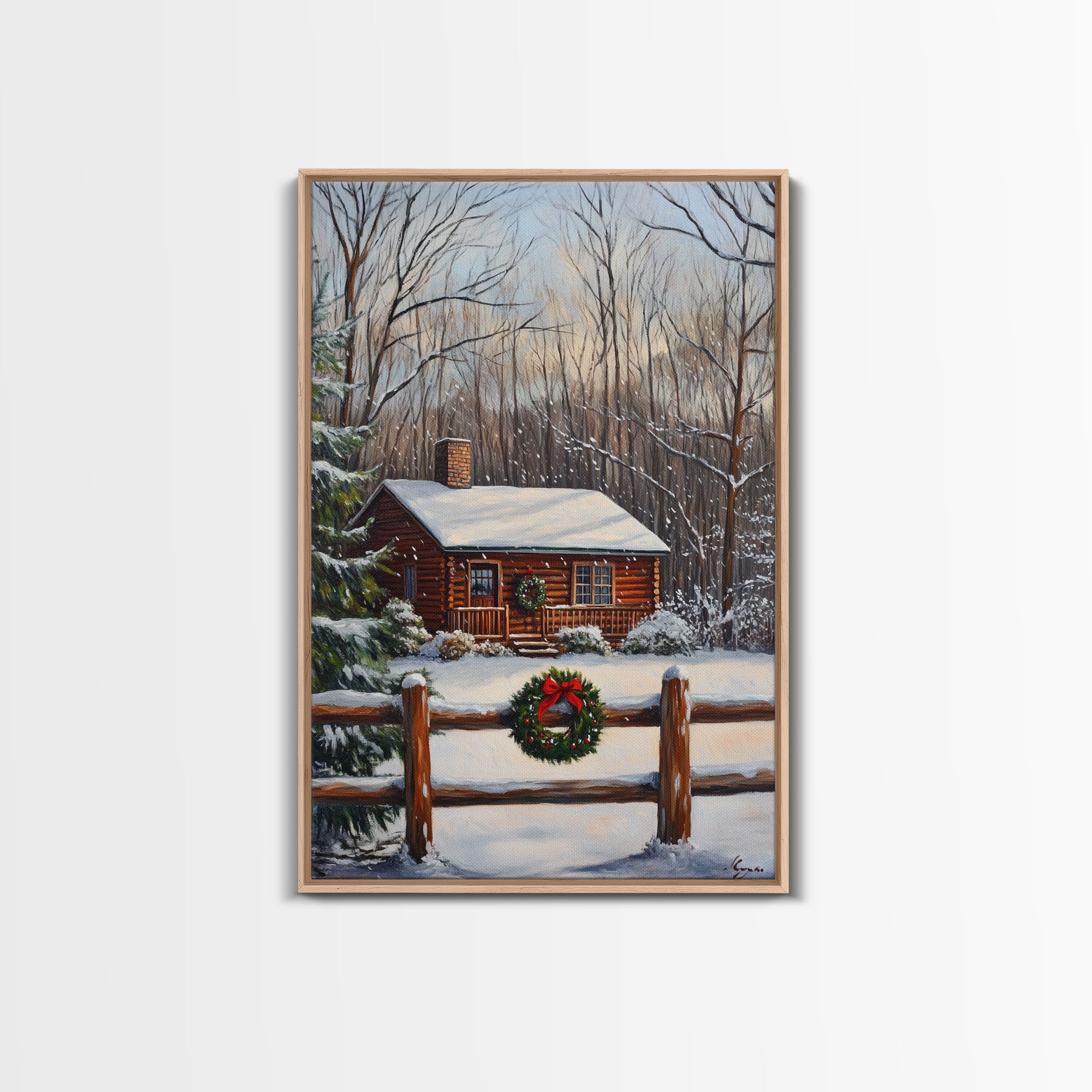 • Load image into Gallery viewer, Snowy Log Cabin With Wreath And Fence Framed Canvas Print Rustic Winter Scene With Cozy Cabin In Snow Perfect Christmas Home Decor Wall Art