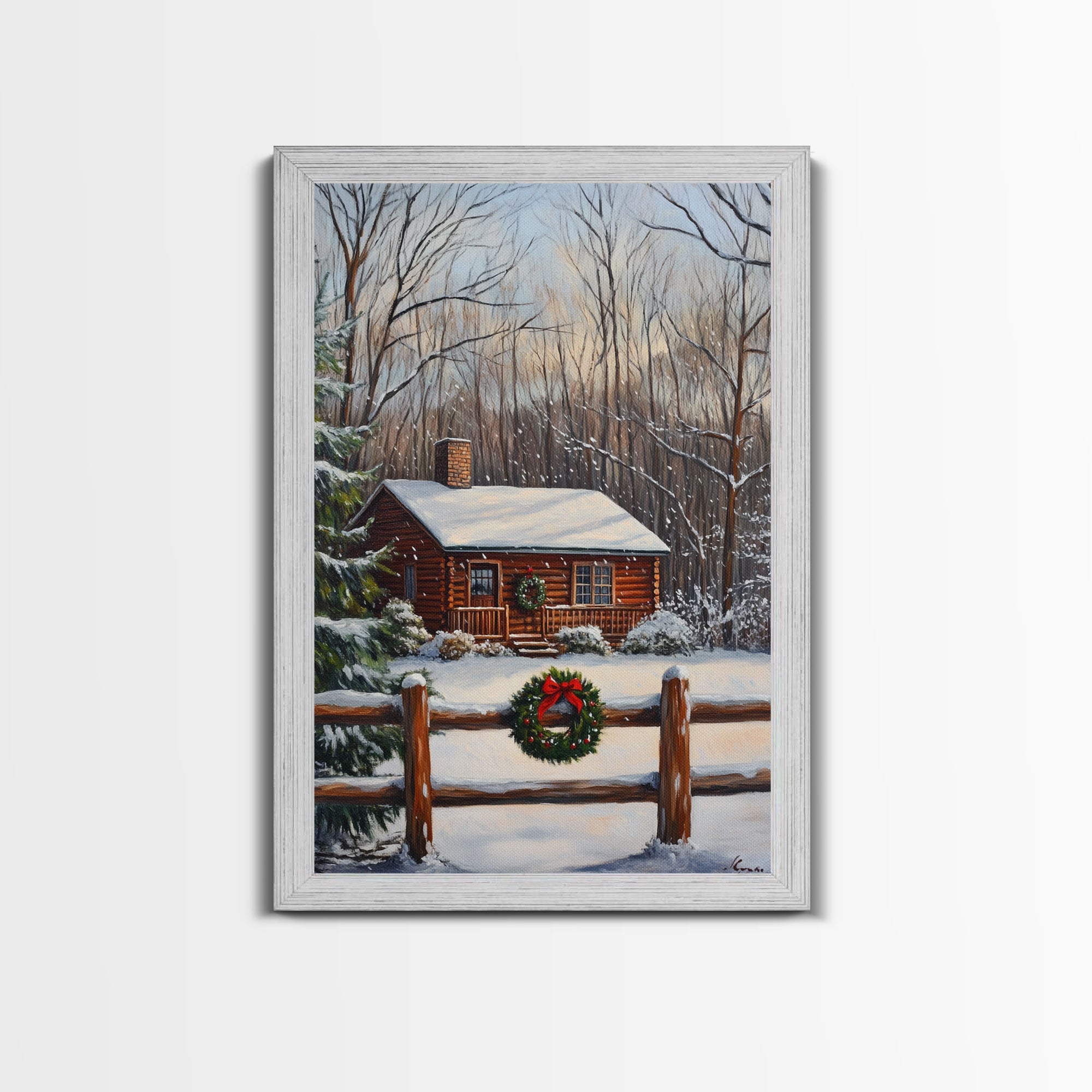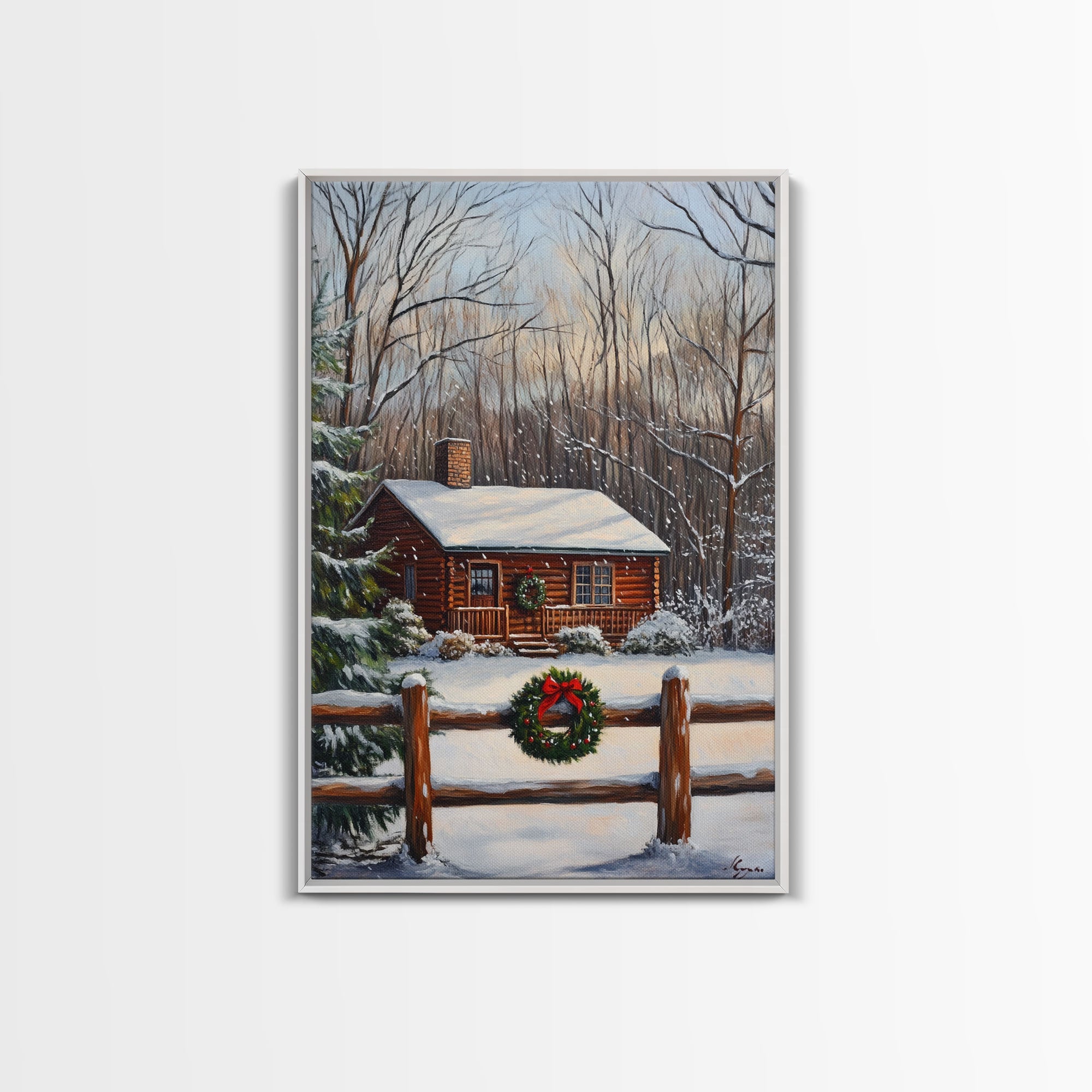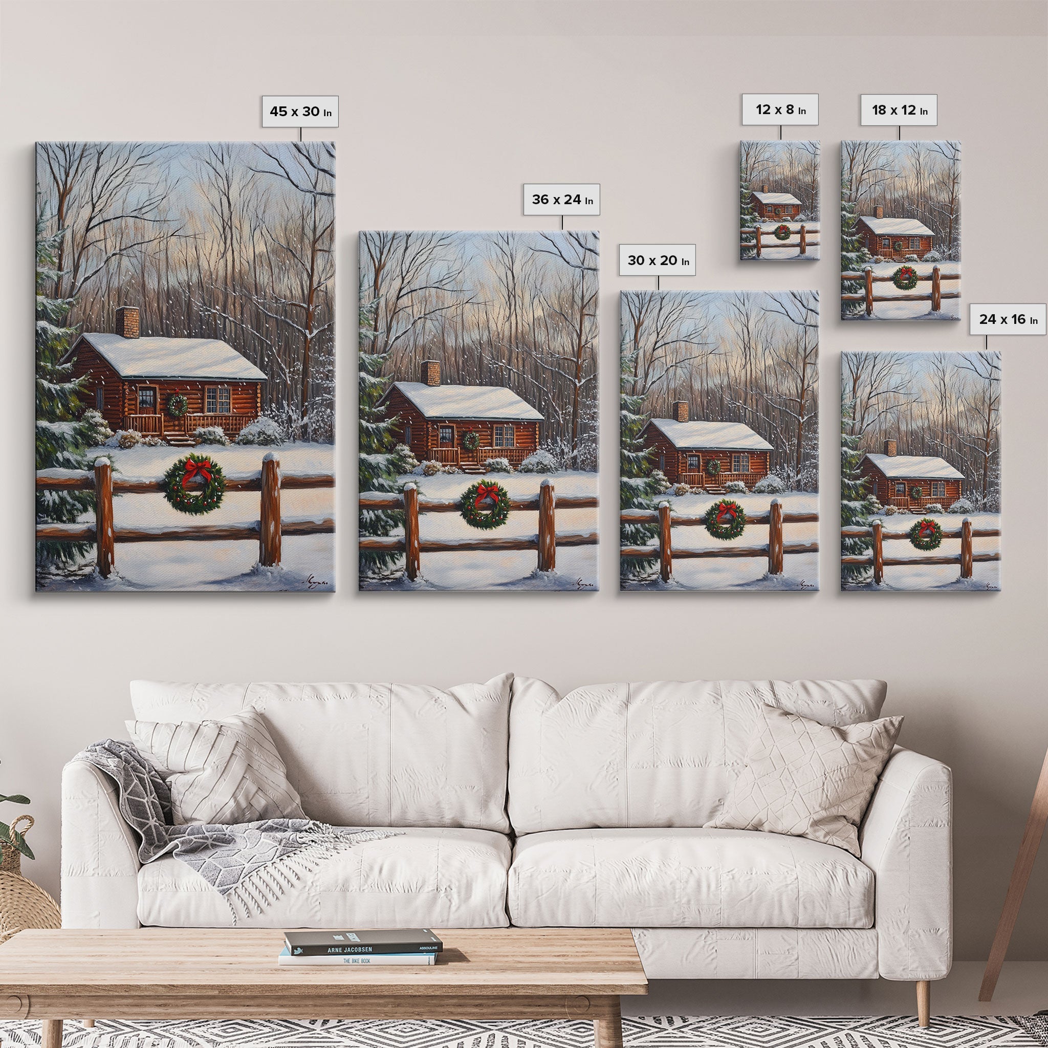 • Load image into Gallery viewer, Snowy Log Cabin With Wreath And Fence Framed Canvas Print Rustic Winter Scene With Cozy Cabin In Snow Perfect Christmas Home Decor Wall Art