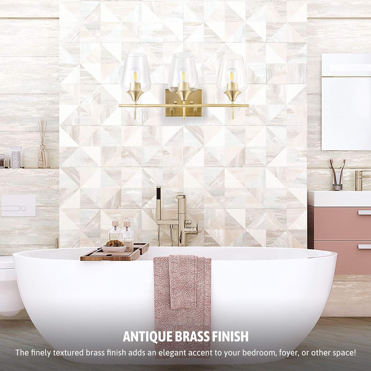 About this item UNIQUE MODERN STYLE: This Vonluce 3-light bathroom vanity light features a trio of organic wine-glass shades twinned with the clean lines of a modern gold backplate, blending well with home decors from modern minimalist to rustic farmhouse LIGHT UP YOUR HOME: The sophisticated and elegant clear glass shade vanity light ensconce standard E26 60W light bulbs (not incl.) whose flattering ambient light will offer inviting warmth for your bedroom, living room, entryway, or other space REVERSIBLE MOUNTING: These bathroom light fixtures can be installed with their glass shades facing upwards or downwards to suit your lighting needs INSTALLS IN MINUTES: Once your home's wiring is ready, this vanity light fixture installs quickly thanks to its simple design and clear instructions.