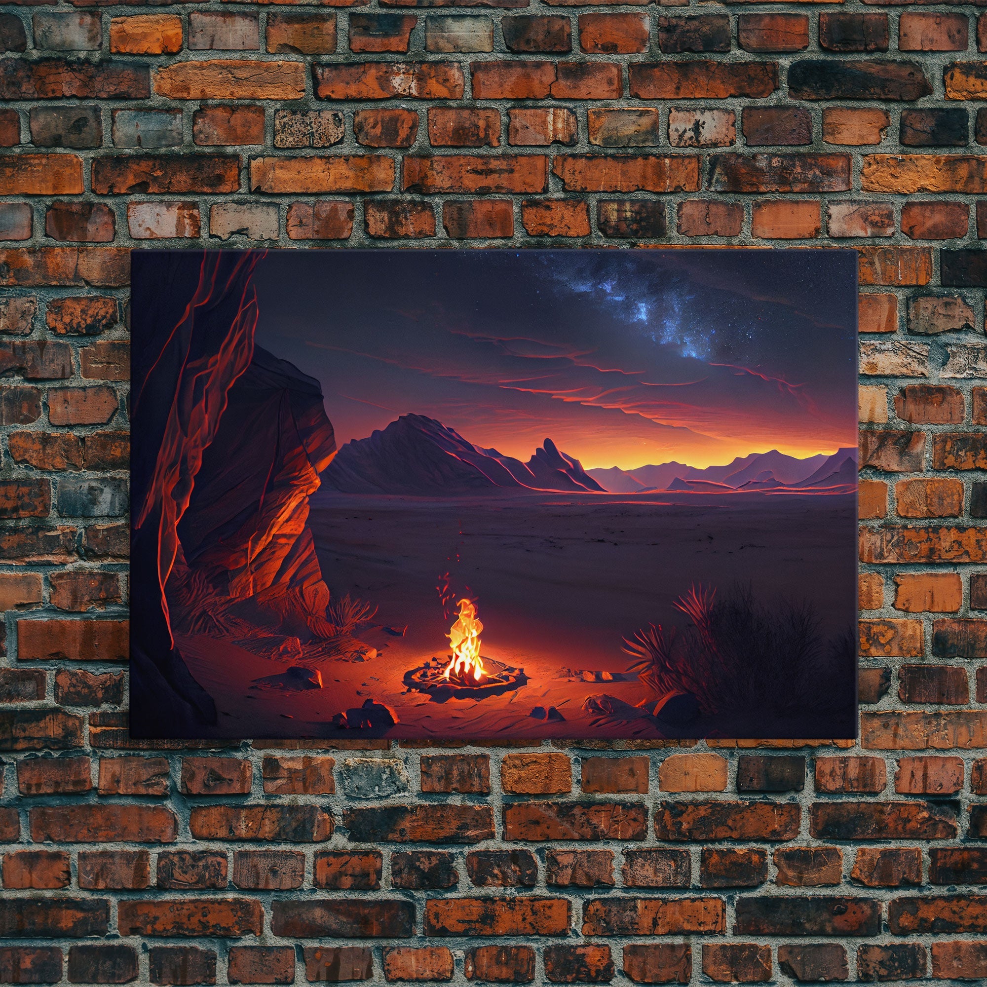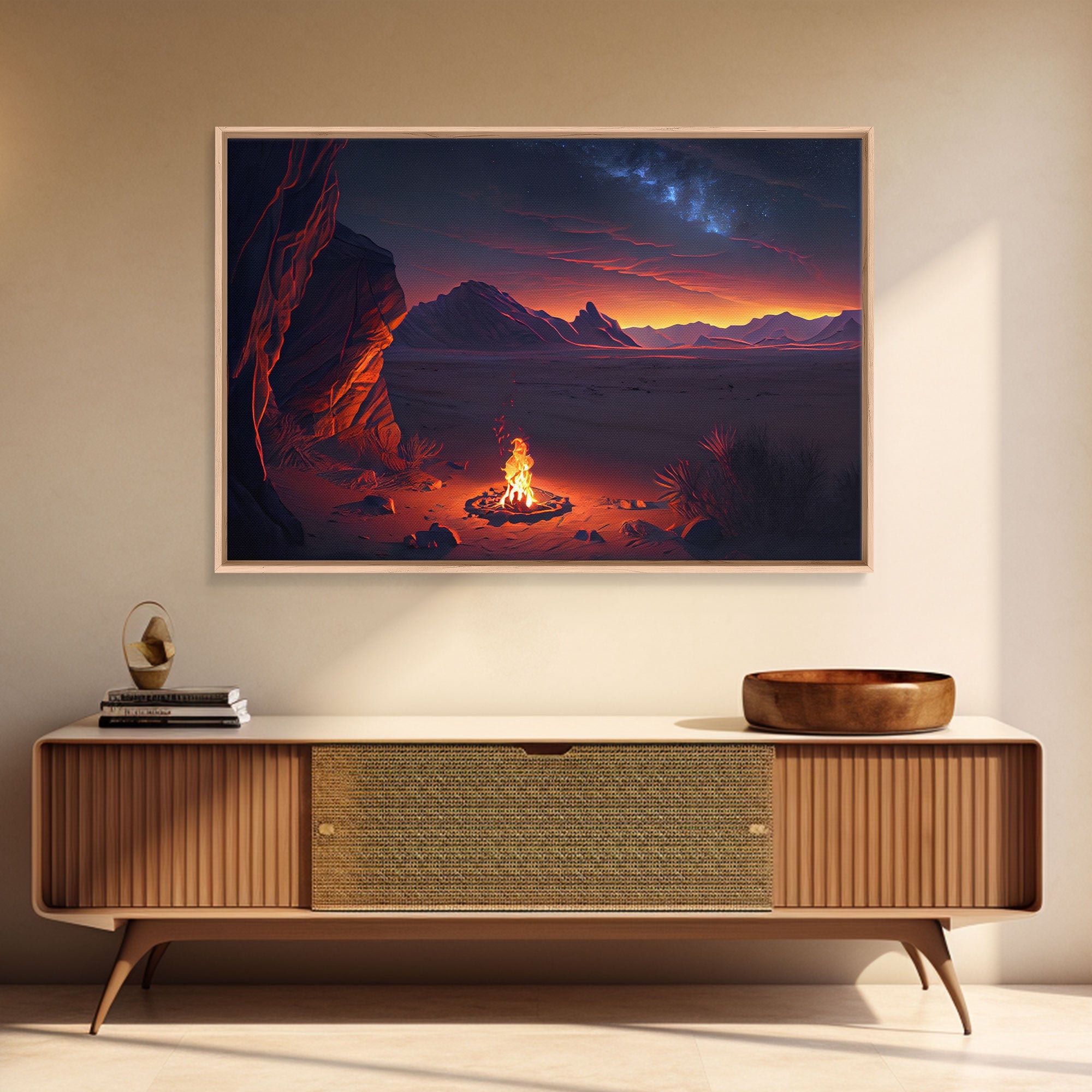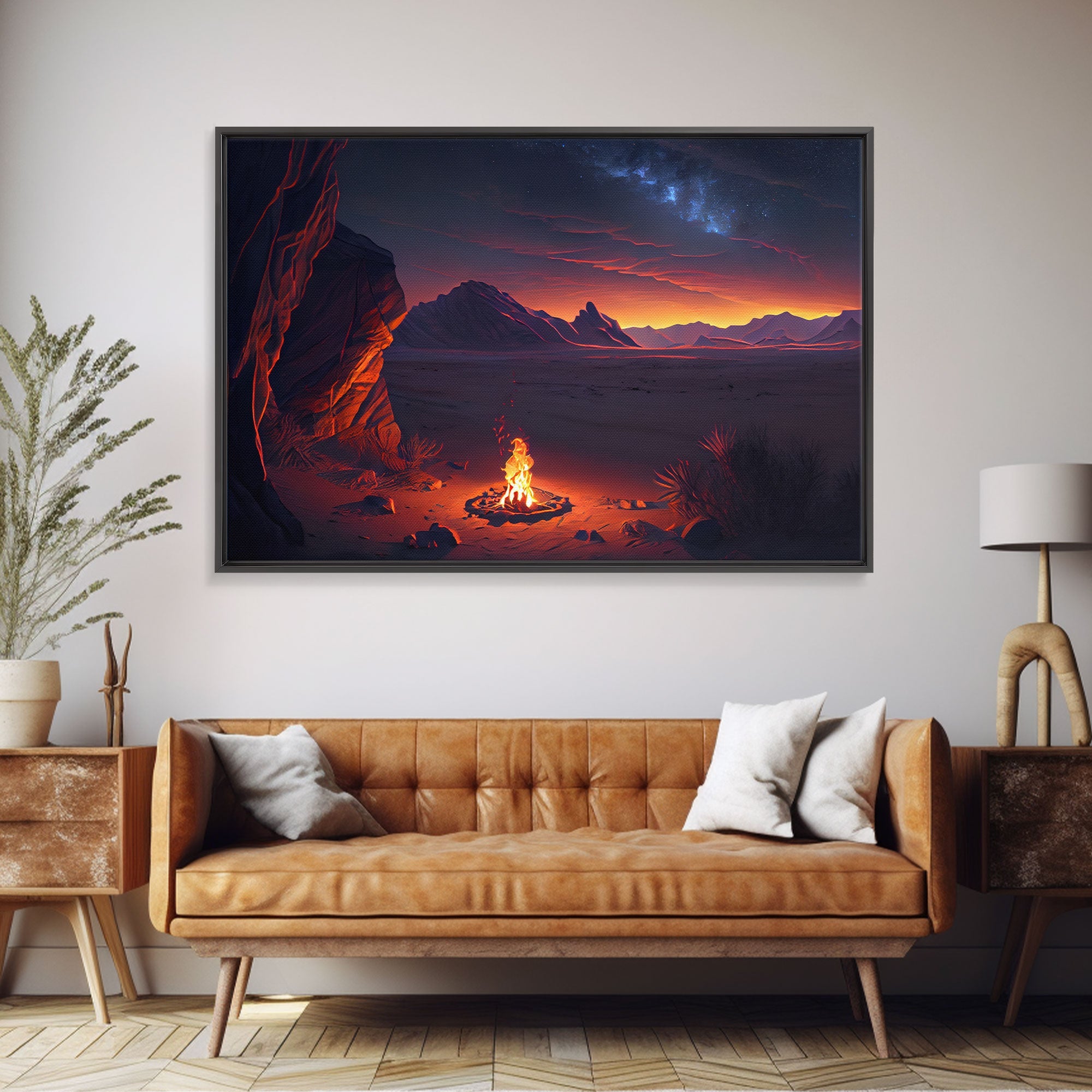 Watercolor of a prehistoric campfire, primitive art, framed canvas print