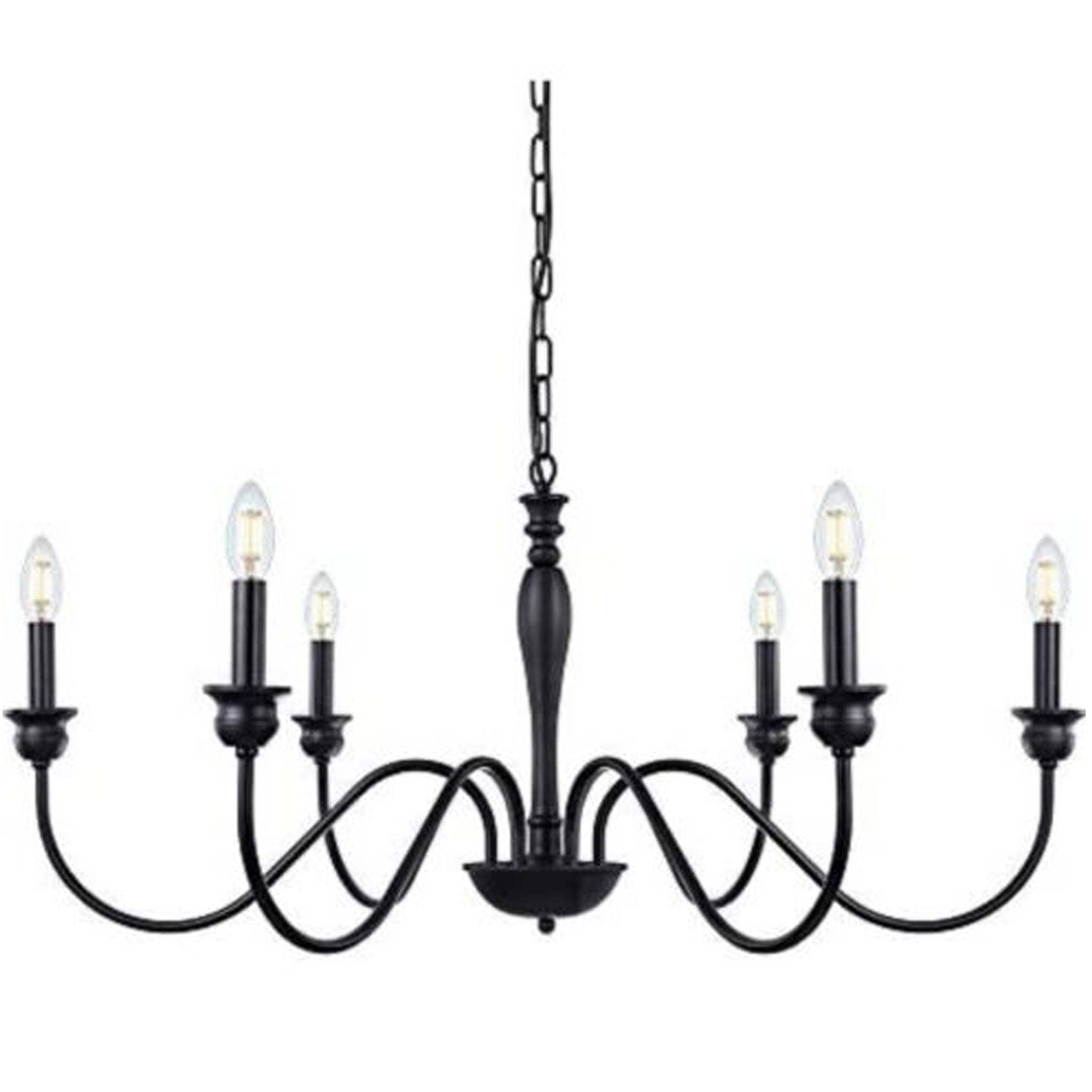 - Classic Fashion Chandeliers: Crafted of iron in an black metal finish, features 6 candle-shaped stems placed on simply curved iron arms.simple and retro design, giving the country chandelier an elegant look. Suitable for a variety of styles of lighting, farmhouses, industrial, vintage, or contemporary