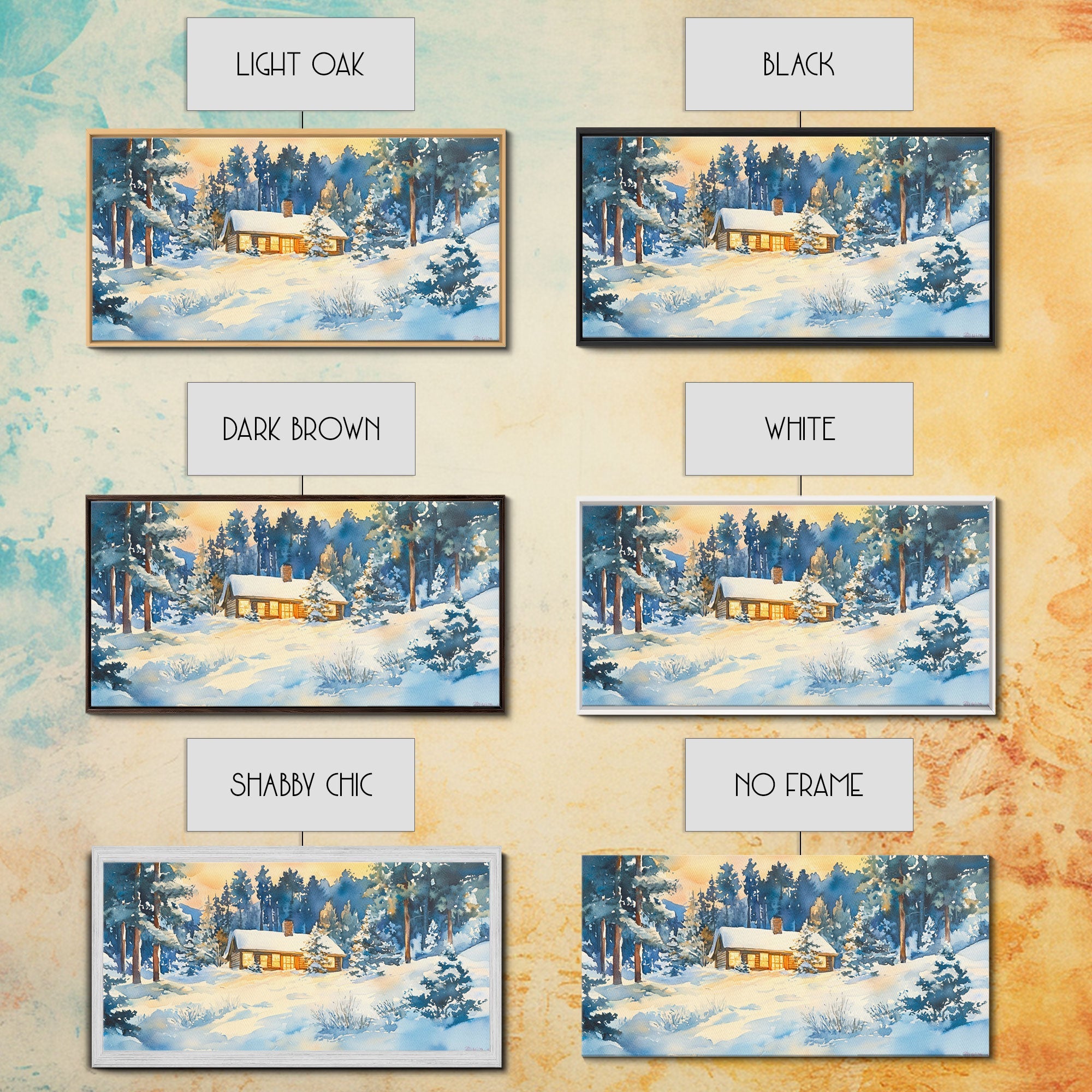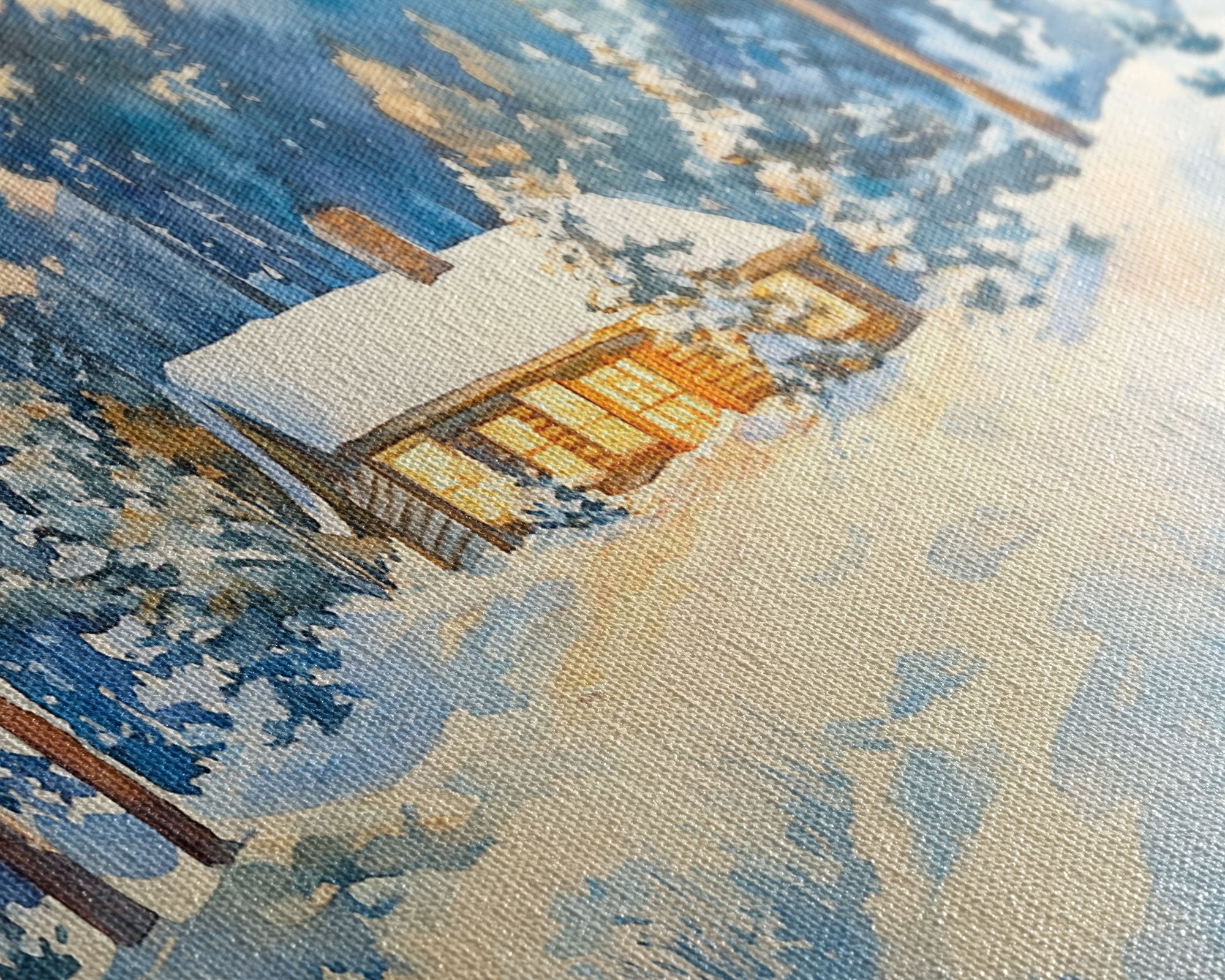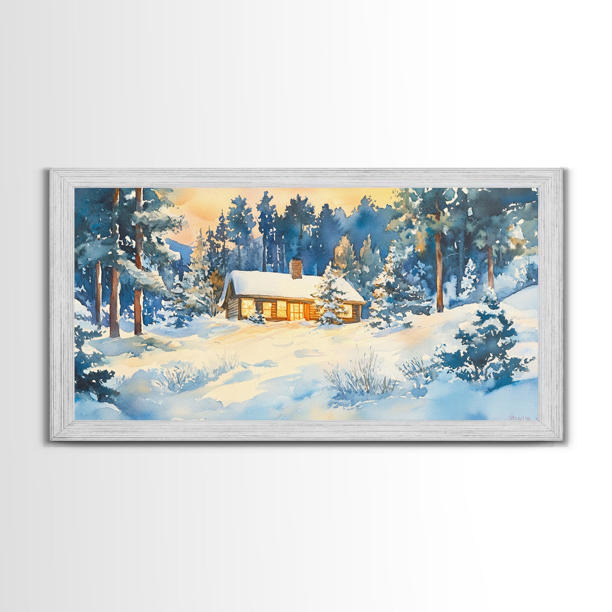 Winter cabin decor Framed Canvas Print snowy cabin and trees winter wonderland cozy holiday wall art gift idea Christmas home decor