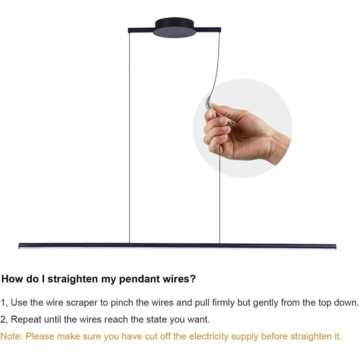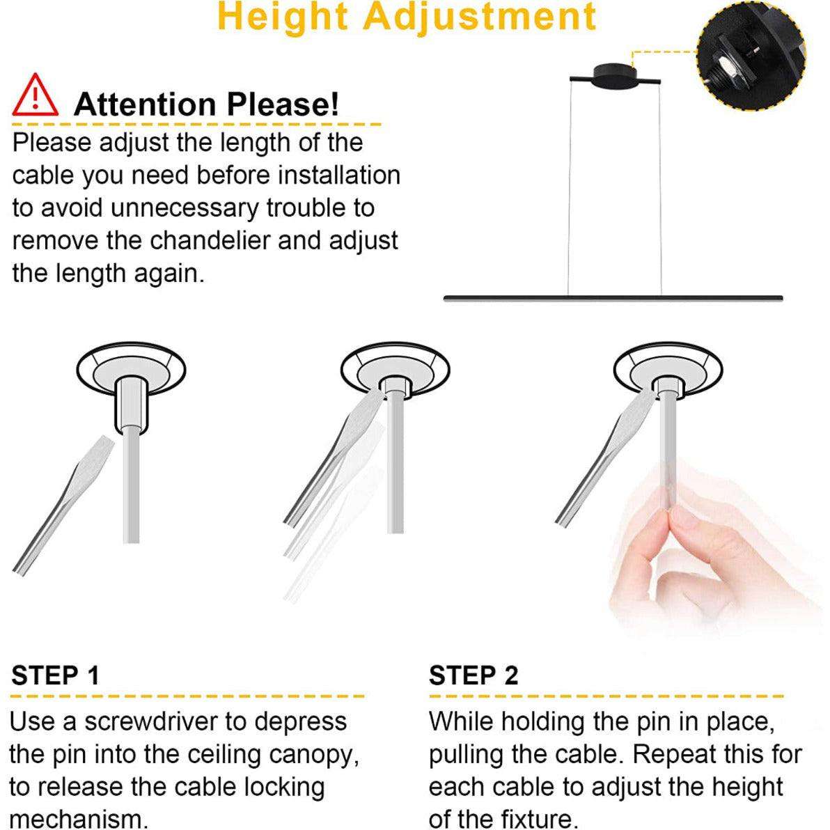 💡【ADJUSTABLE 】There have adjustable pins on the ceiling canopy and you can press them before installation to adjust the two strings on each side of the modern LED chandelier to the desired height. The maximum length of the strings is 118.11 inches. It can be assisted by a Plastic scraper to make the line straighter. Please note the use of careful strength, so as not to break the line.