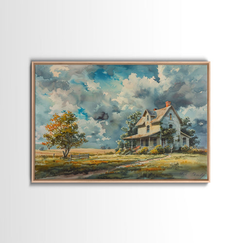 Beautiful Cottagecore Kitsch Framed Canvas Print Of An Old Farmhouse, Watercolor Painting, Custom Original Art, Living Room Decor