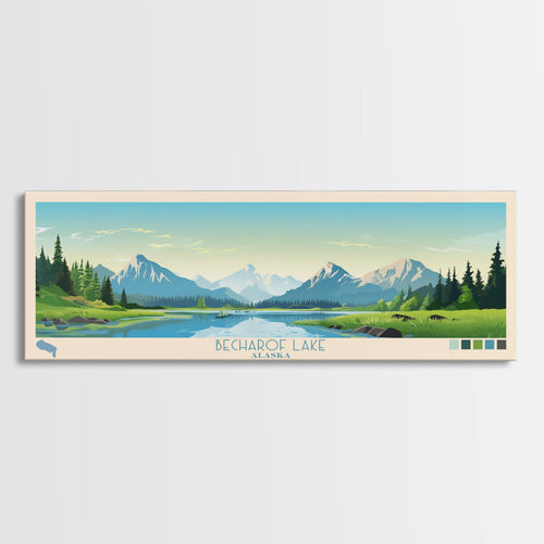 Becharof Lake Alaska Framed Canvas Print, Panoramic Travel Poster, Midcentury Modern Wall Art, Pop Art, Nature Bedroom Art, Living Room Decor