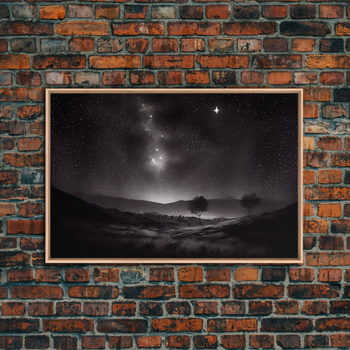 Black and white Watercolor of a starry night sky over the planes of Texas, framed canvas print