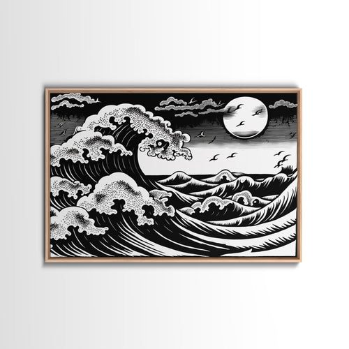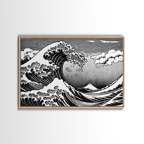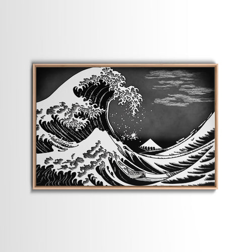 Black and White Tsunami Waves, Japanese Style Art, Framed Canvas Print, Ready To Hang Framed Wall Art, Living Room Wall Decor